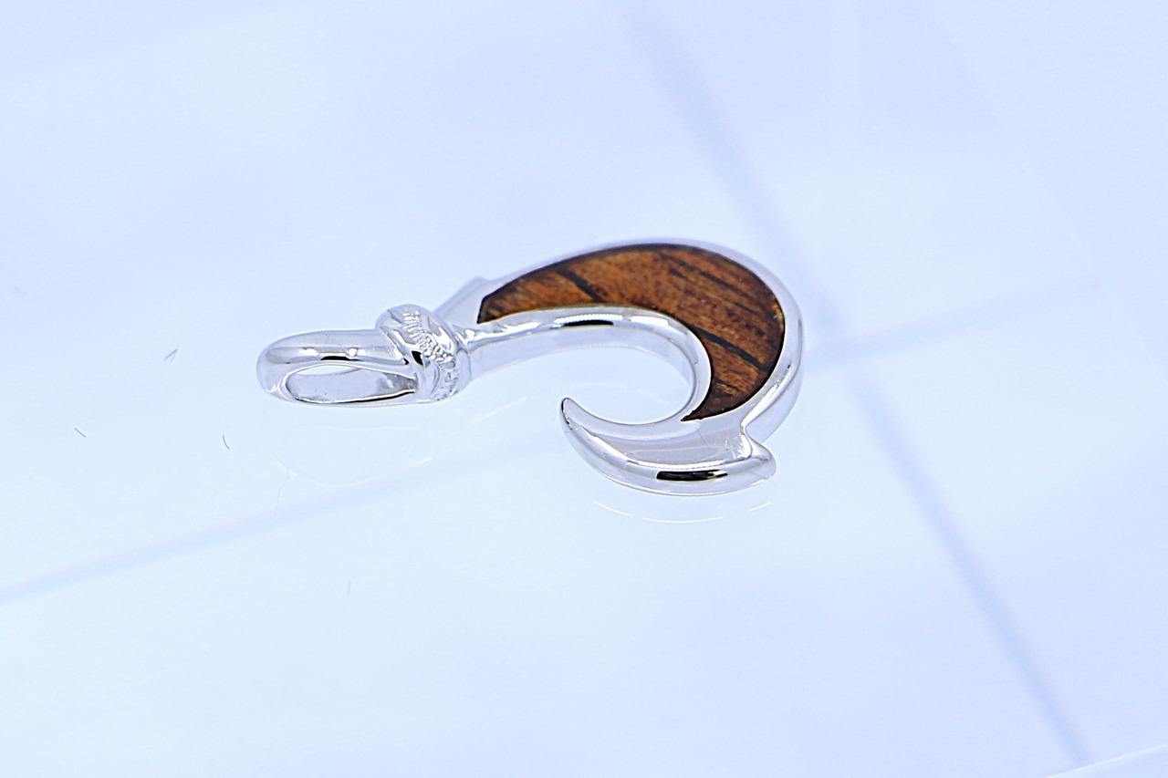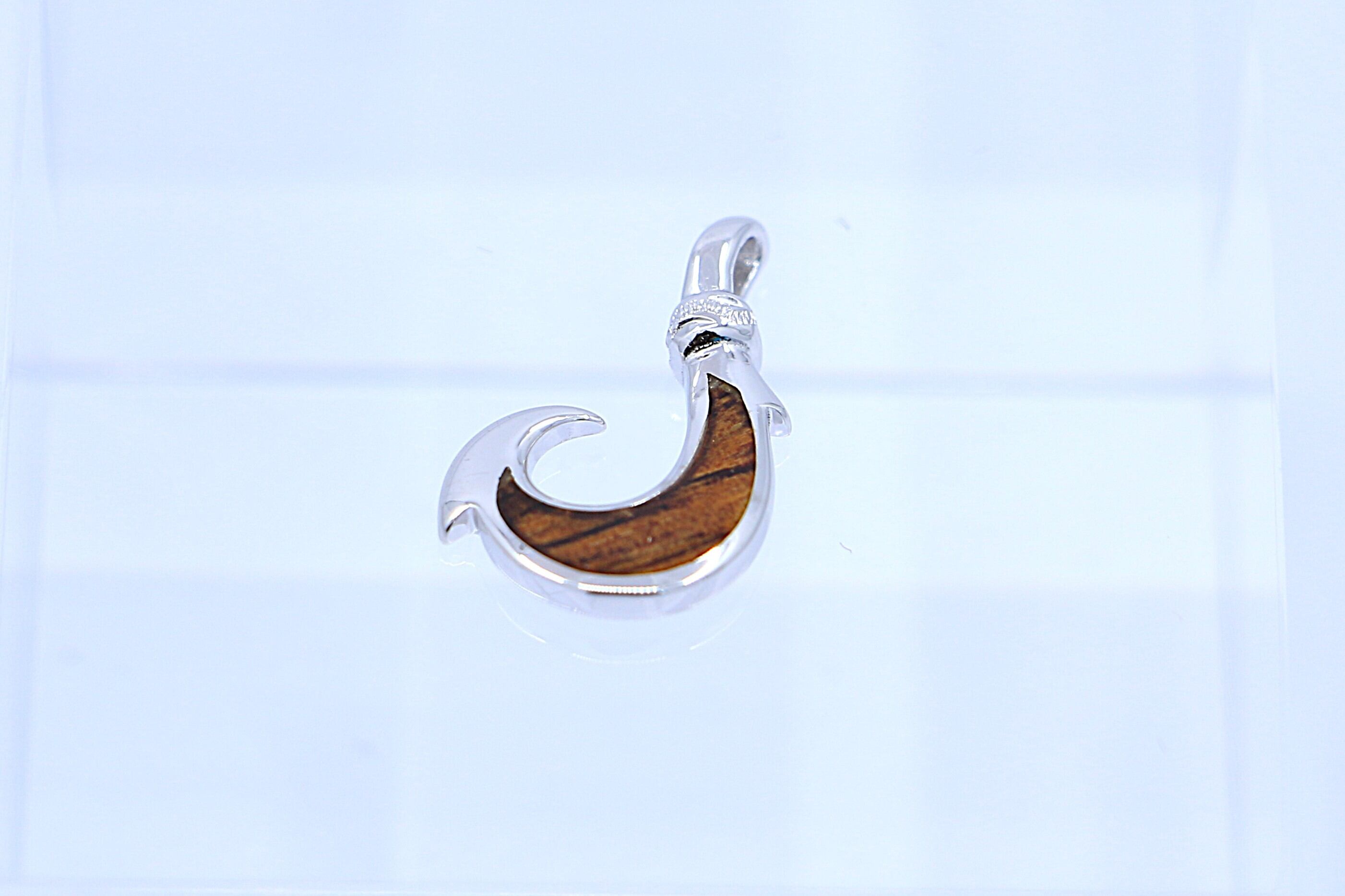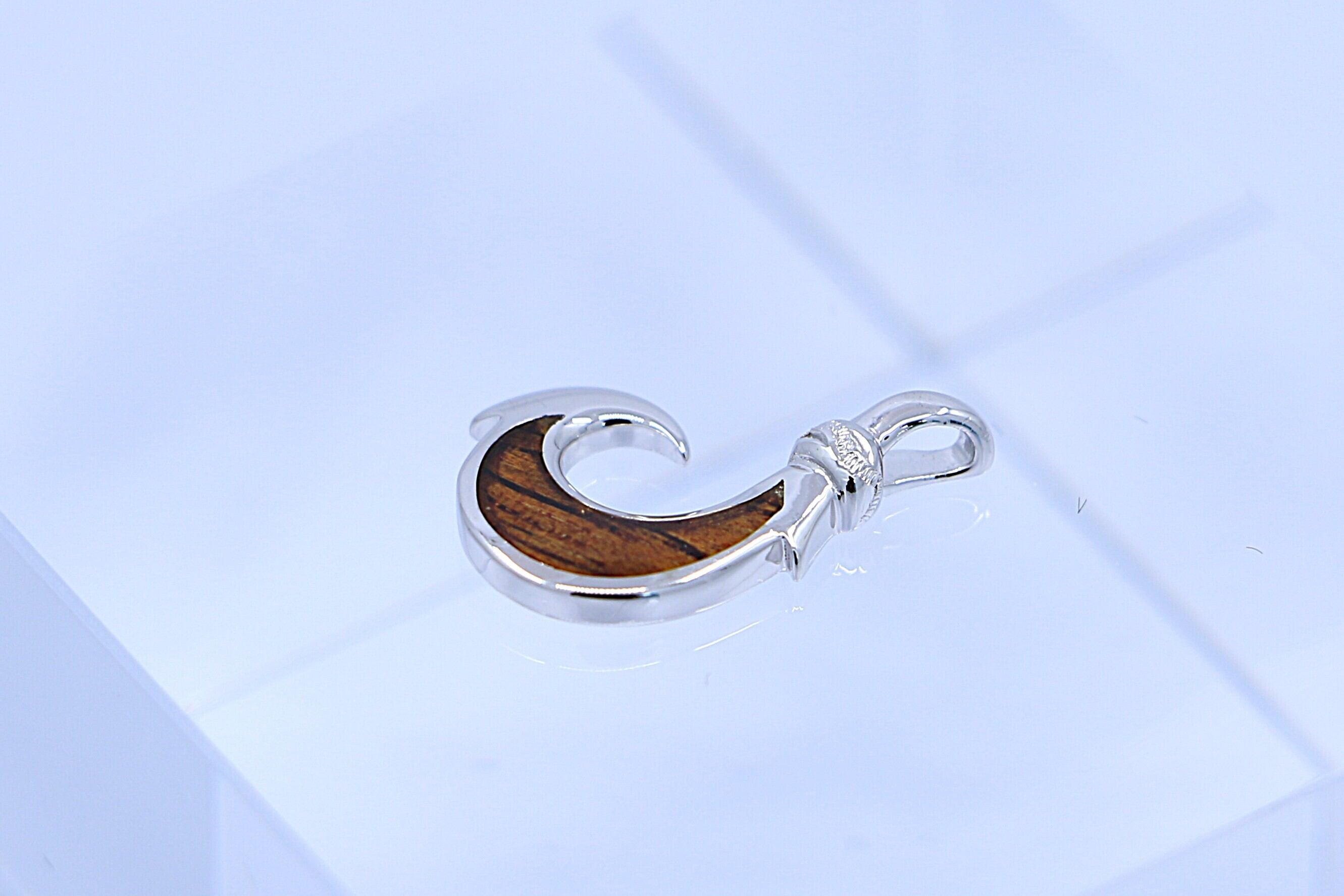 ハワイの海の恵みを象徴するフィッシュフックをモチーフにしたこのコアウッドとシルバーのペンダントトップスは、伝統と現代が融合したエレガントなデザインが特徴です。
