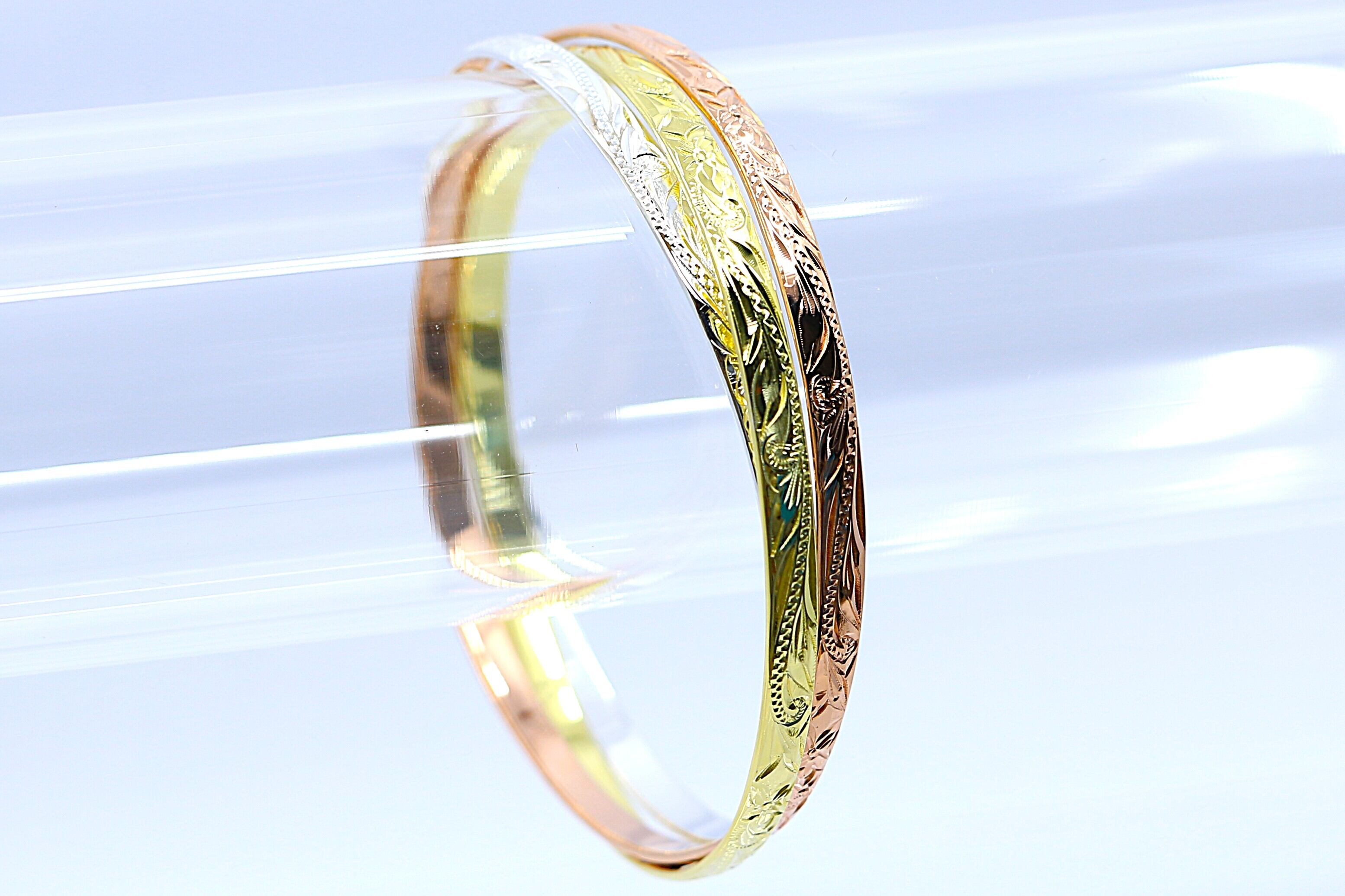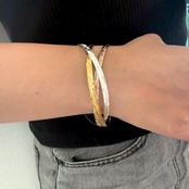 シルバー・イエローゴールド・ピンクゴールドの3色が輝く、重ねづけ風のバングルです。