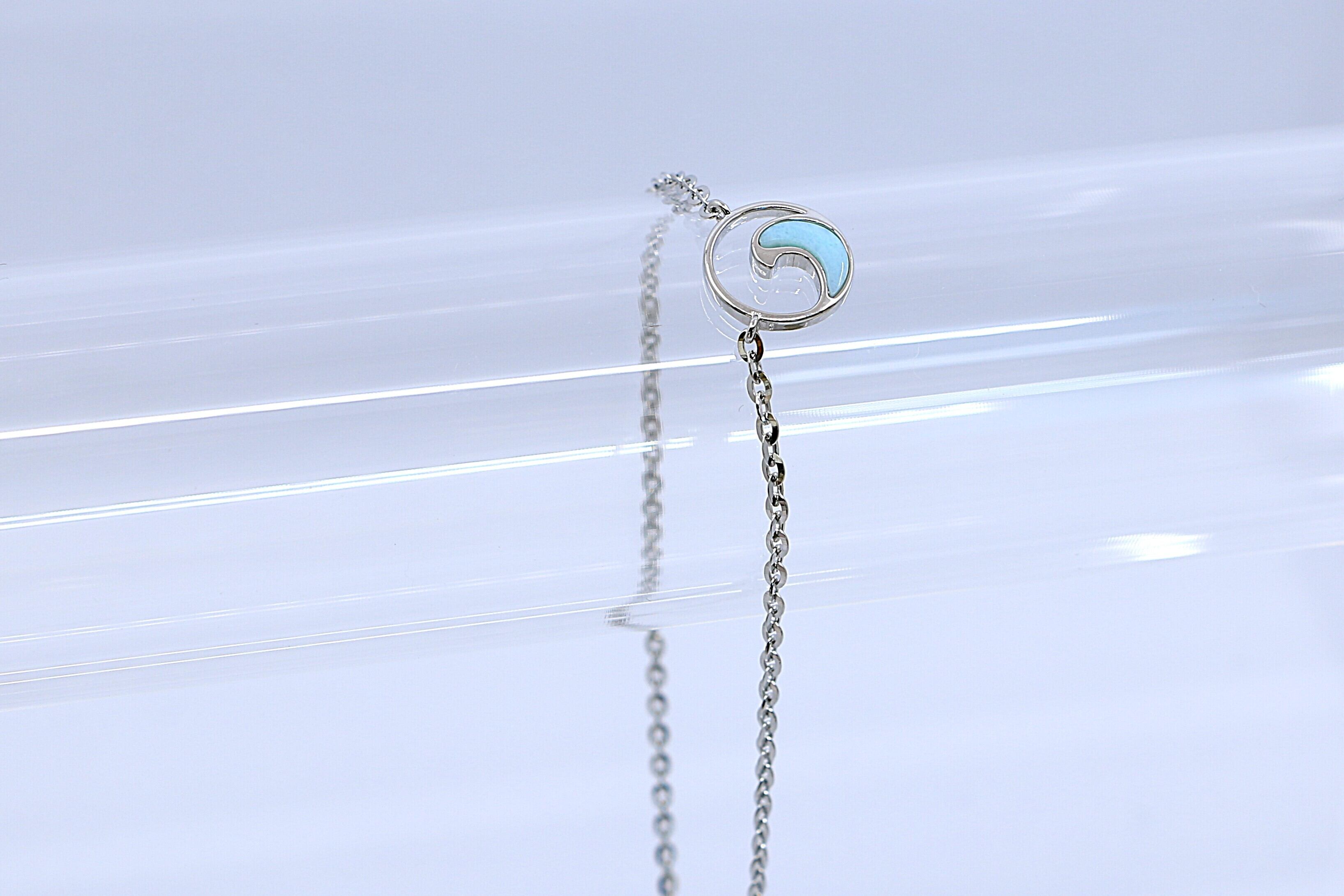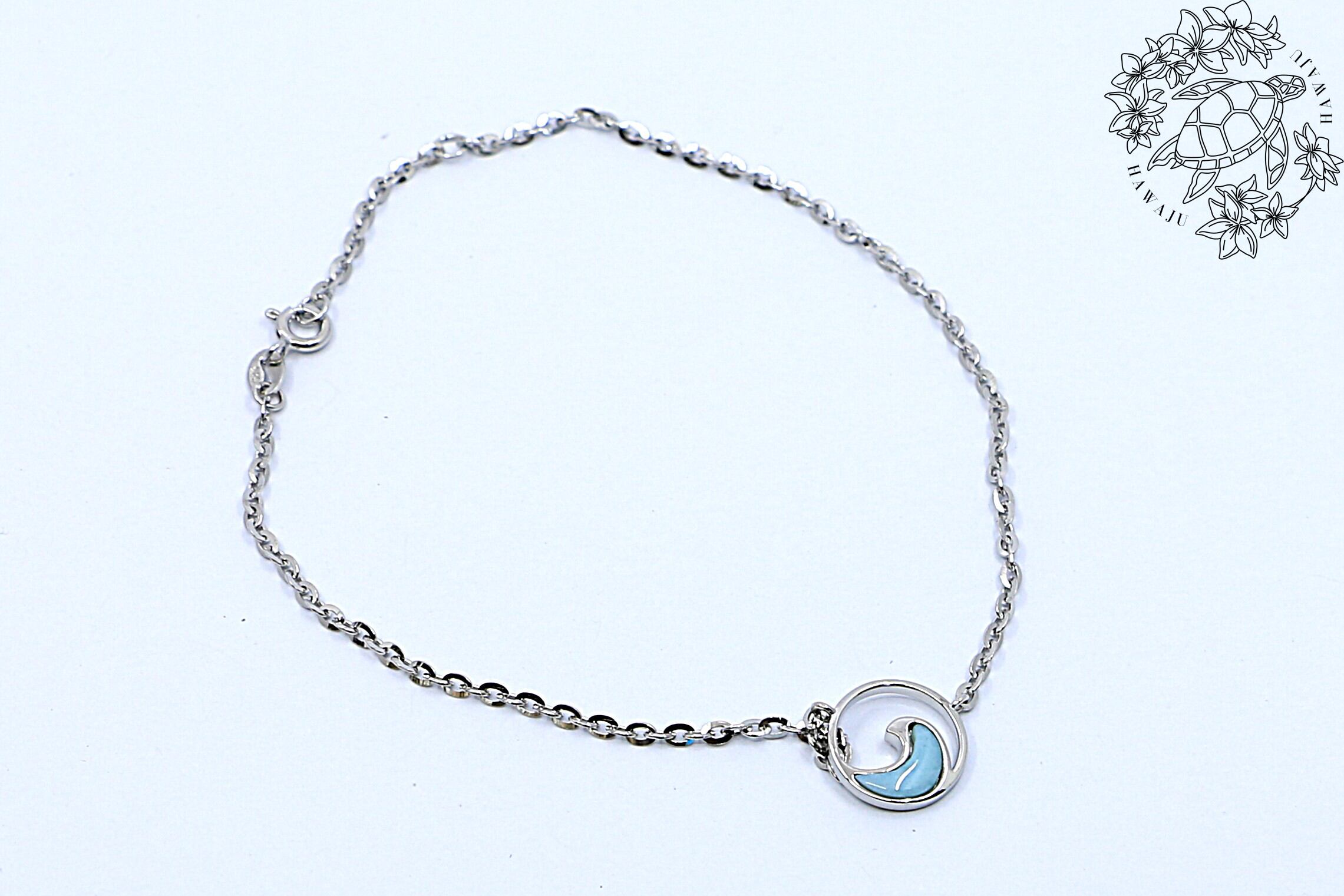 このアンクレットは、優雅なウェーブ(波)モチーフに、希少な天然石ラリマーをあしらった美しいハワイアンジュエリーです。シルバー素材のチェーンと、柔らかなブルーのラリマーが調和し、足元に涼やかで上品な輝きを添えます。波モチーフは、ハワイ文化において「永遠」「再生」「生命の流れ」を象徴し、このアンクレットには海の持つパワーと癒しの意味が込められています。