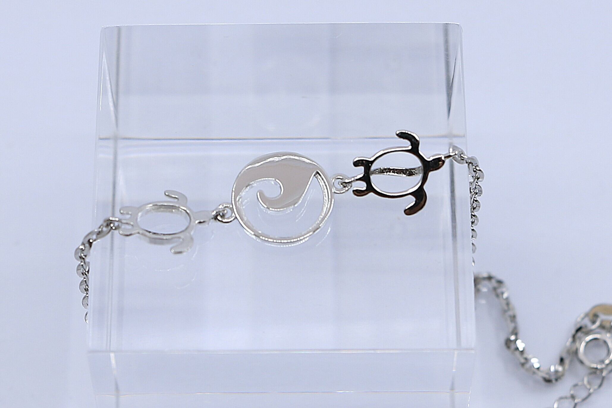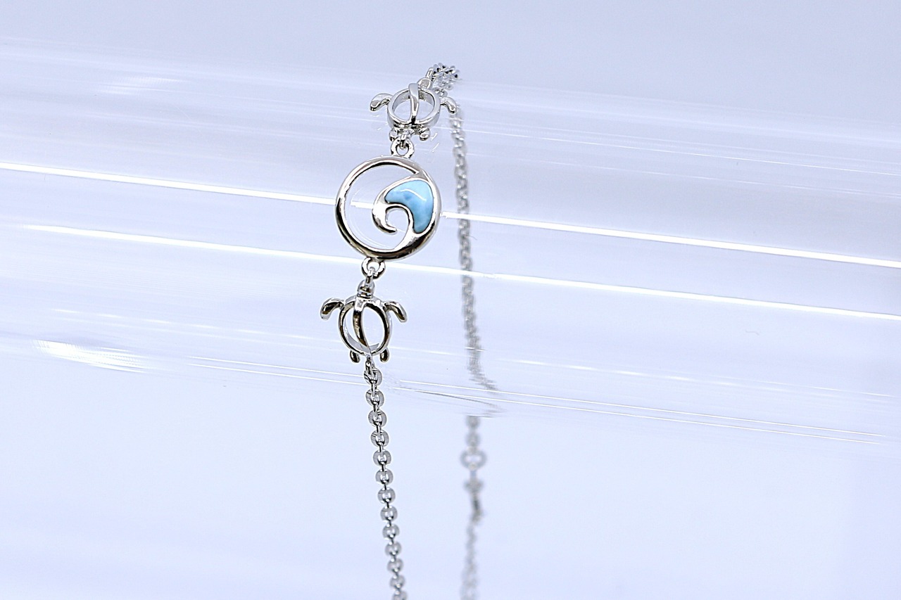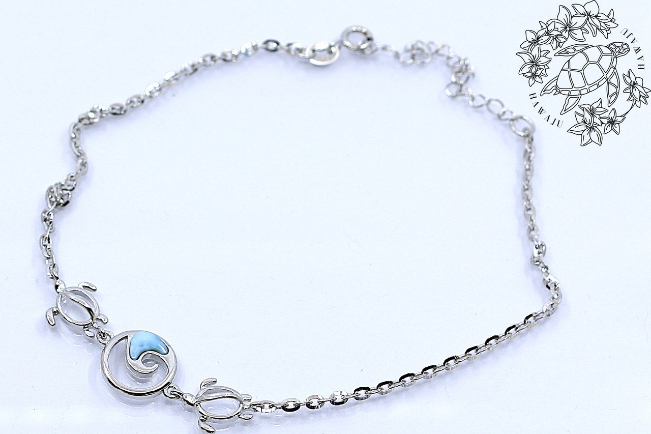 このアンクレットは、幸運を運ぶ海の守り神“ホヌ(ウミガメ)”と、生命の流れを象徴するウェーブ(波)モチーフを組み合わせ、希少な天然石ラリマーをあしらった美しいハワイアンジュエリーです。