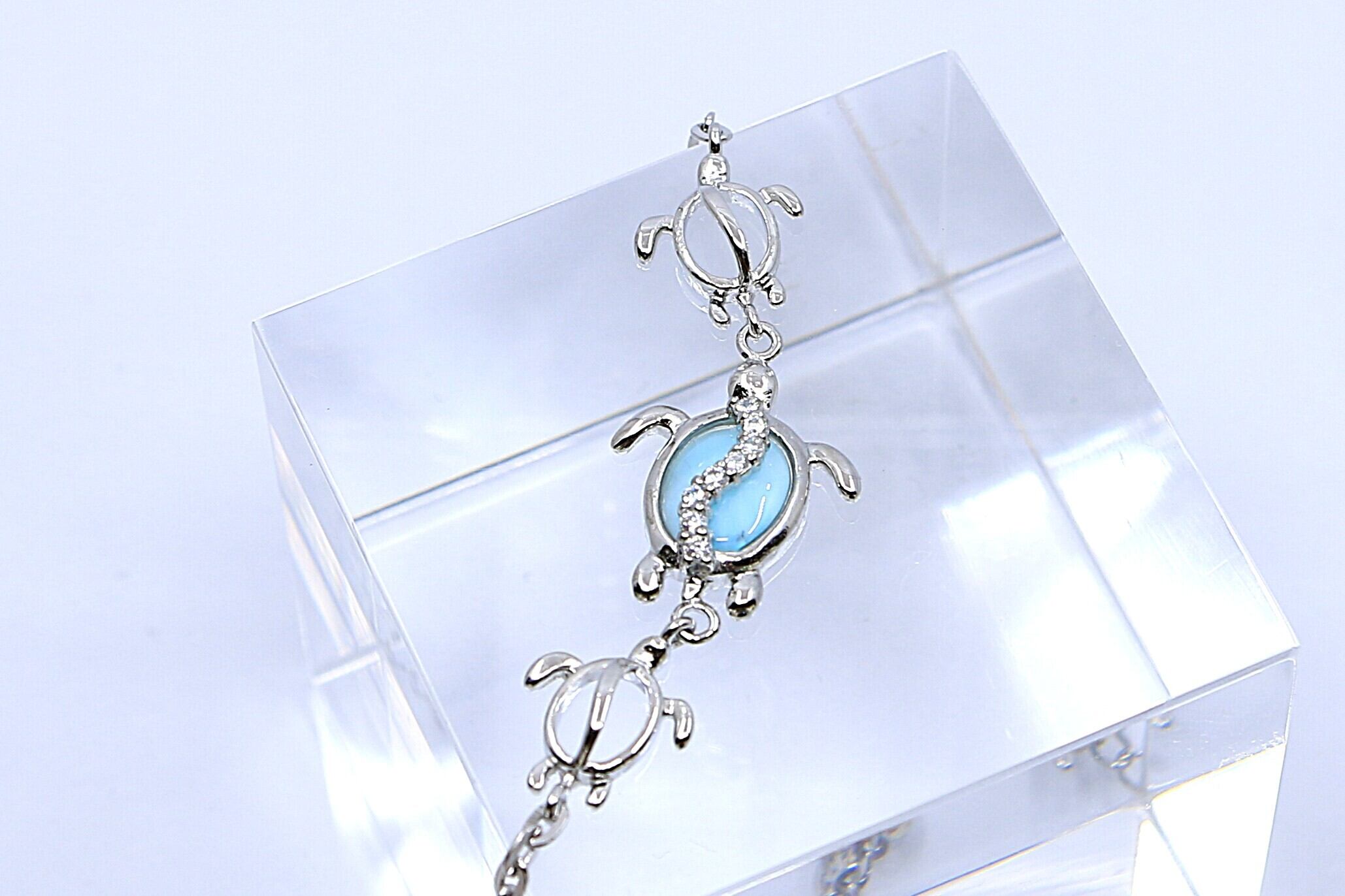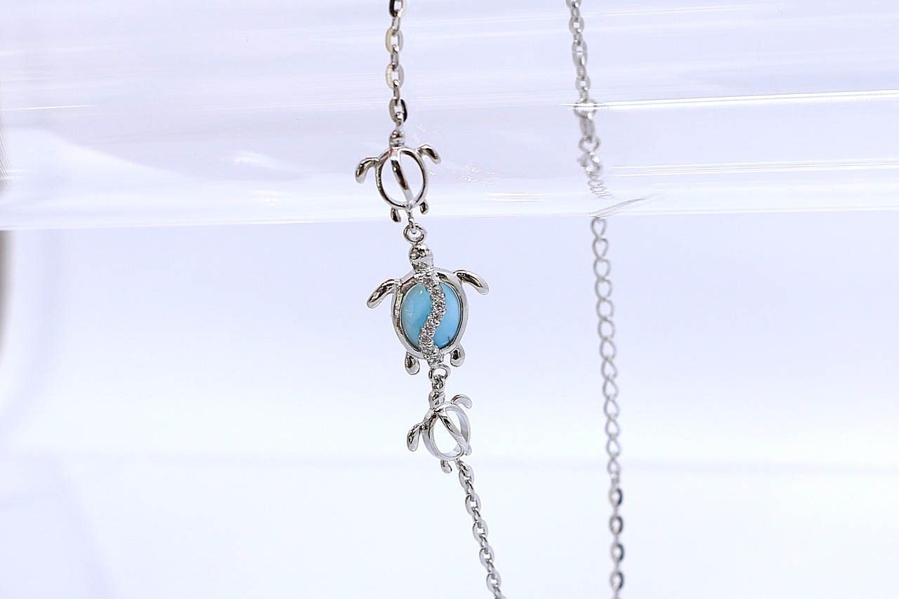 このアンクレットは、ハワイアンジュエリーで人気のホヌ(ウミガメ)モチーフを3連でデザイン。中央のホヌの甲羅部分には、南国の海を思わせる美しいラリマーをあしらい、さらにその上を波のように流れるキュービックジルコニアがきらめき、幻想的な輝きを放ちます。両サイドにはシルバーのホヌが寄り添い、海の守護と優しさを感じさせる、特別感のある仕上がりです。