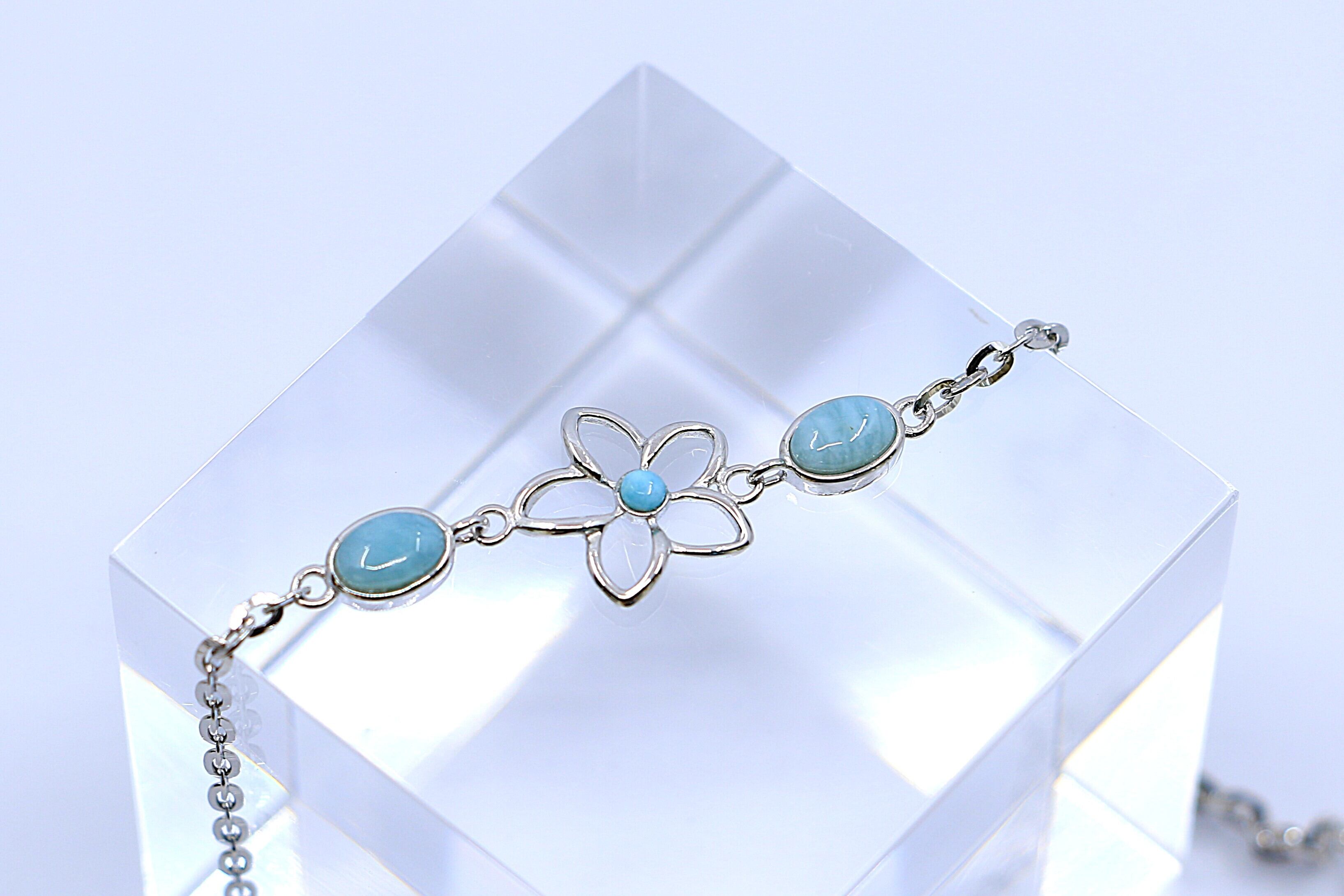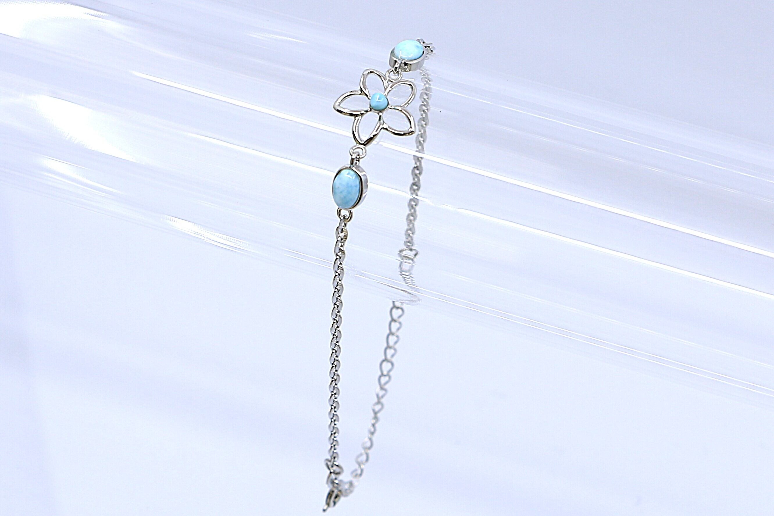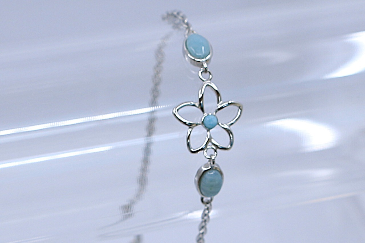 このブレスレットは、繊細なチェーンデザインに可憐なフラワーモチーフをあしらい、その中心に天然石ラリマーをセットしました。さらに、両サイドには楕円形のラリマーを配置し、手元に上品で華やかな印象をプラス。シルバーの輝きとラリマーの柔らかなブルーが調和し、まるで南国の海辺を纏うような爽やかさを演出します。