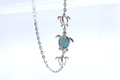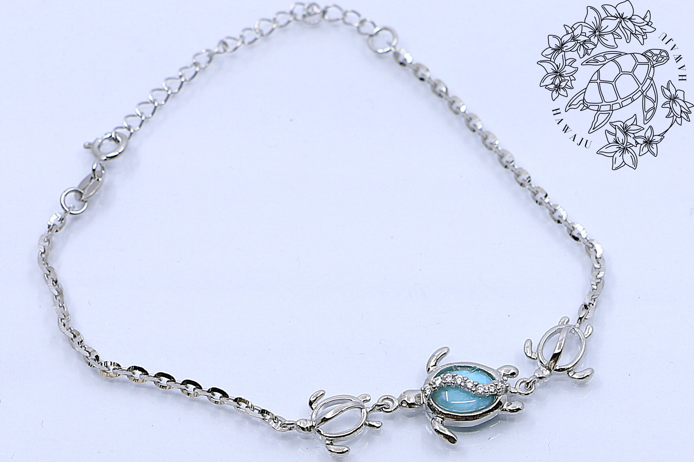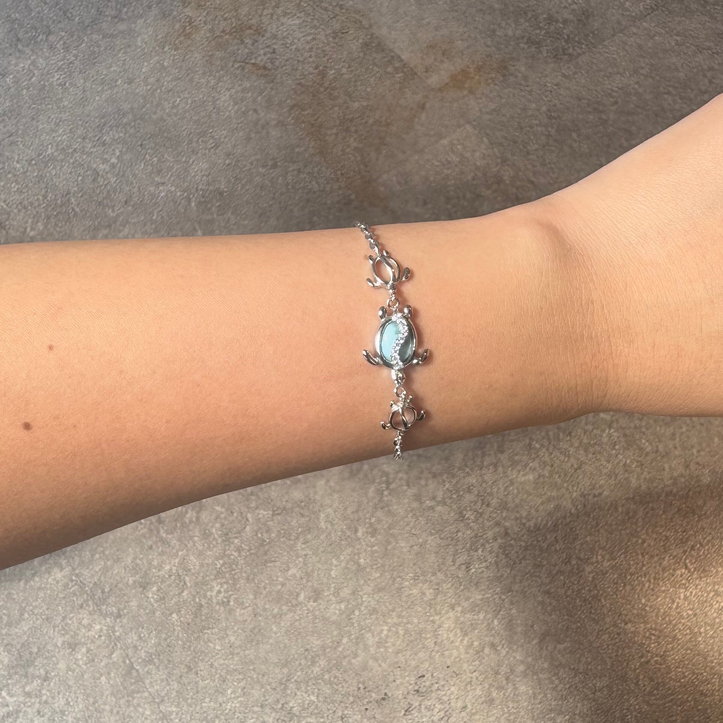 このブレスレットは、ハワイアンジュエリーで人気のホヌ(ウミガメ)モチーフを3連でデザイン。中央のホヌの甲羅部分には、南国の海を思わせる美しいラリマーをあしらい、さらにその上を波のように流れるキュービックジルコニアがきらめき、幻想的な輝きを放ちます。両サイドにはシルバーのホヌが寄り添い、海の守護と優しさを感じさせる、特別感のある仕上がりです。