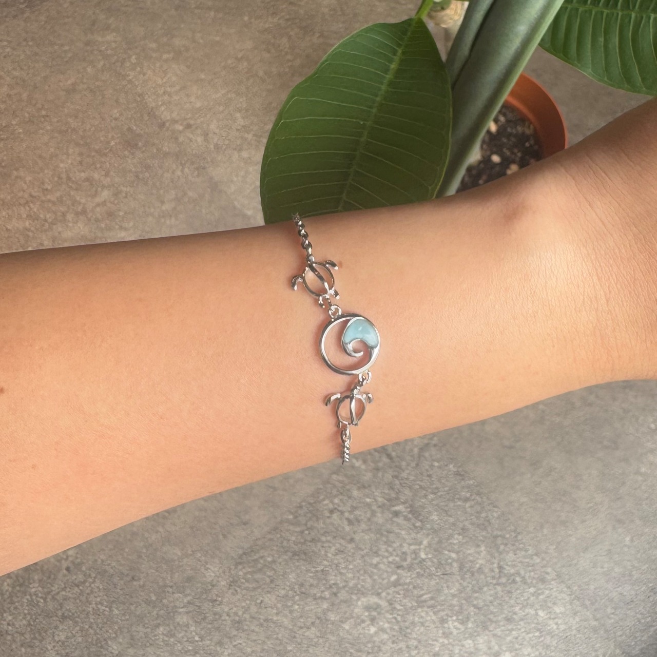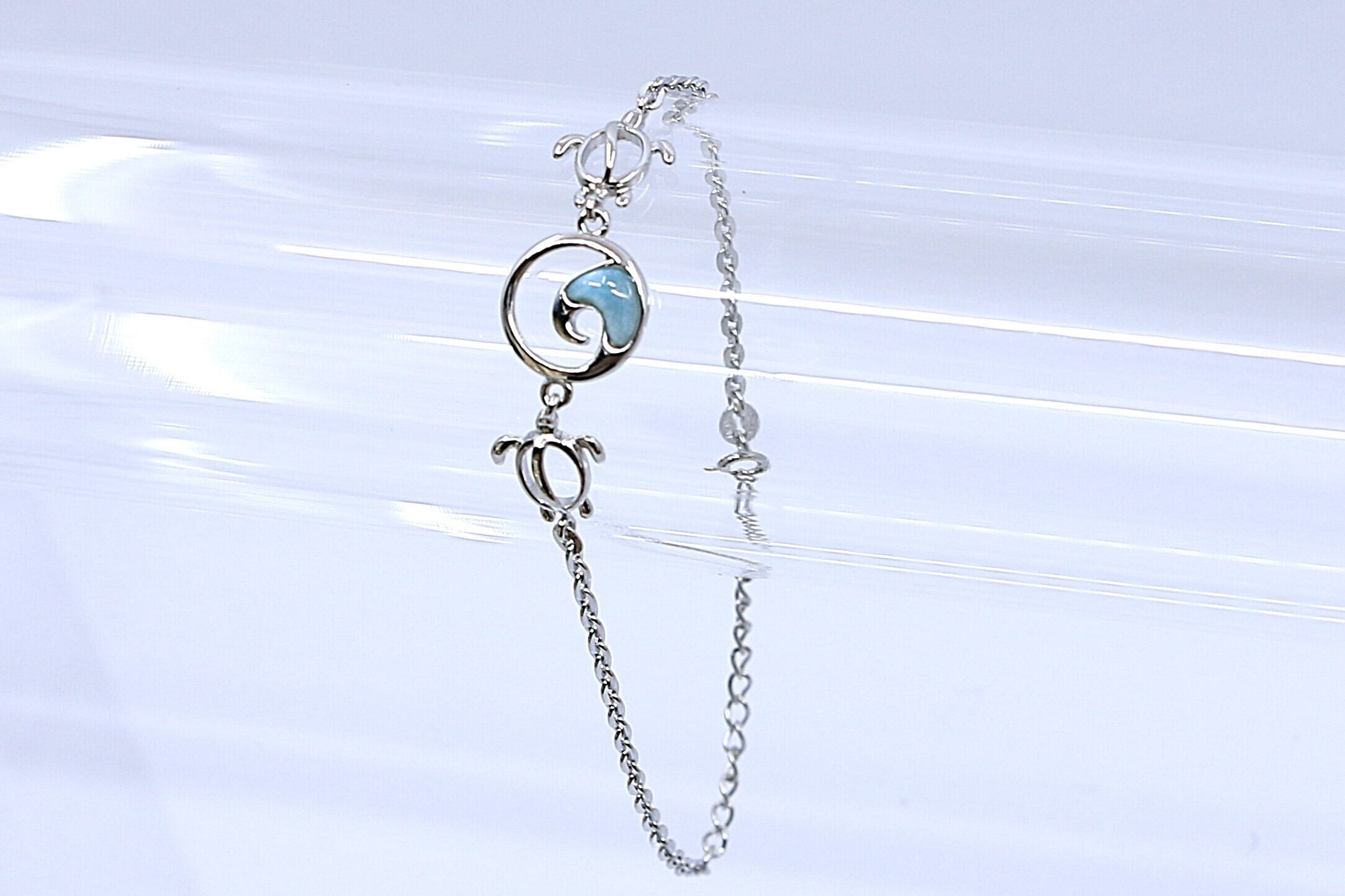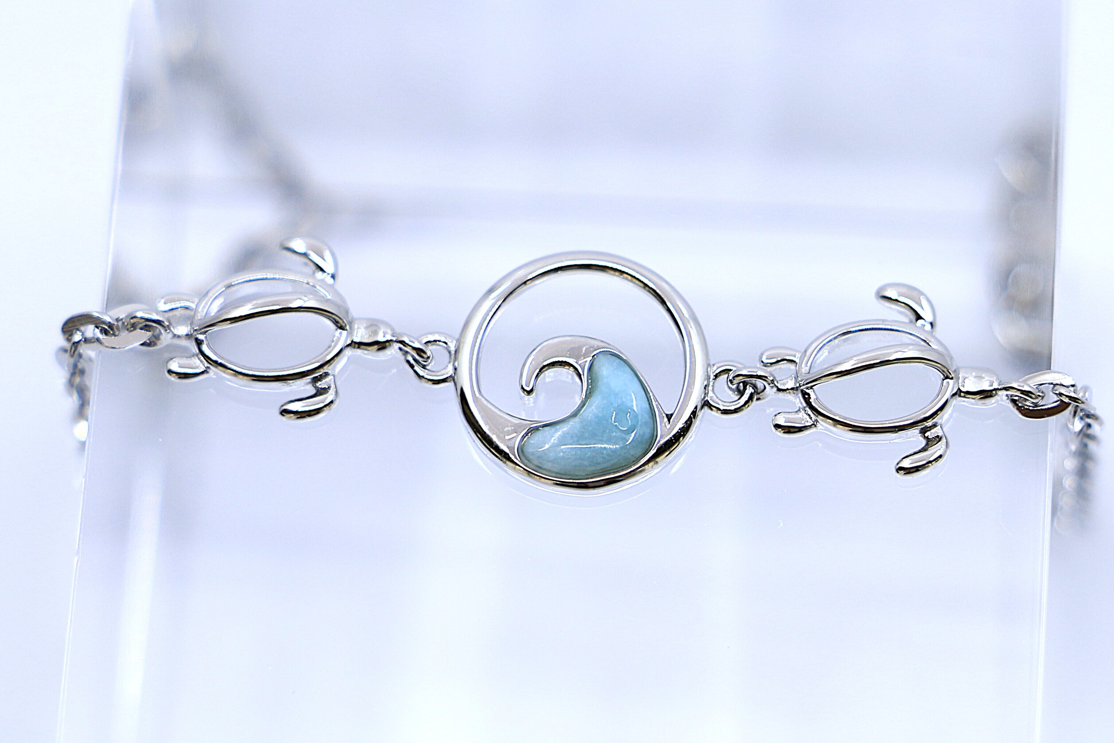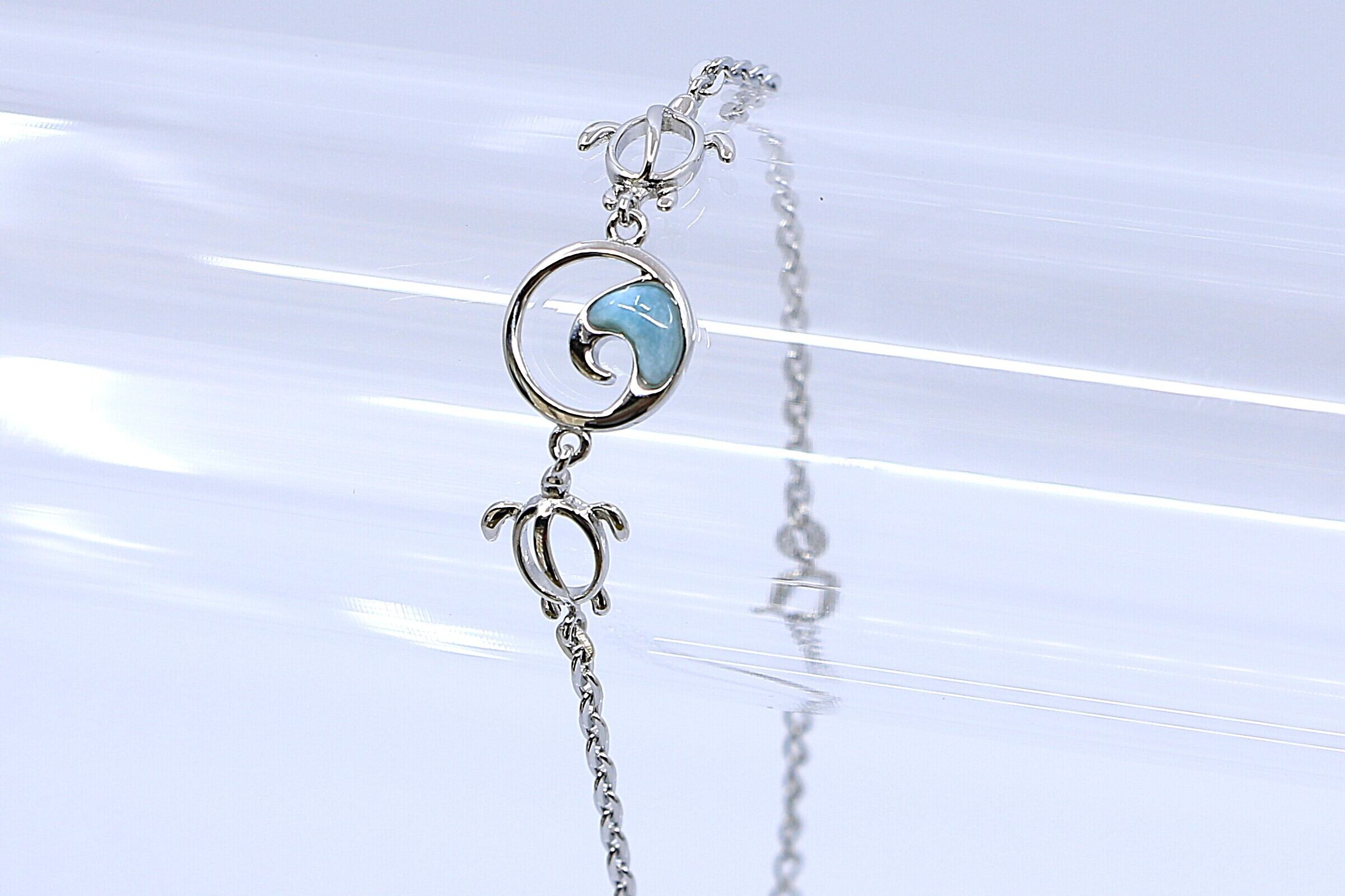このブレスレットは、幸運を運ぶ海の守り神ホヌ(ウミガメ)と、生命の流れを象徴するウェーブ(波)モチーフを組み合わせ、希少な天然石ラリマーをあしらった美しいハワイアンジュエリーです。