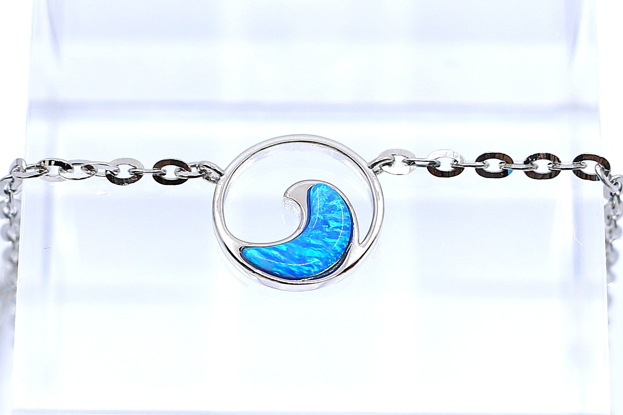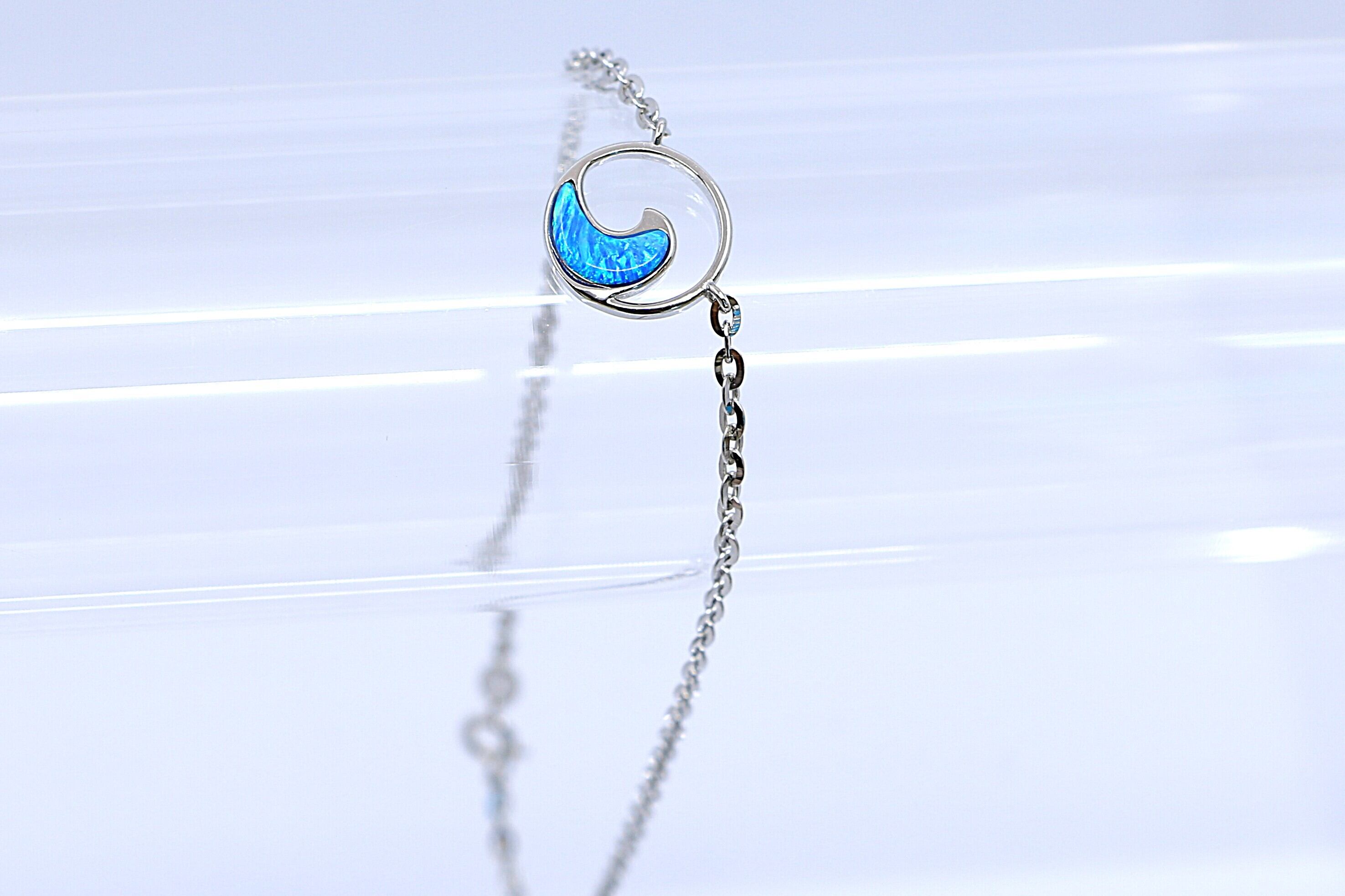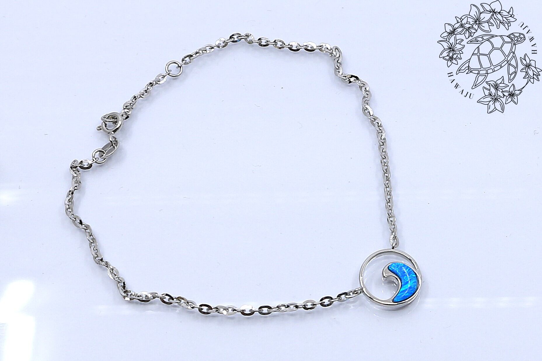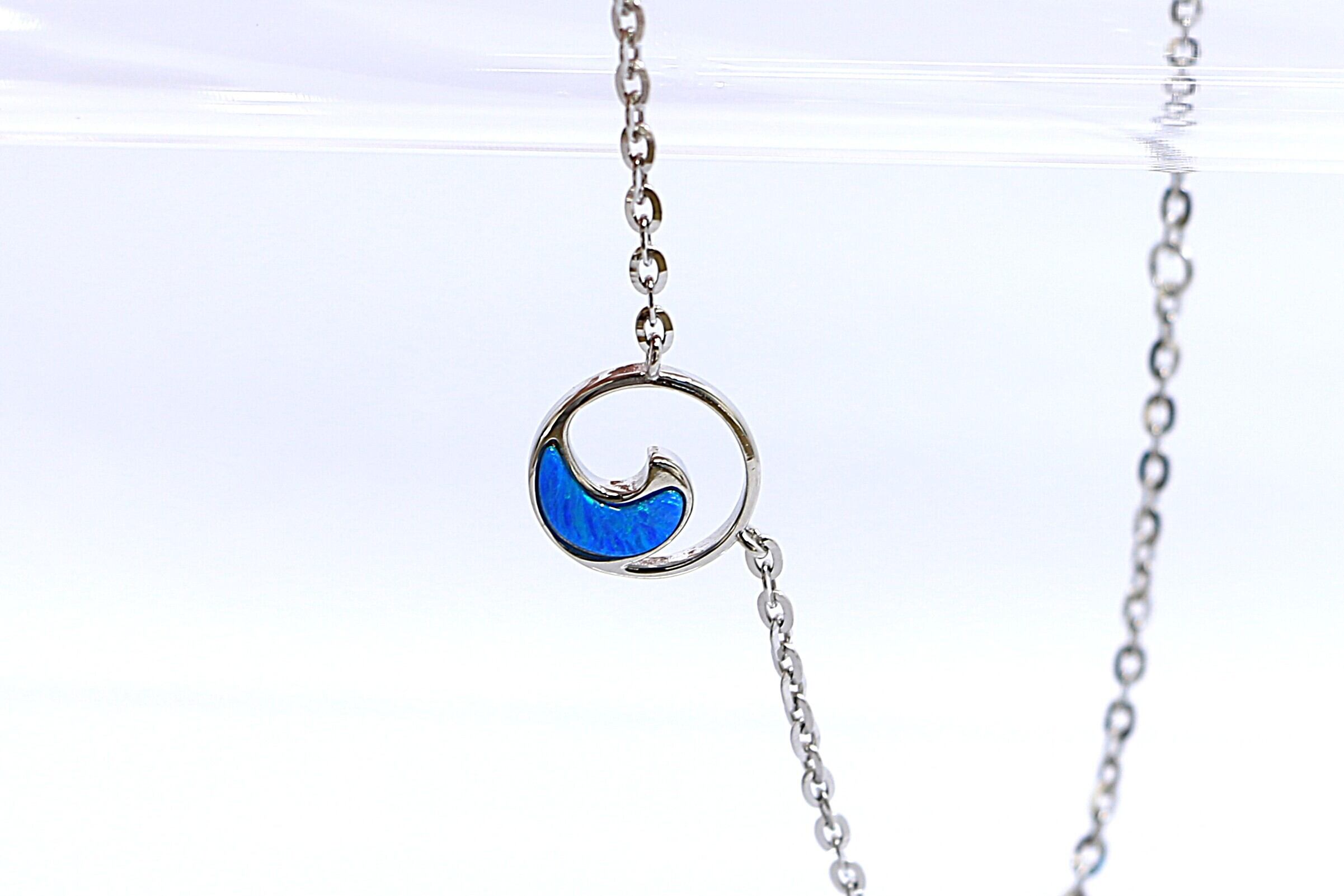 このアンクレットは、優雅なウェーブ(波)モチーフに、神秘的なブルーオパールをあしらった美しいハワイアンジュエリーです。シルバー素材のチェーンと、柔らかなブルーのブルーオパールが調和し、足元に涼やかで上品な輝きを添えます。波モチーフは、ハワイ文化において「永遠」「再生」「生命の流れ」を象徴し、このアンクレットには海の持つパワーと癒しの意味が込められています。