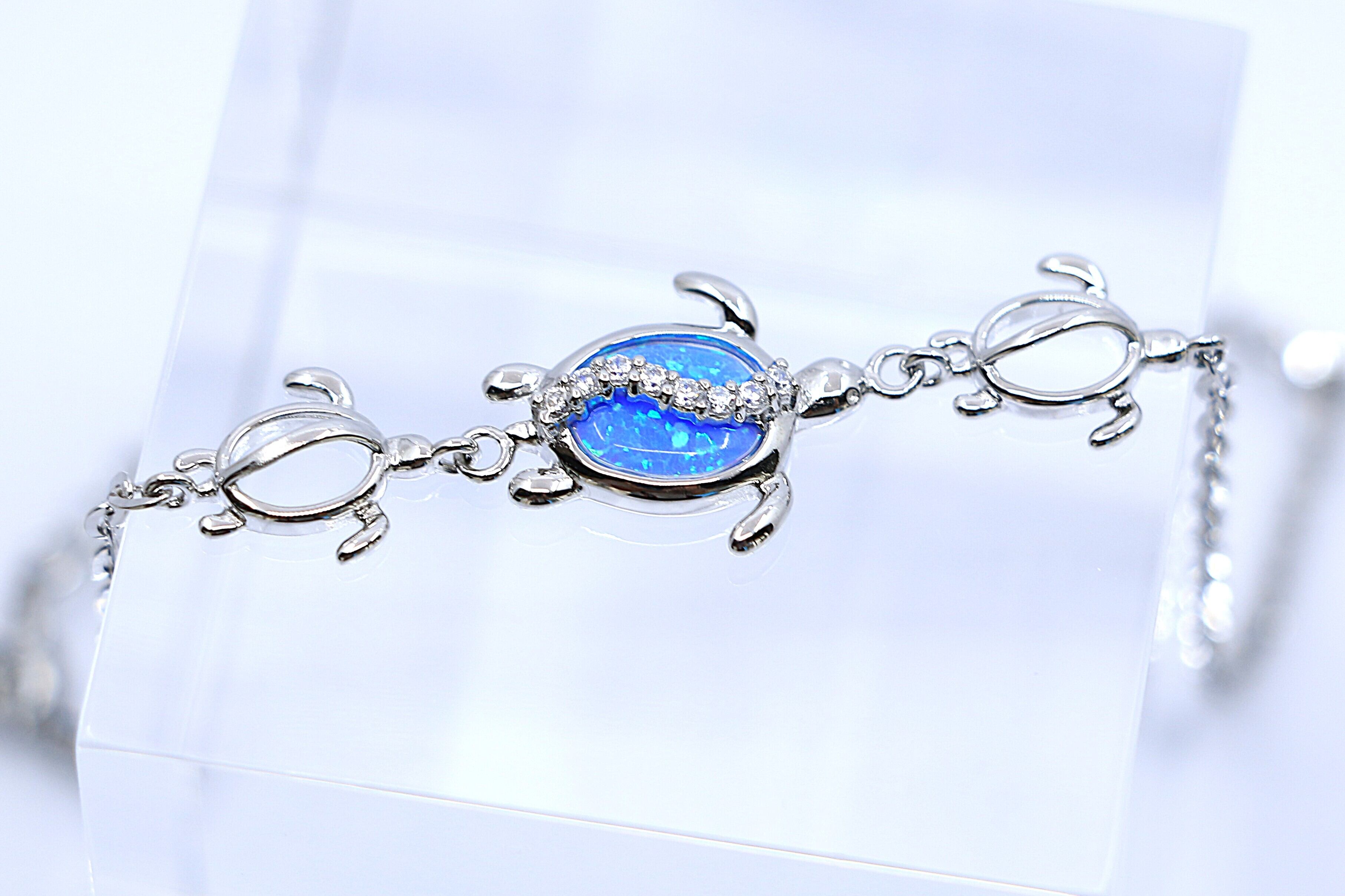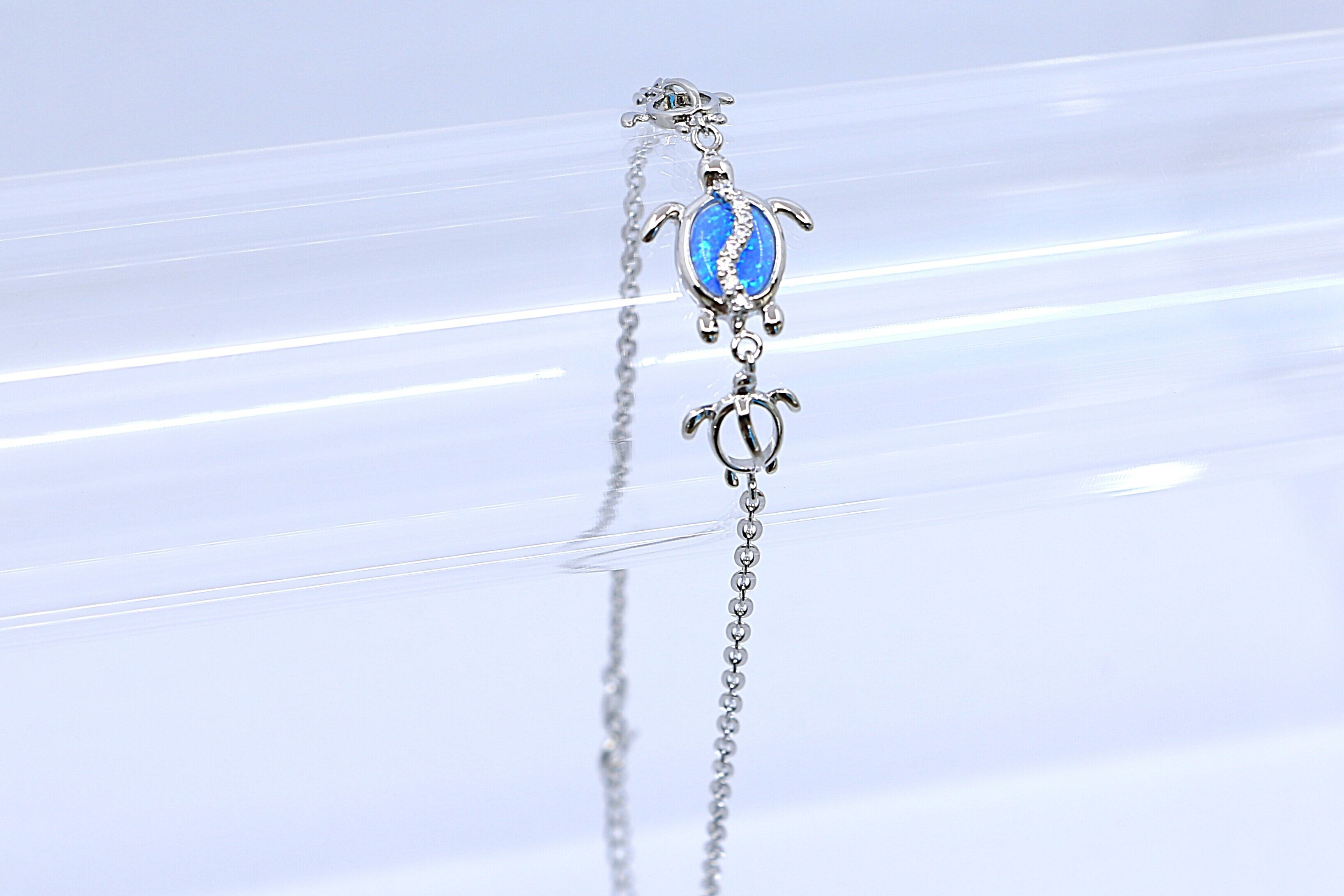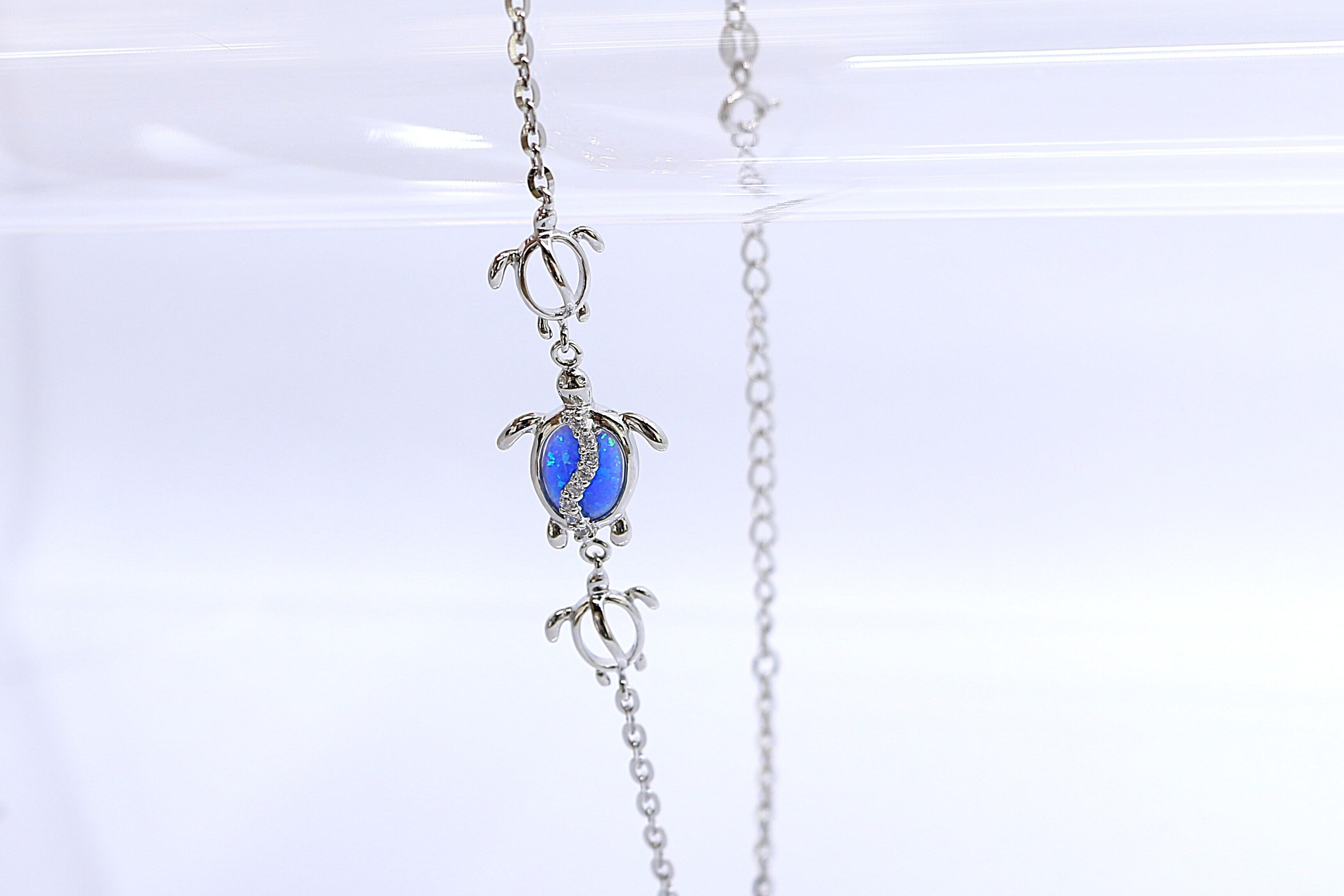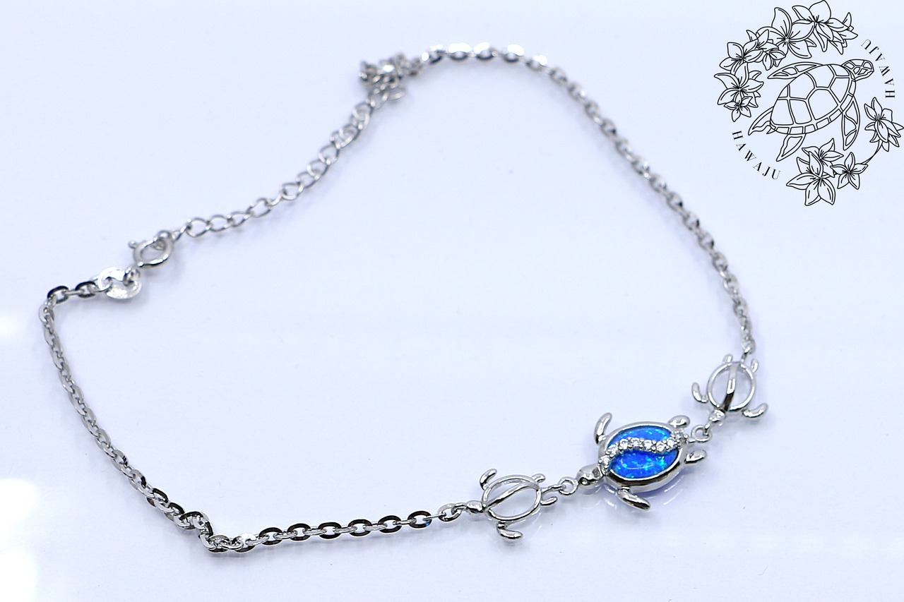 このアンクレットは、ハワイアンジュエリーで人気のホヌ(ウミガメ)モチーフを3連でデザイン。中央のホヌの甲羅部分には、南国の海を思わせる神秘的なブルーオパールをあしらい、さらにその上を波のように流れるキュービックジルコニアがきらめき、幻想的な輝きを放ちます。両サイドにはシルバーのホヌが寄り添い、海の守護と優しさを感じさせる、特別感のある仕上がりです。