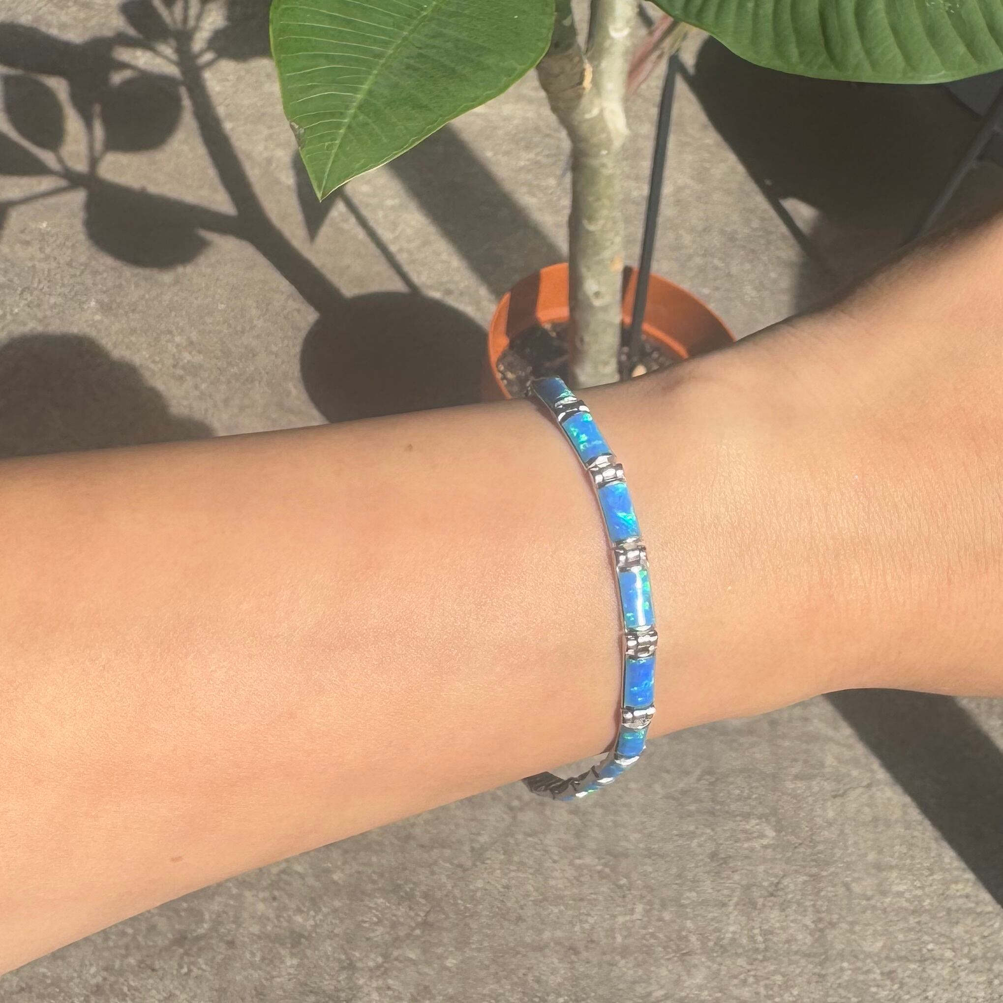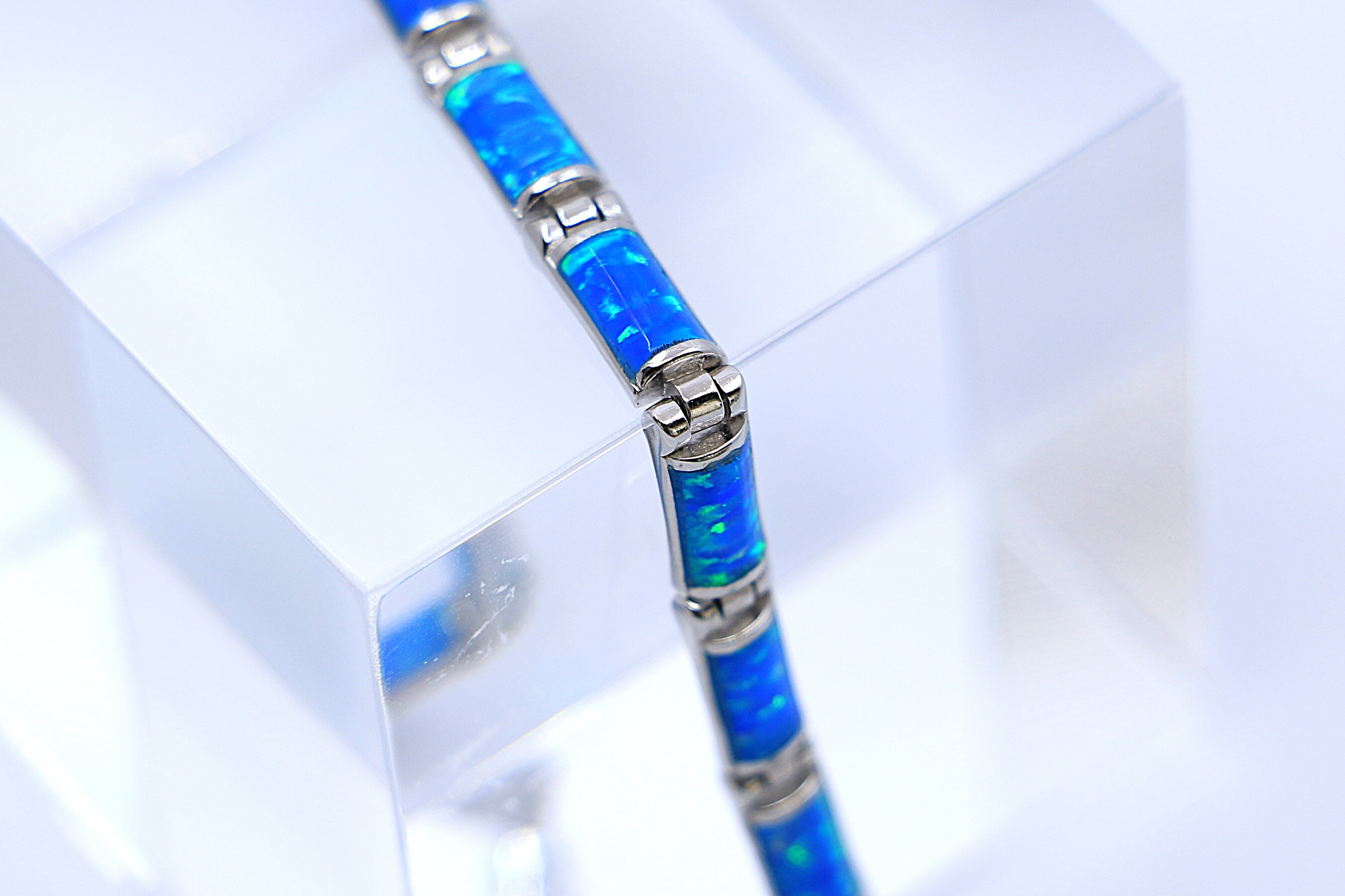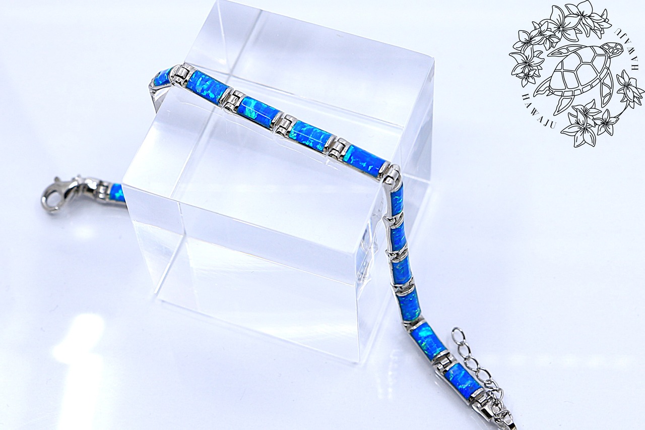 澄み渡るハワイの青い海や自然を感じさせる、他にはない美しいブルーオパール。その色合いを引き立てるのは、手元に光を集める上質なシルバー925。長方形オパールを連結したスタイリッシュな構造が、洗練された輝きを放ちます。日常に癒しと彩りをプラスし、海を愛する方や南国の雰囲気が好きな方にぴったりの、特別なジュエリーです。