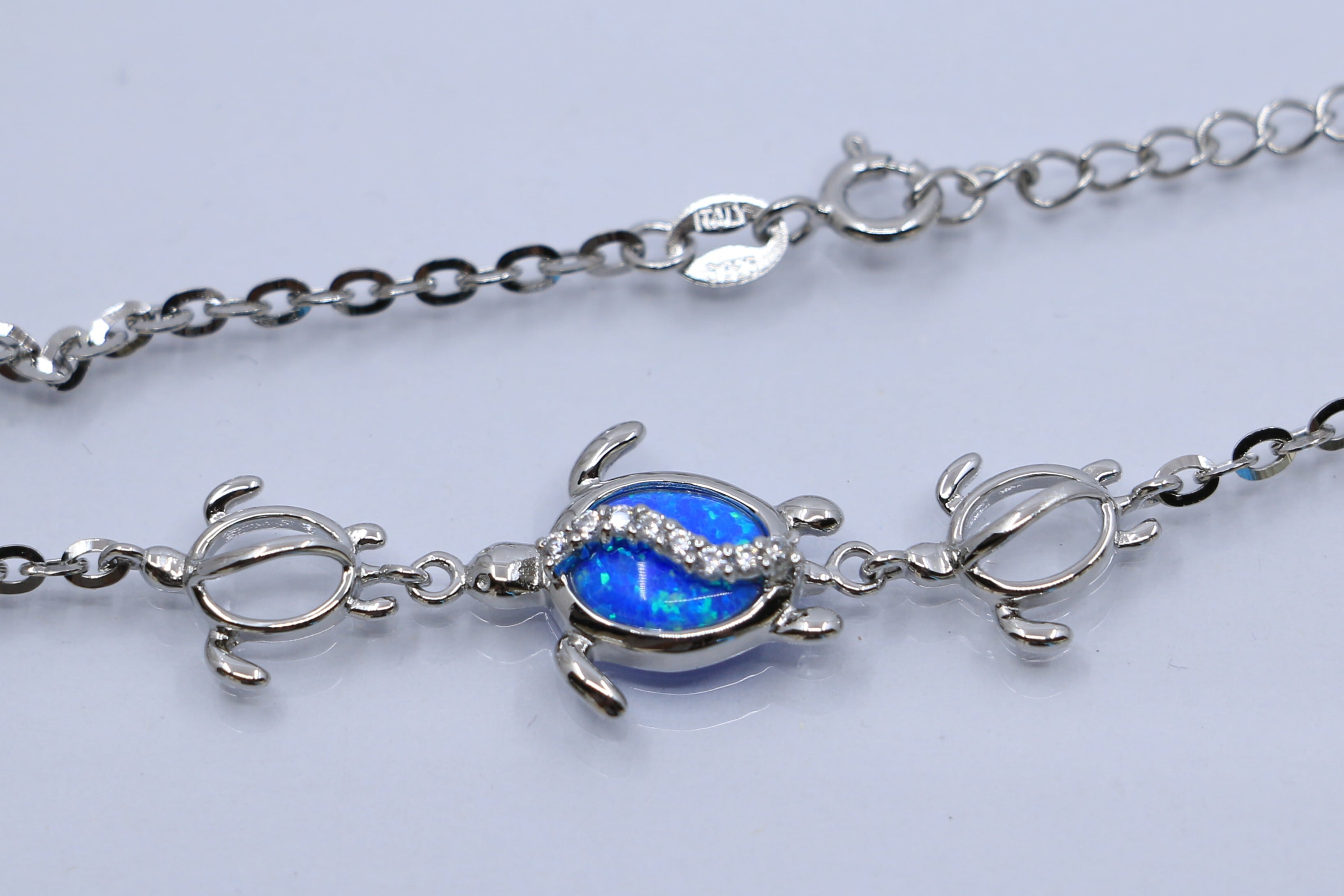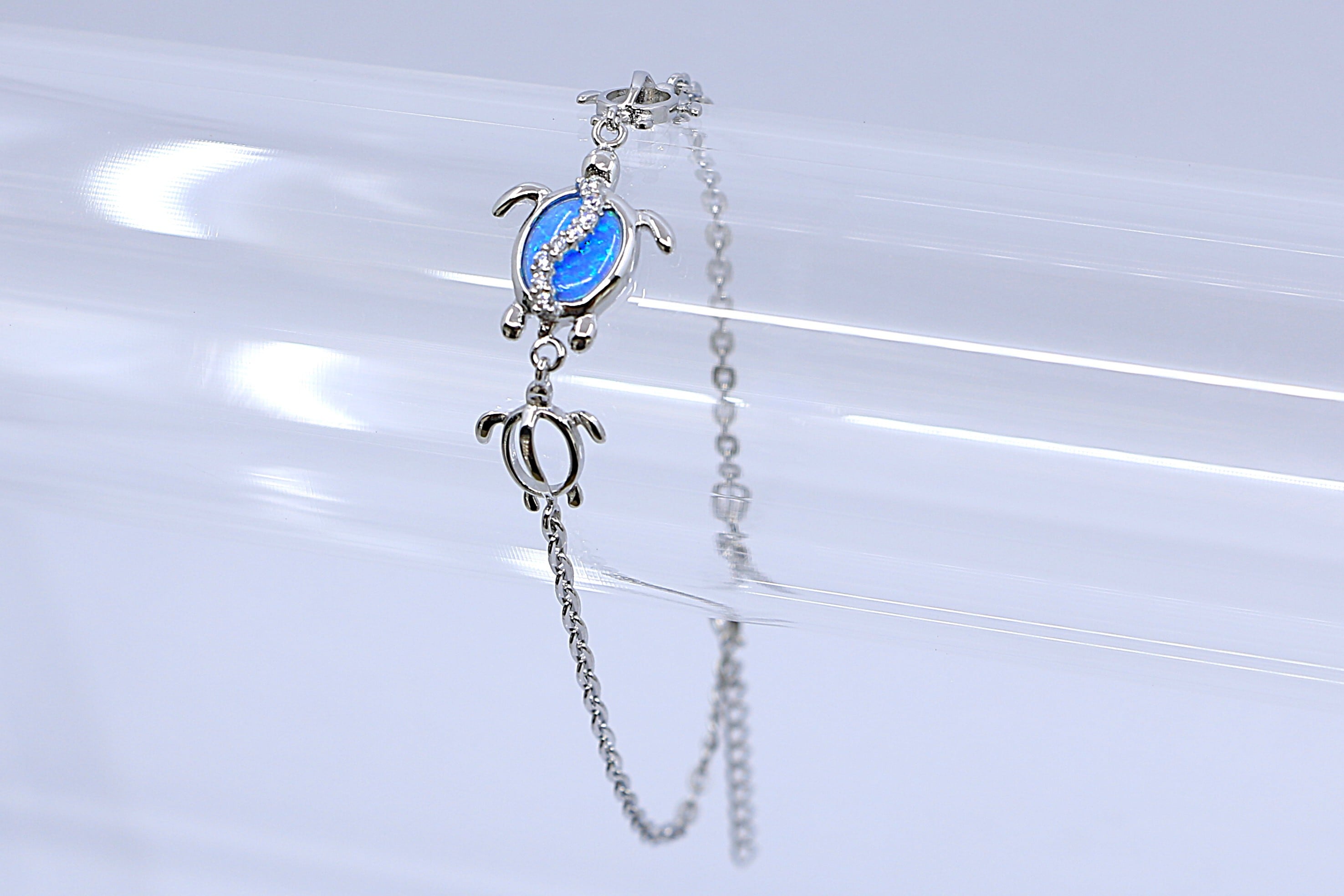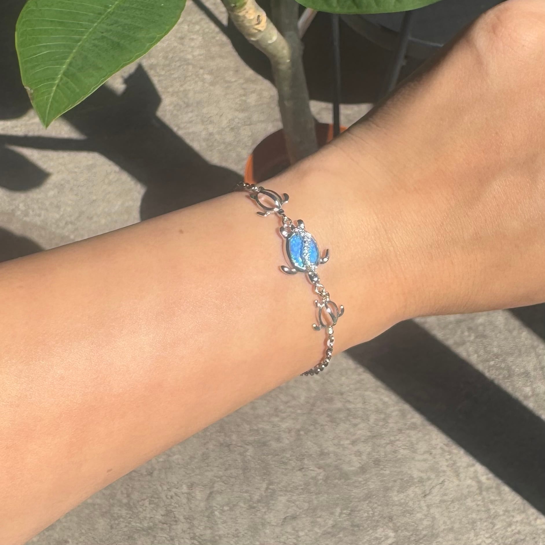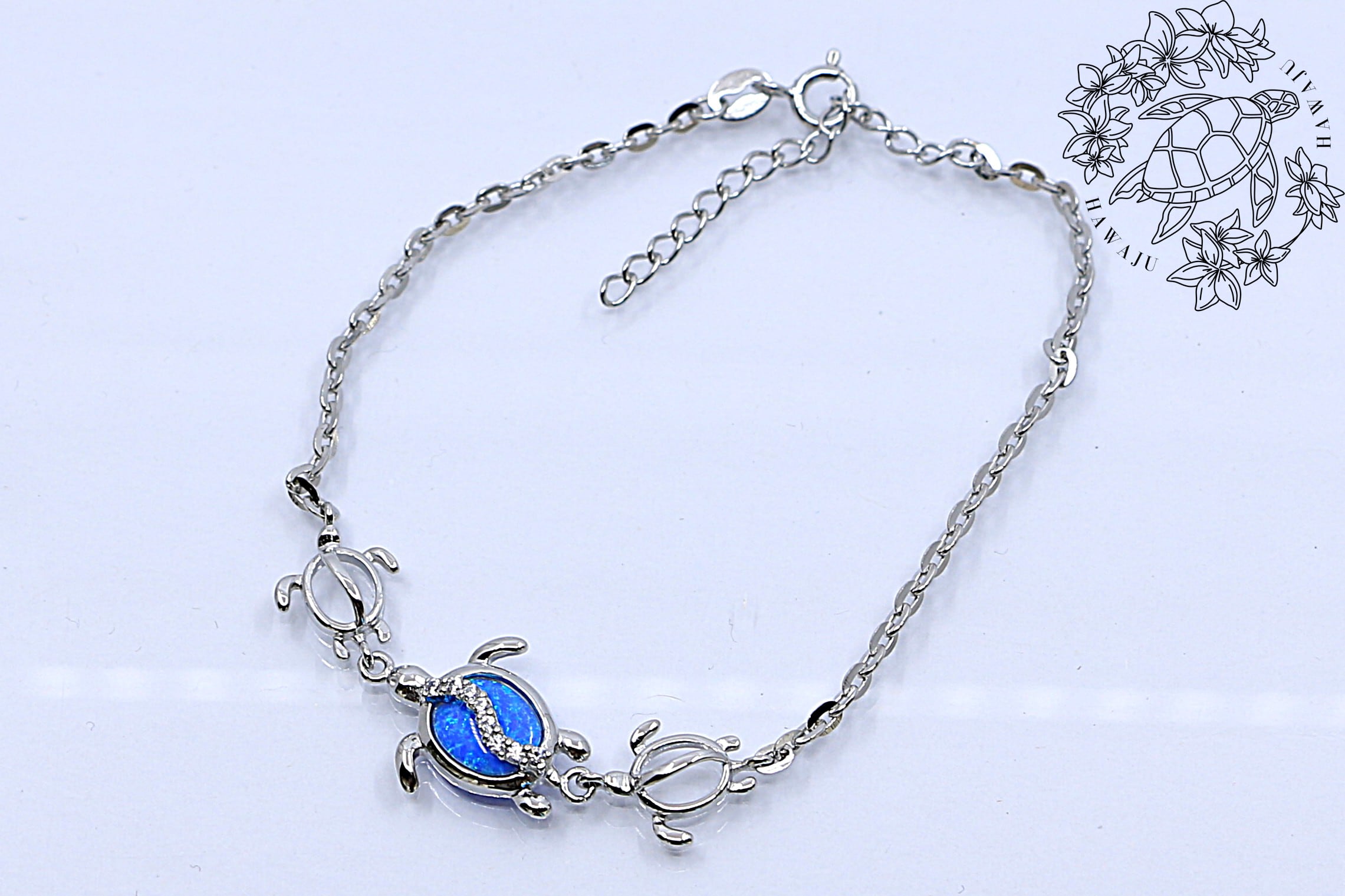 このブレスレットは、ハワイアンジュエリーで人気のホヌ(ウミガメ)モチーフを3連でデザイン。中央のホヌの甲羅部分には、南国の海を思わせる神秘的なブルーオパールをあしらい、さらにその上を波のように流れるキュービックジルコニアがきらめき、幻想的な輝きを放ちます。両サイドにはシルバーのホヌが寄り添い、海の守護と優しさを感じさせる、特別感のある仕上がりです。