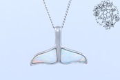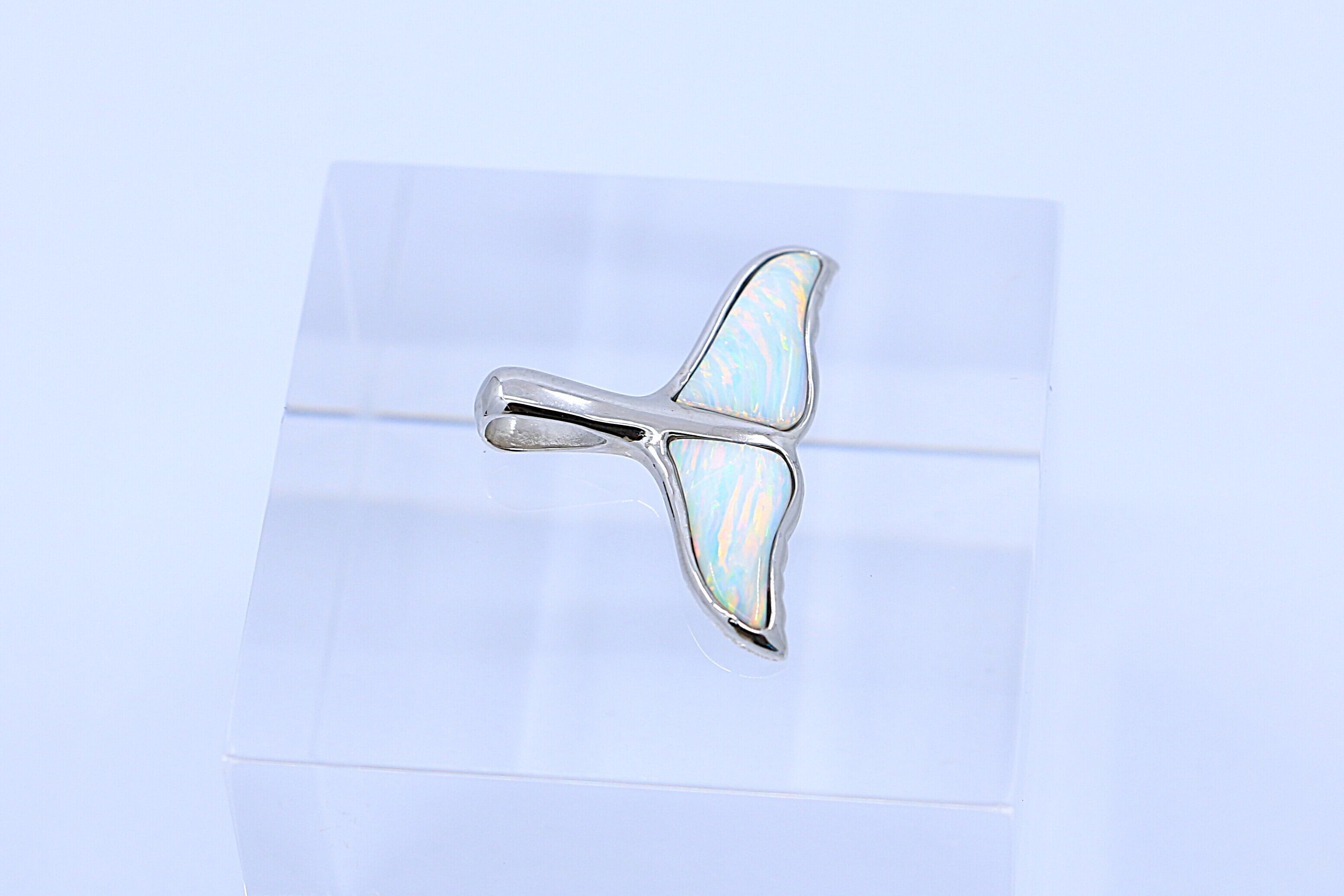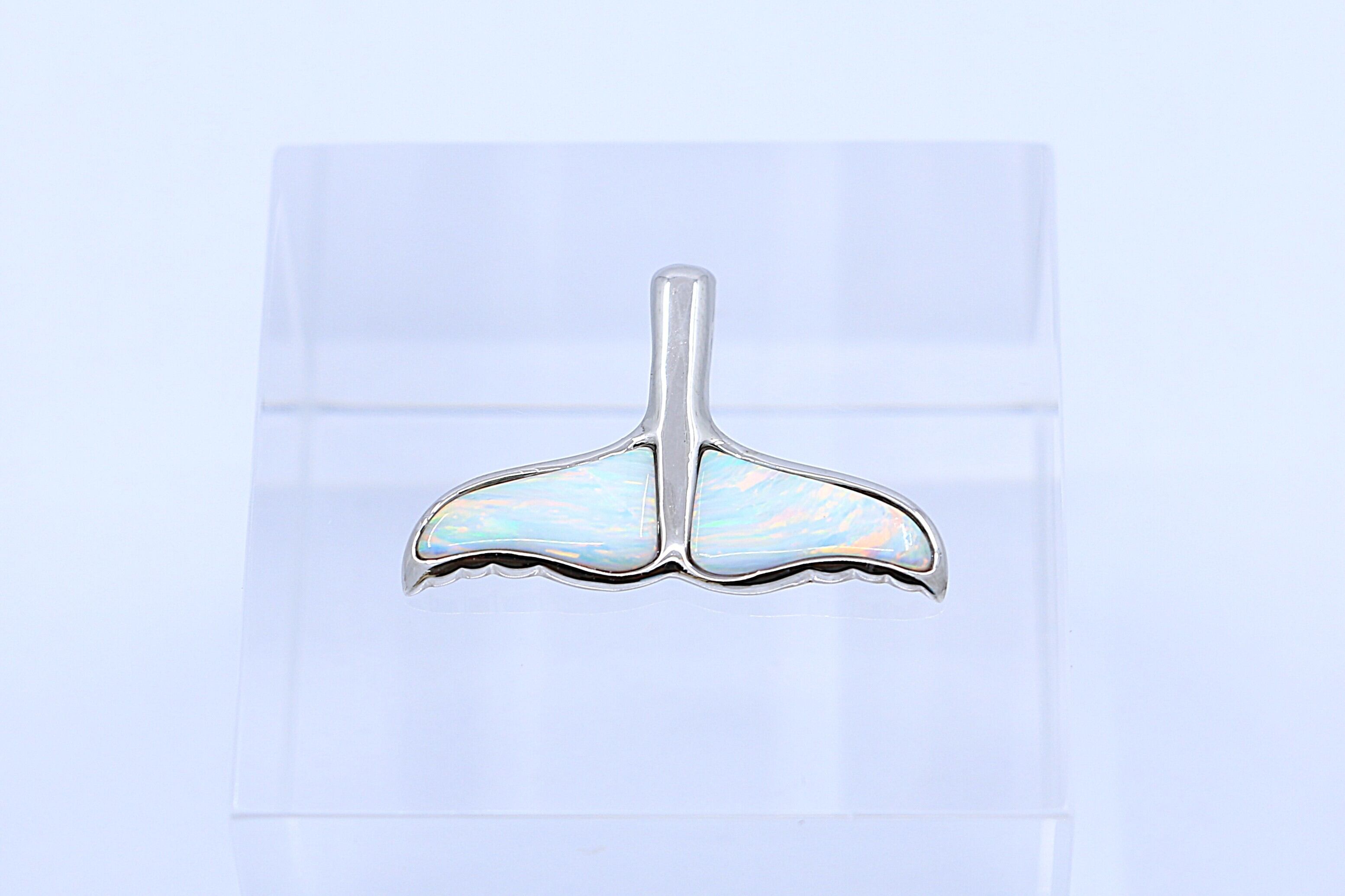 このホエールテールのペンダントトップは、ホワイトオパールの優しい虹色の輝きとシルバーの洗練されたデザインが見事に調和したアイテムです。クジラの尾が象徴する守護と自由の意味が込められたこのジュエリーは、シンプルでありながらも力強く、また癒しのエネルギーを感じることができる最適な逸品です。
