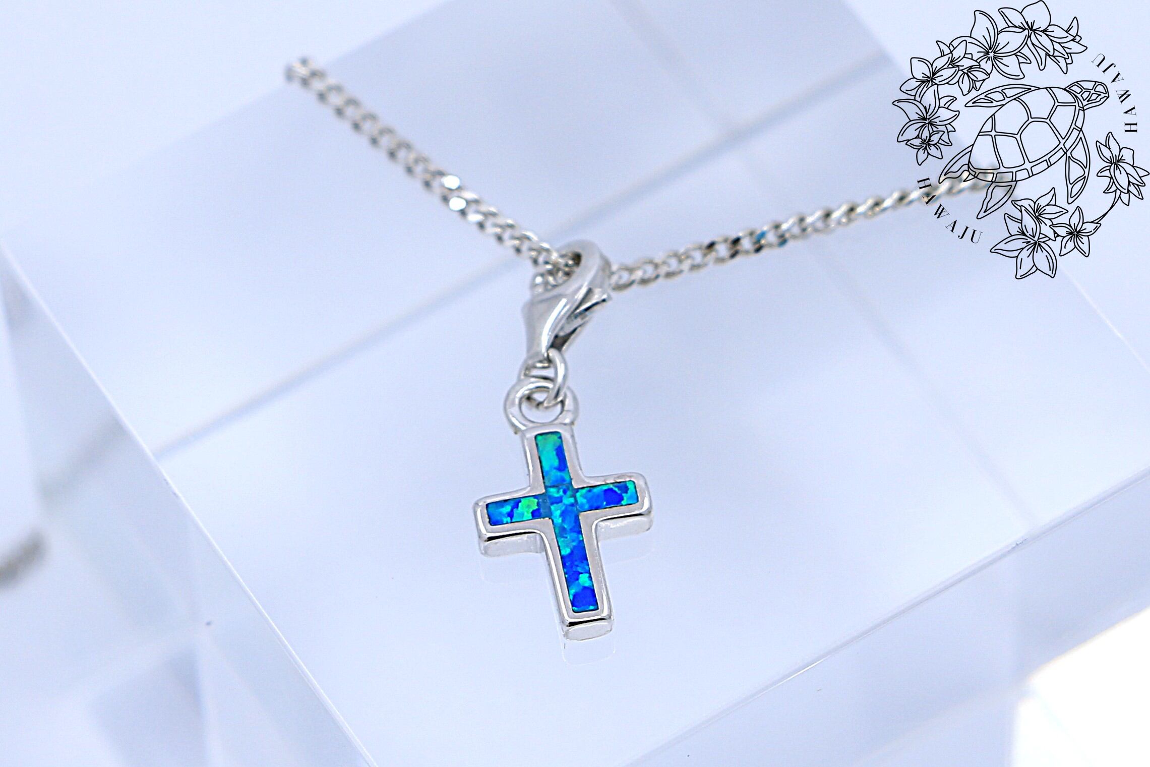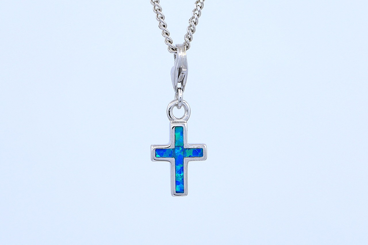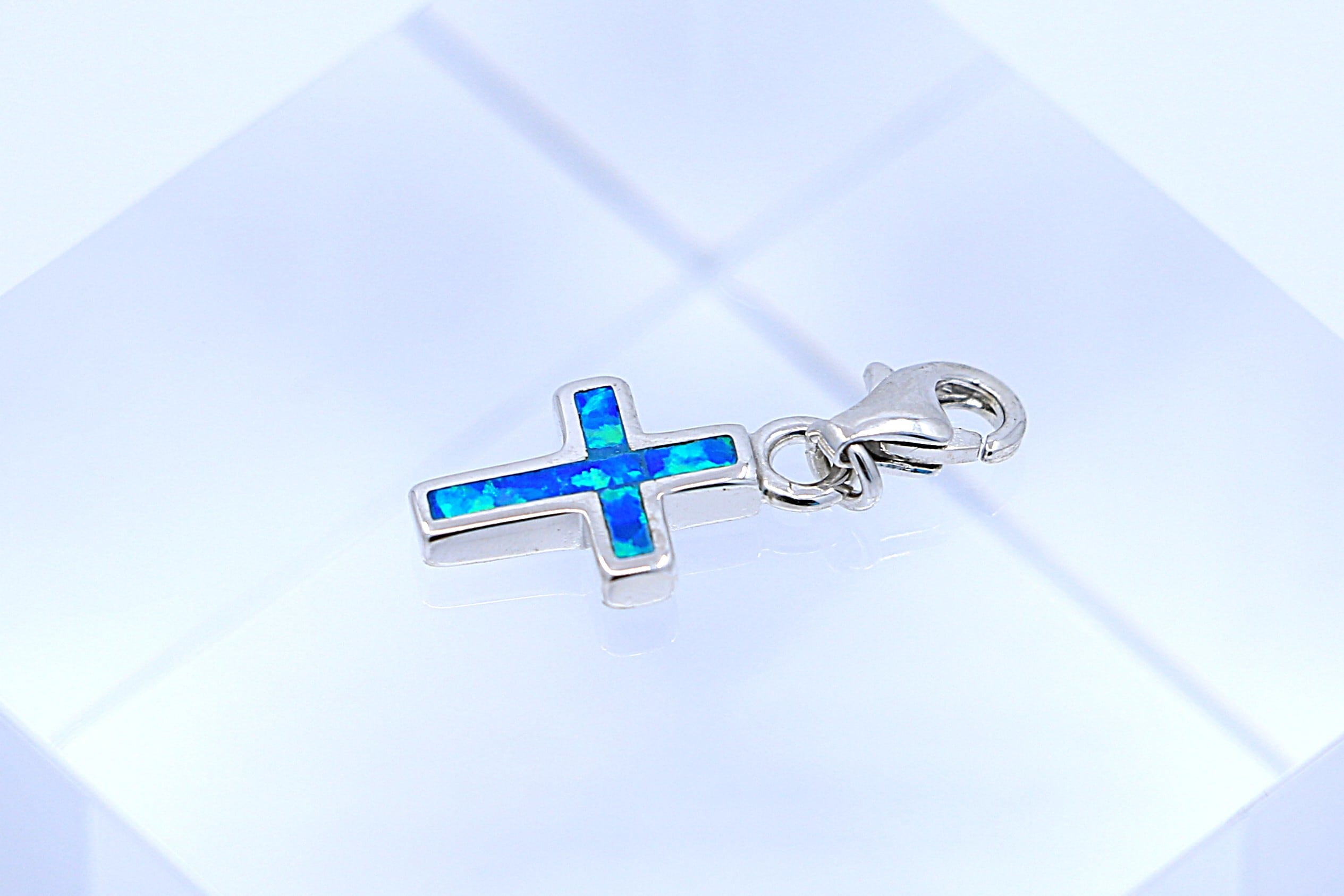 クロスの表面にブルーオパールをあしらい、光の角度で色合いが変わる神秘的な輝きが手元や首元に華やかさを添えます。Sterling Silver(シルバー925)の柔らかな輝きと組み合わせることで、洗練された存在感を引き立てます。