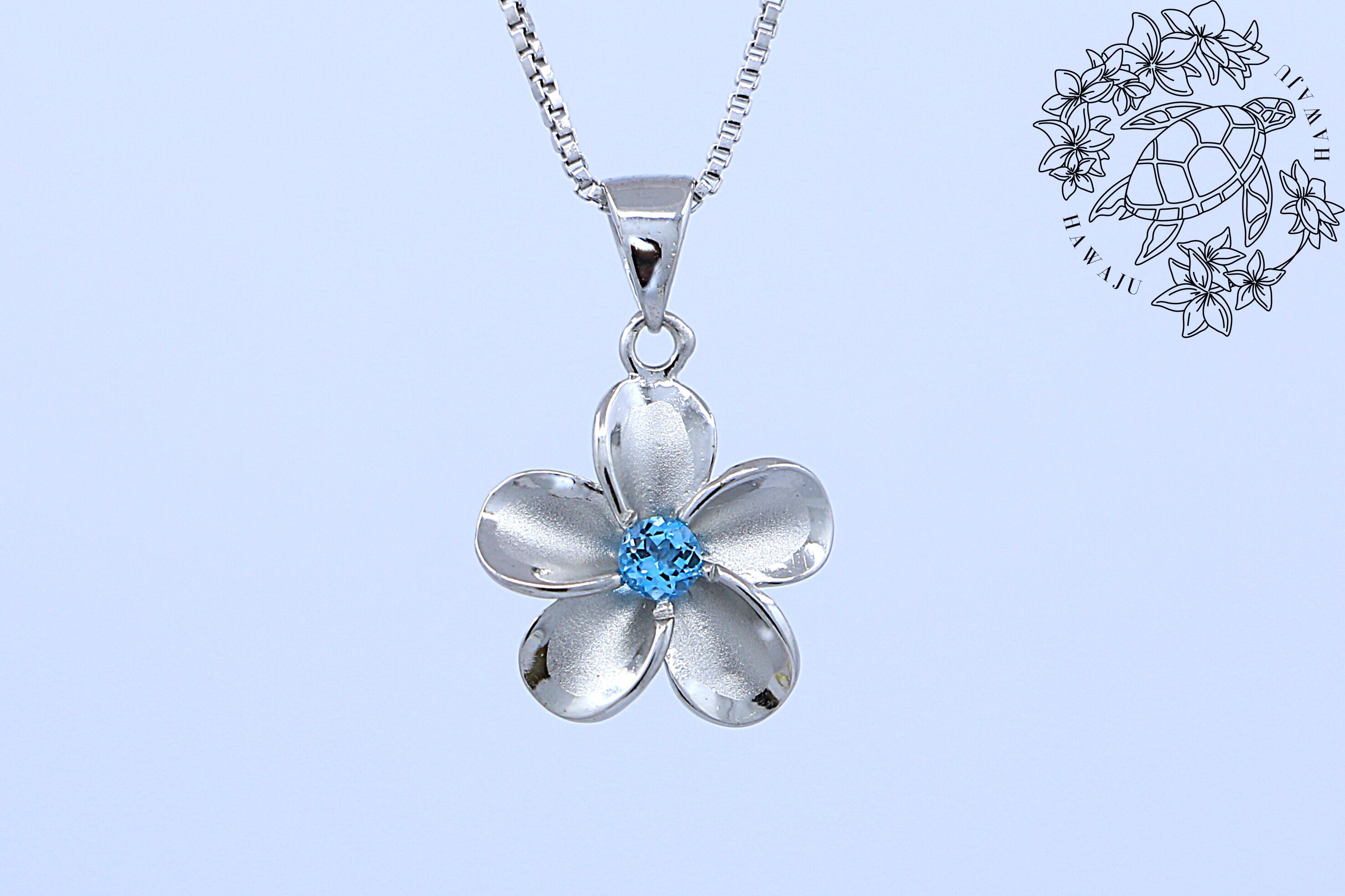 ブルートパーズの清らかな輝きを宿したフラワーモチーフのペンダントトップが、胸元にやさしく華やぎを添えます。ハワイの自然と文化を感じながら、特別な瞬間を彩るジュエリーとしてお楽しみください。