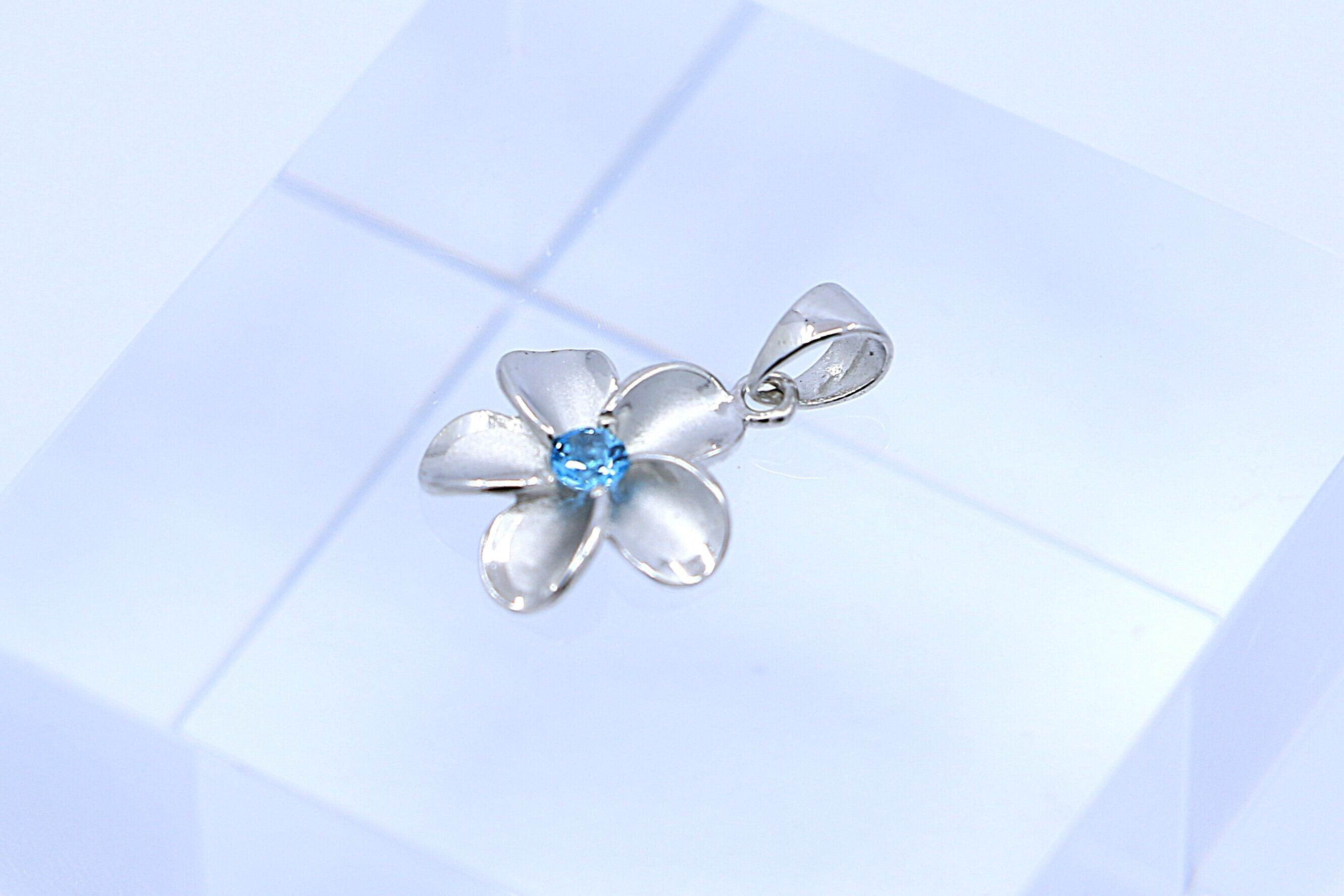 このペンダントトップは、ハワイアンジュエリーの特徴的なデザインであるフラワーモチーフをあしらった、上品で華やかなアイテムです。花の中央には美しいブルートパーズが輝き、光を受けるたびに爽やかで神秘的な印象を与えます。Sterling Silver(シルバー)の柔らかな輝きと組み合わせることで、洗練された存在感を引き立てます。シンプルながらも存在感があり、カジュアルにもフォーマルにも合わせやすいデザインです。
