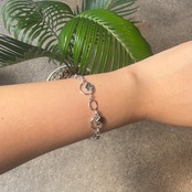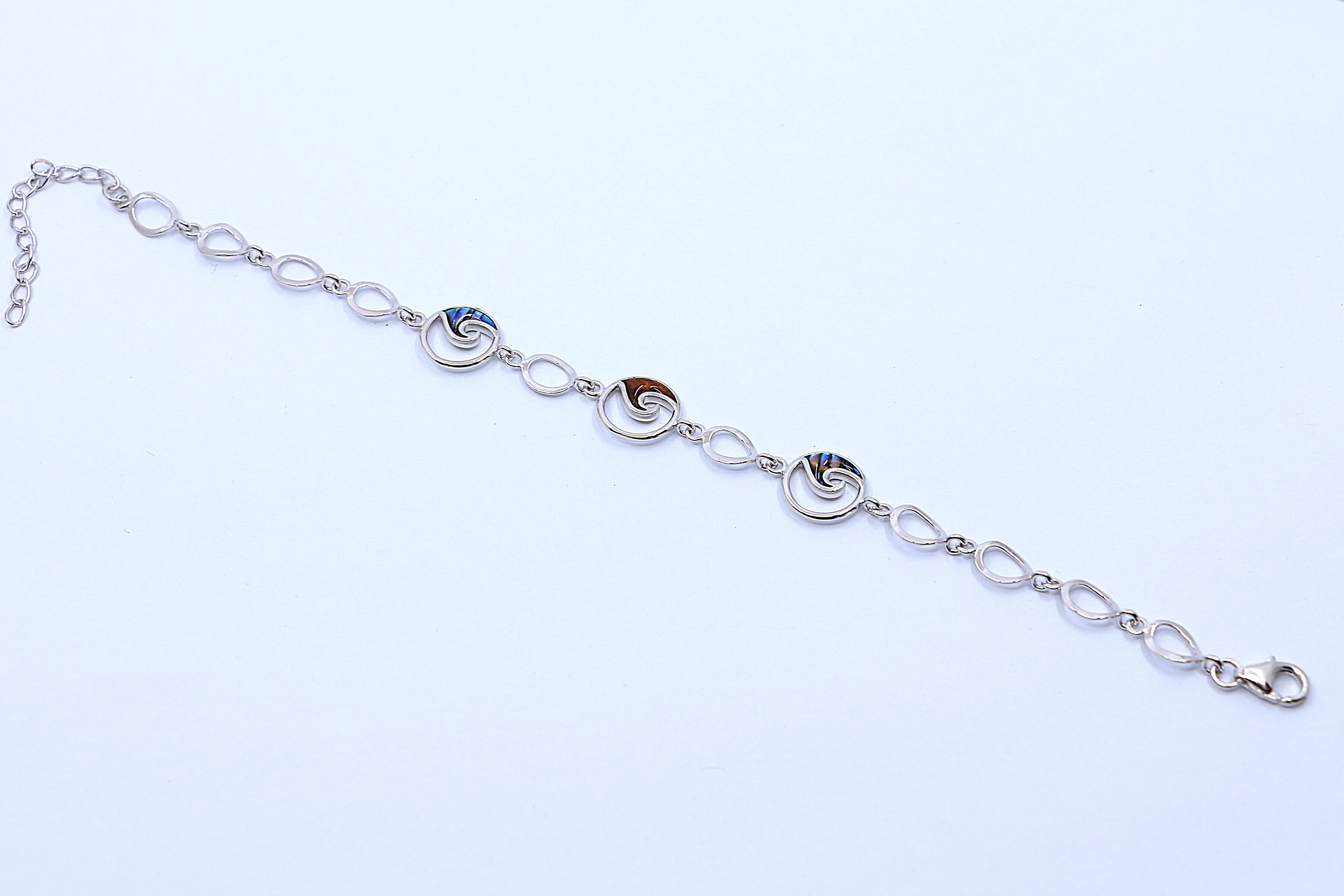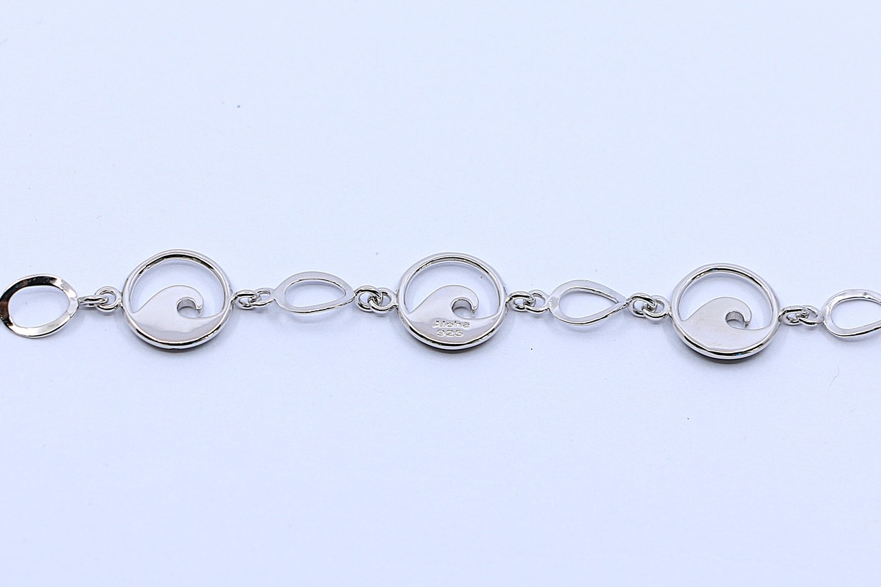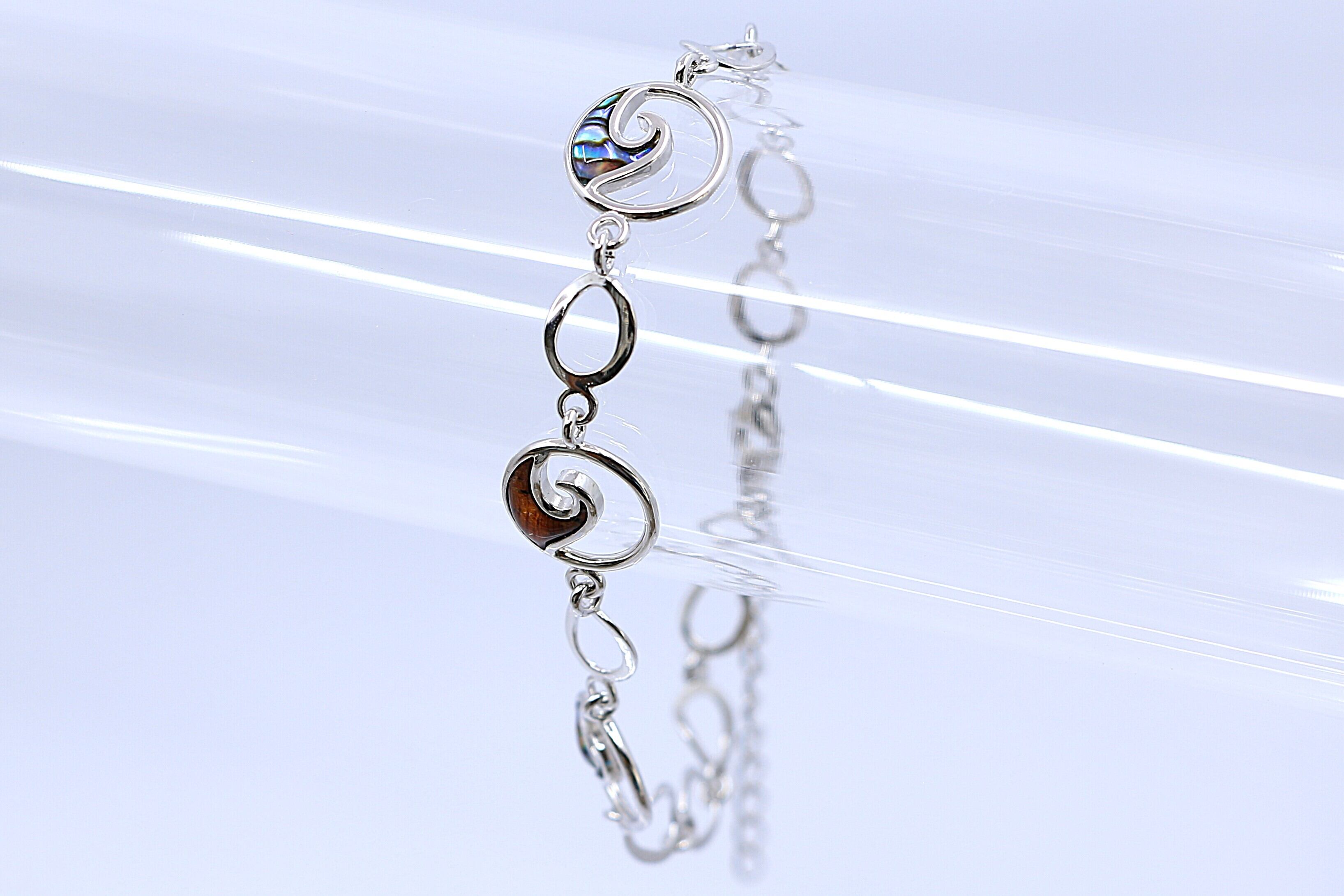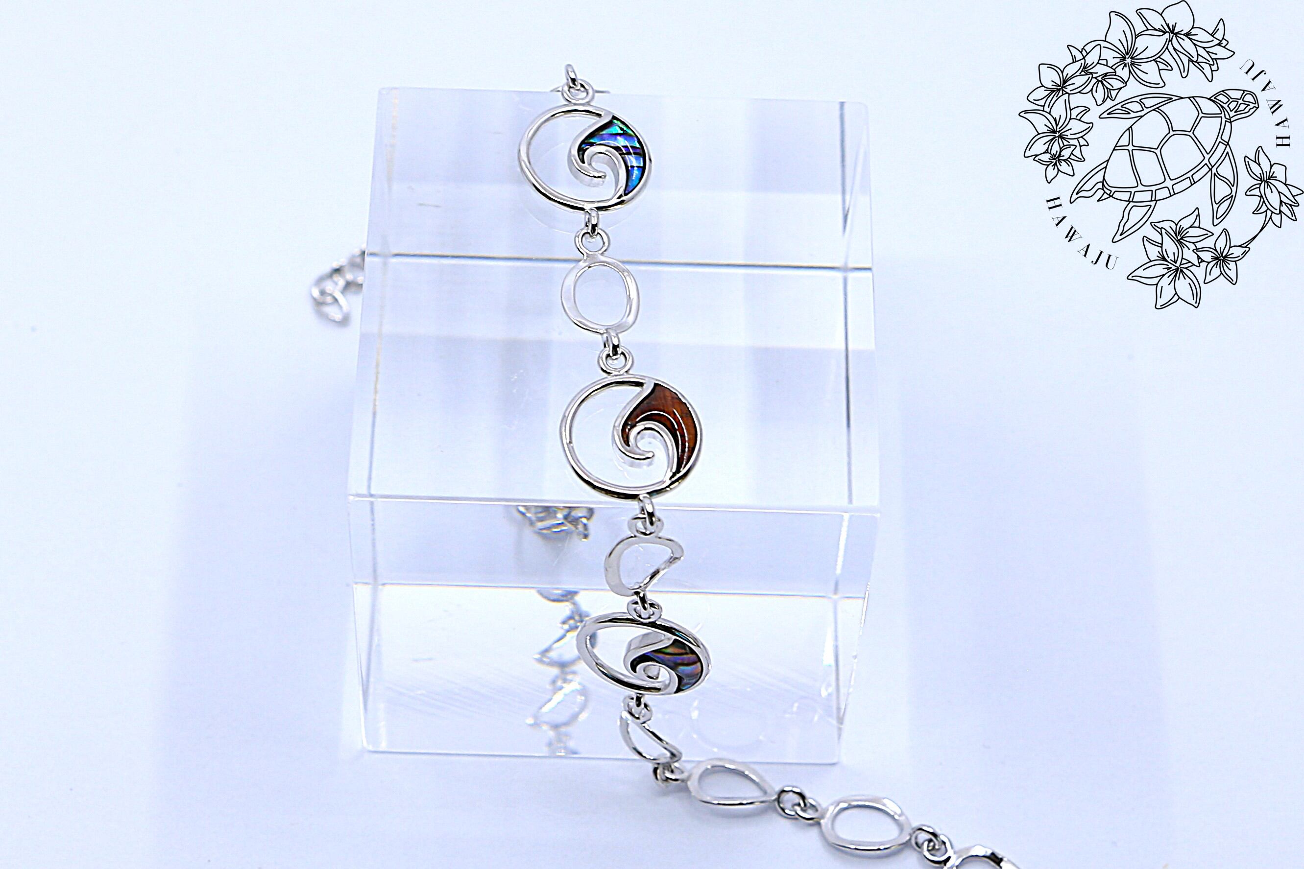 このブレスレットは、優雅なウェーブ(波)モチーフを3連に連ね、自然素材であるコアウッドとシェルを組み合わせた美しいハワイアンジュエリーです。シルバー素材のチェーンと、深みのあるコアウッド、そして光を受けて優しく輝くシェルが調和し、手元に温もりと上品な輝きを添えます。波モチーフは、ハワイ文化において「永遠」「再生」「生命の流れ」を象徴し、このブレスレットには海と大地の持つパワーと癒しの意味が込められています。