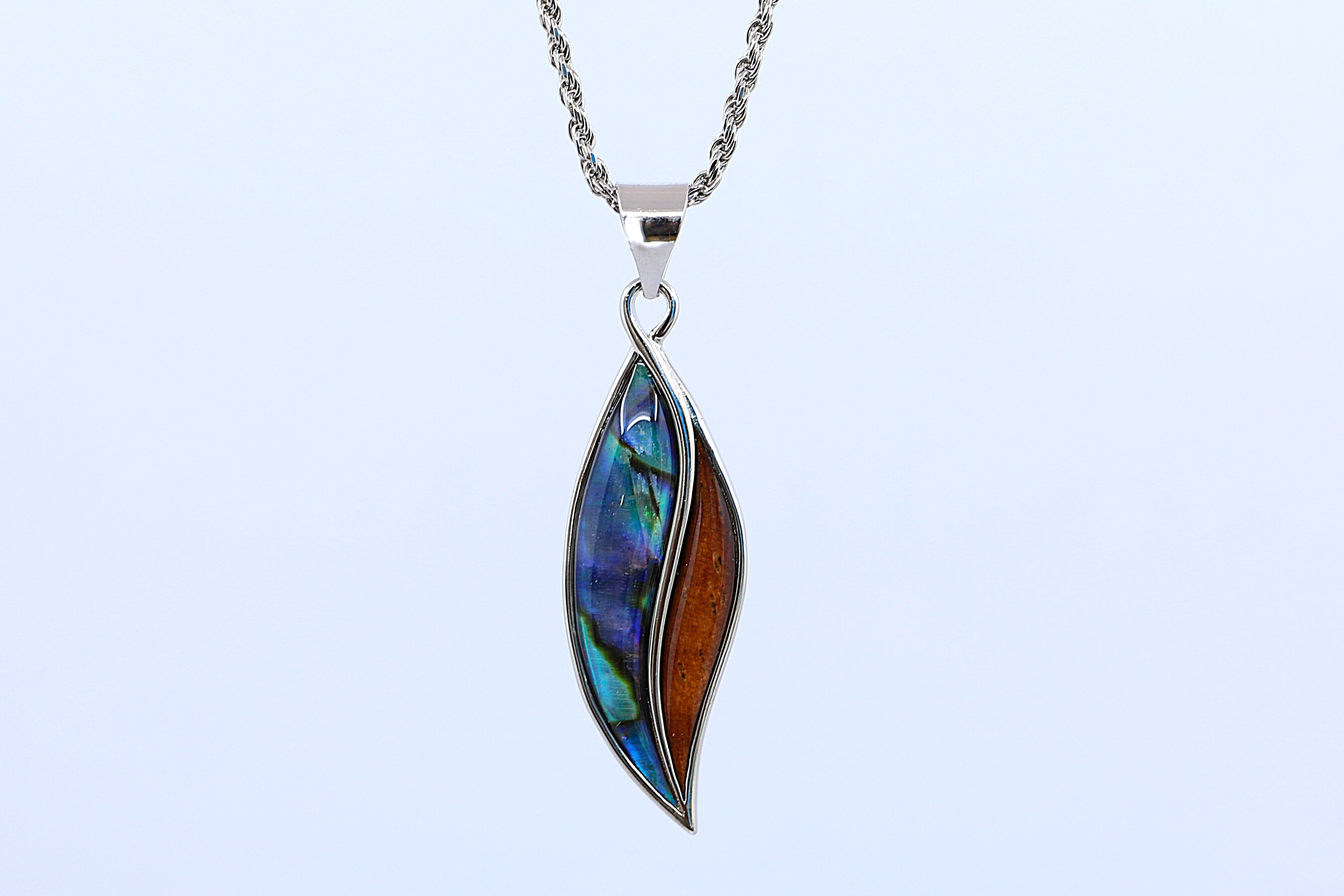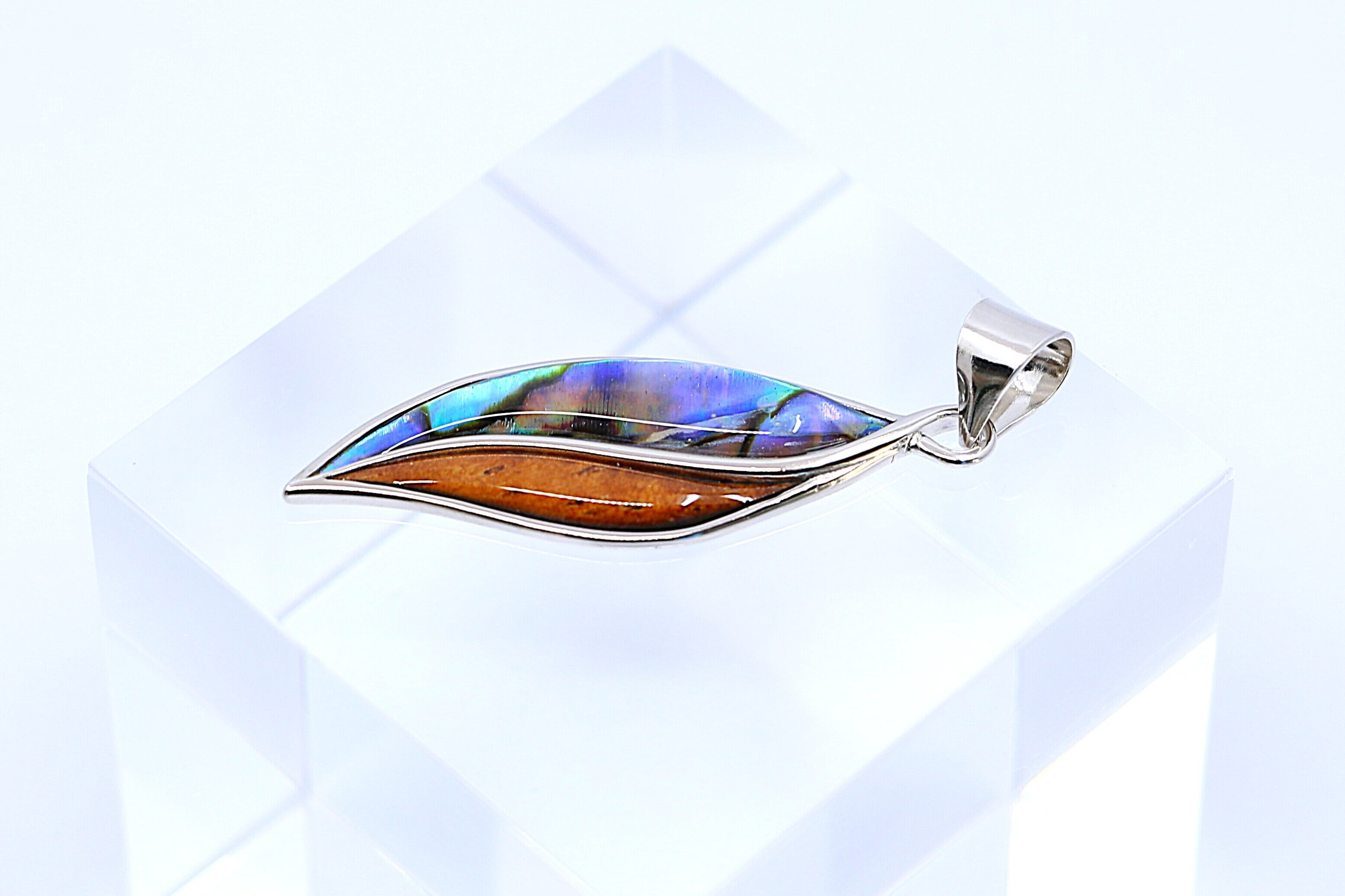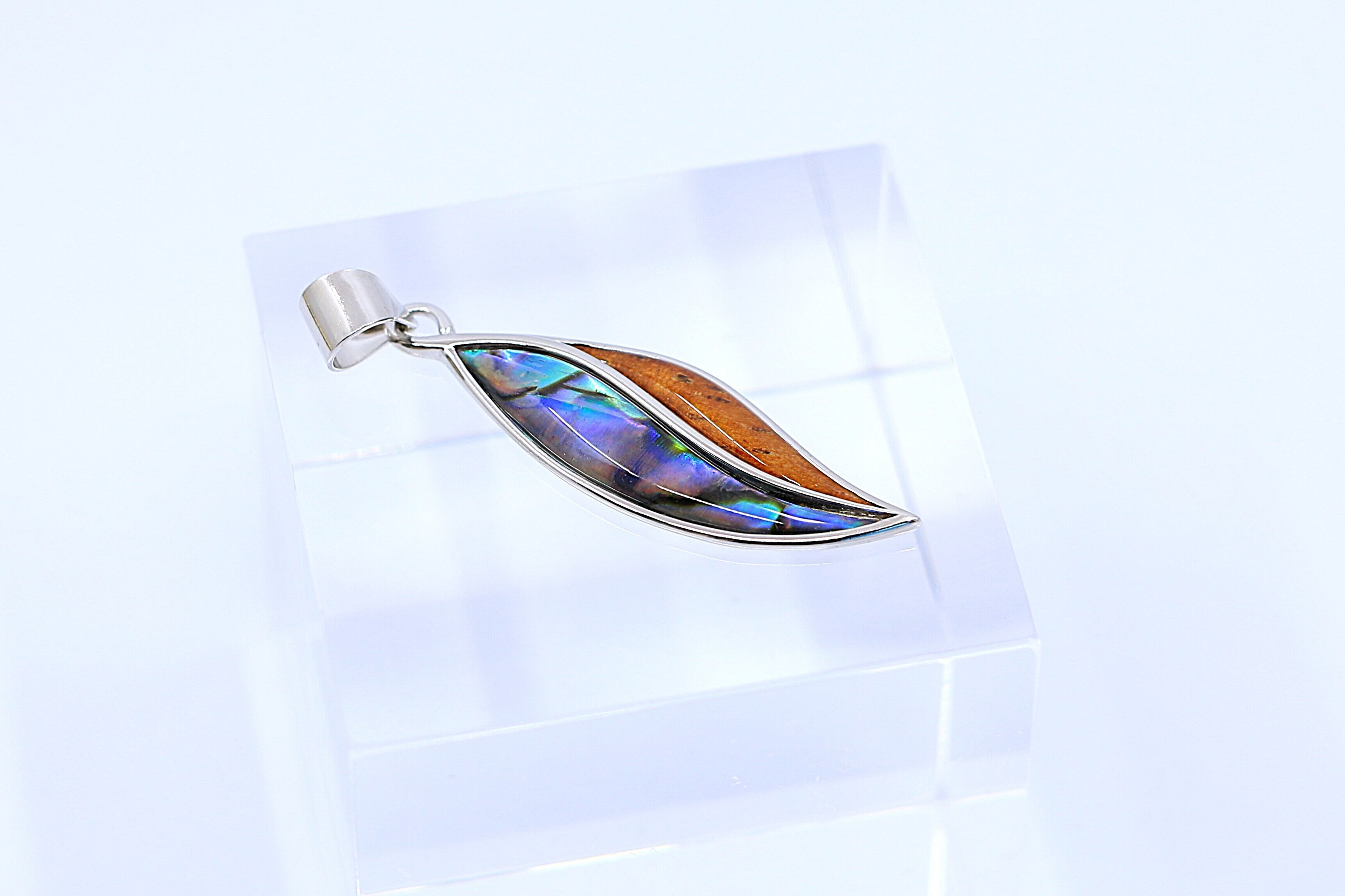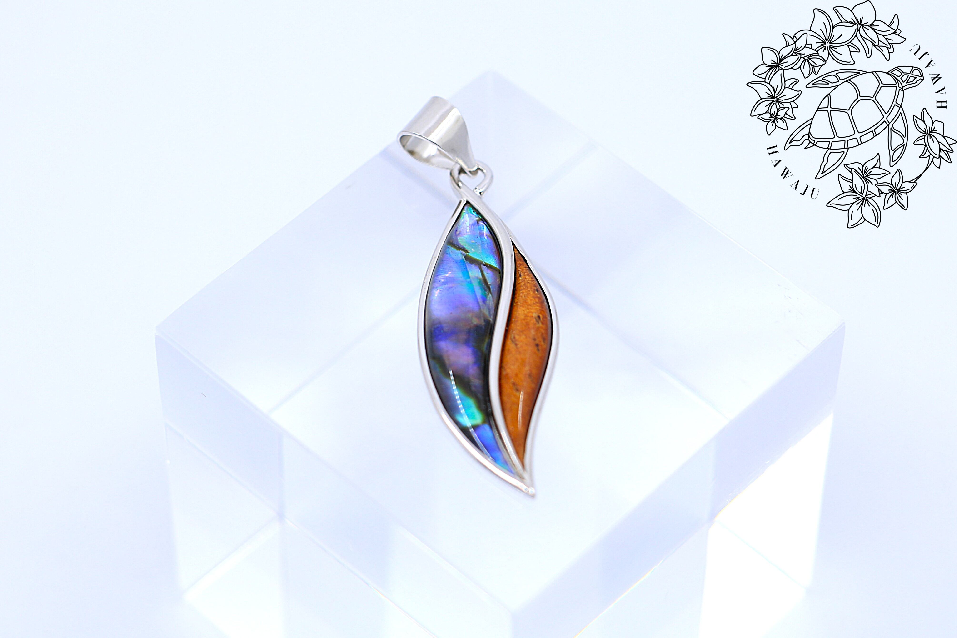 このペンダントトップは、ハワイで神聖な存在とされるリーフ(葉)モチーフをデザインに取り入れ、左右で異なる自然素材――深みのあるコアウッドと、虹色に輝くシェルを組み合わせた特別なハワイアンジュエリーです。Sterling Silverの美しい輝きが、天然素材の個性を際立たせ、胸元に洗練された存在感を添えます。