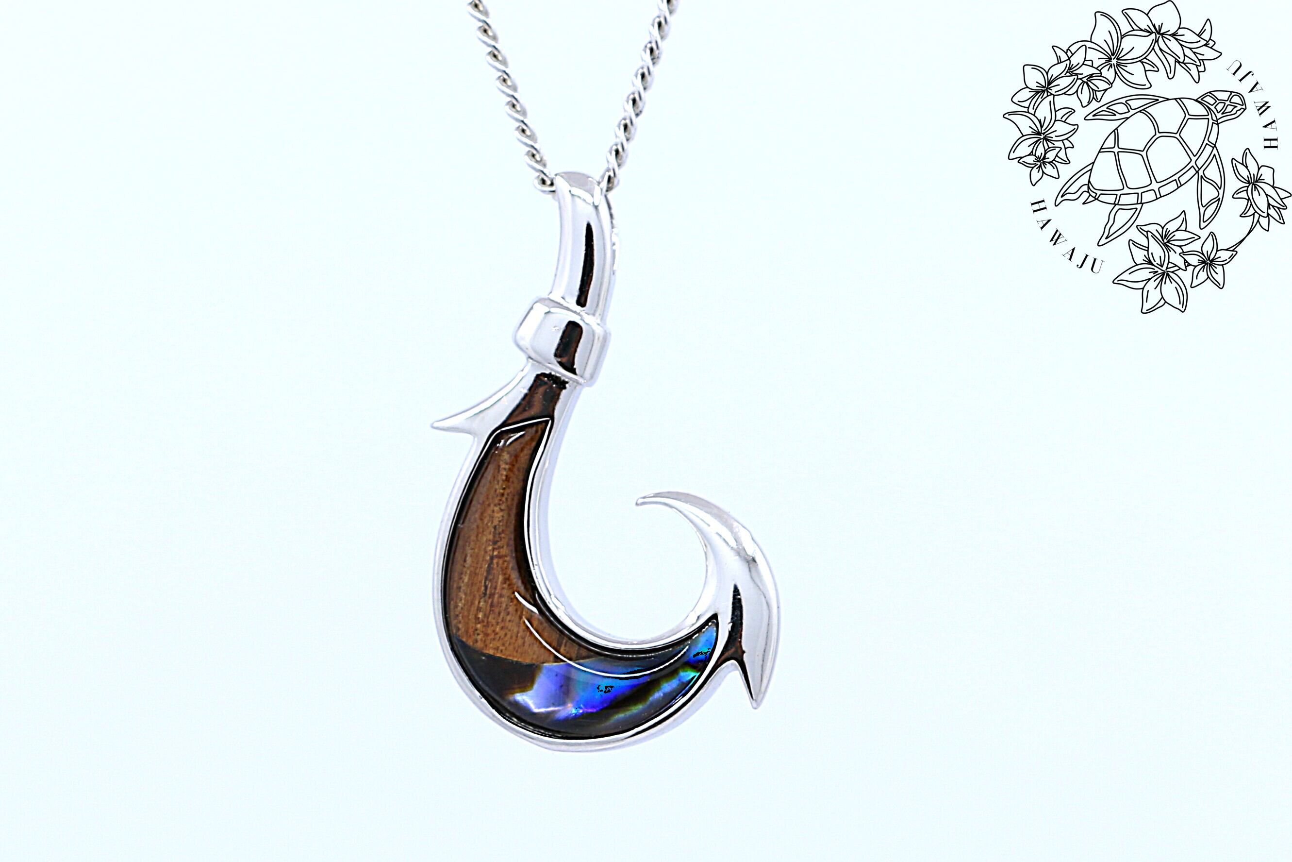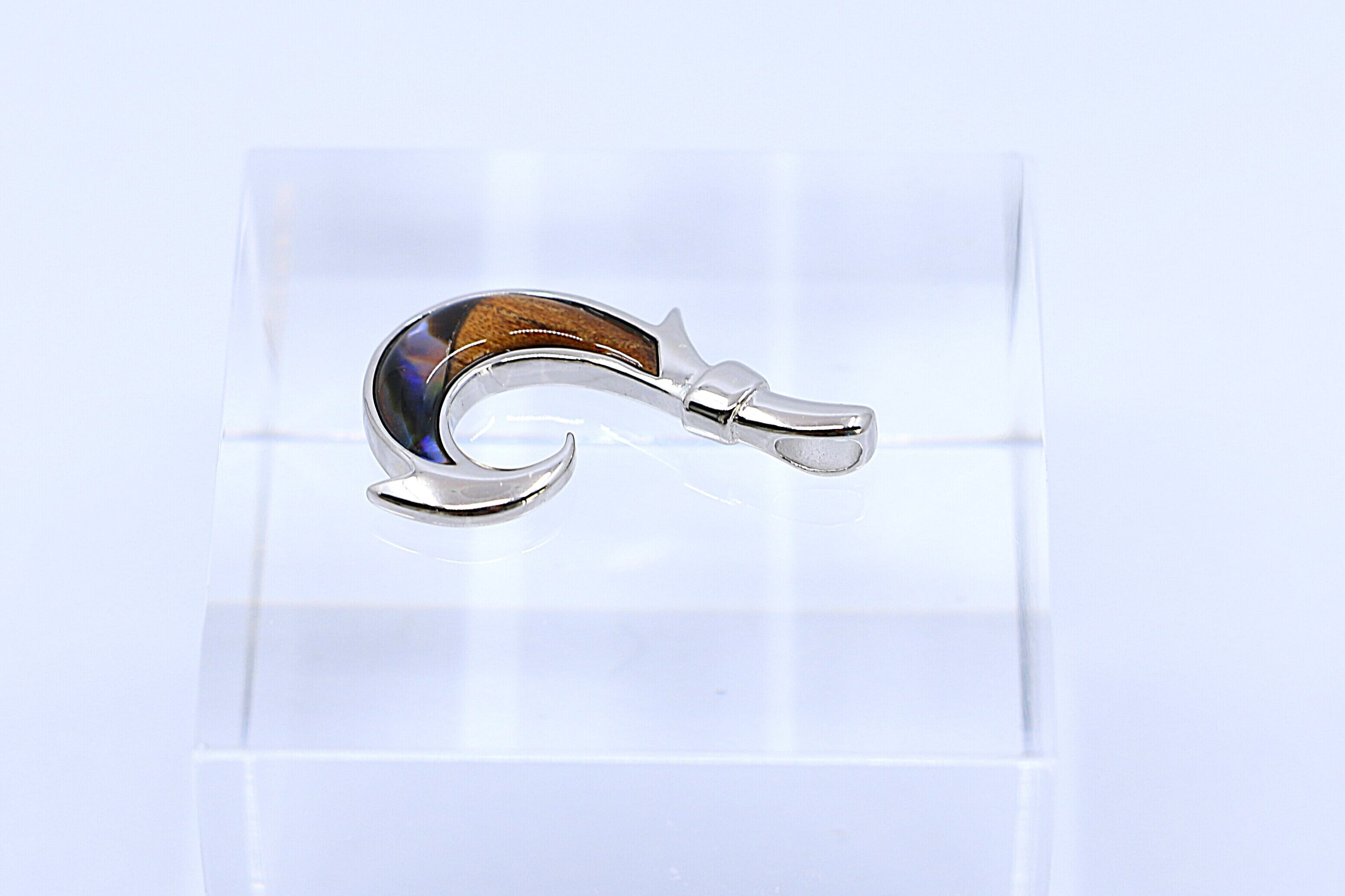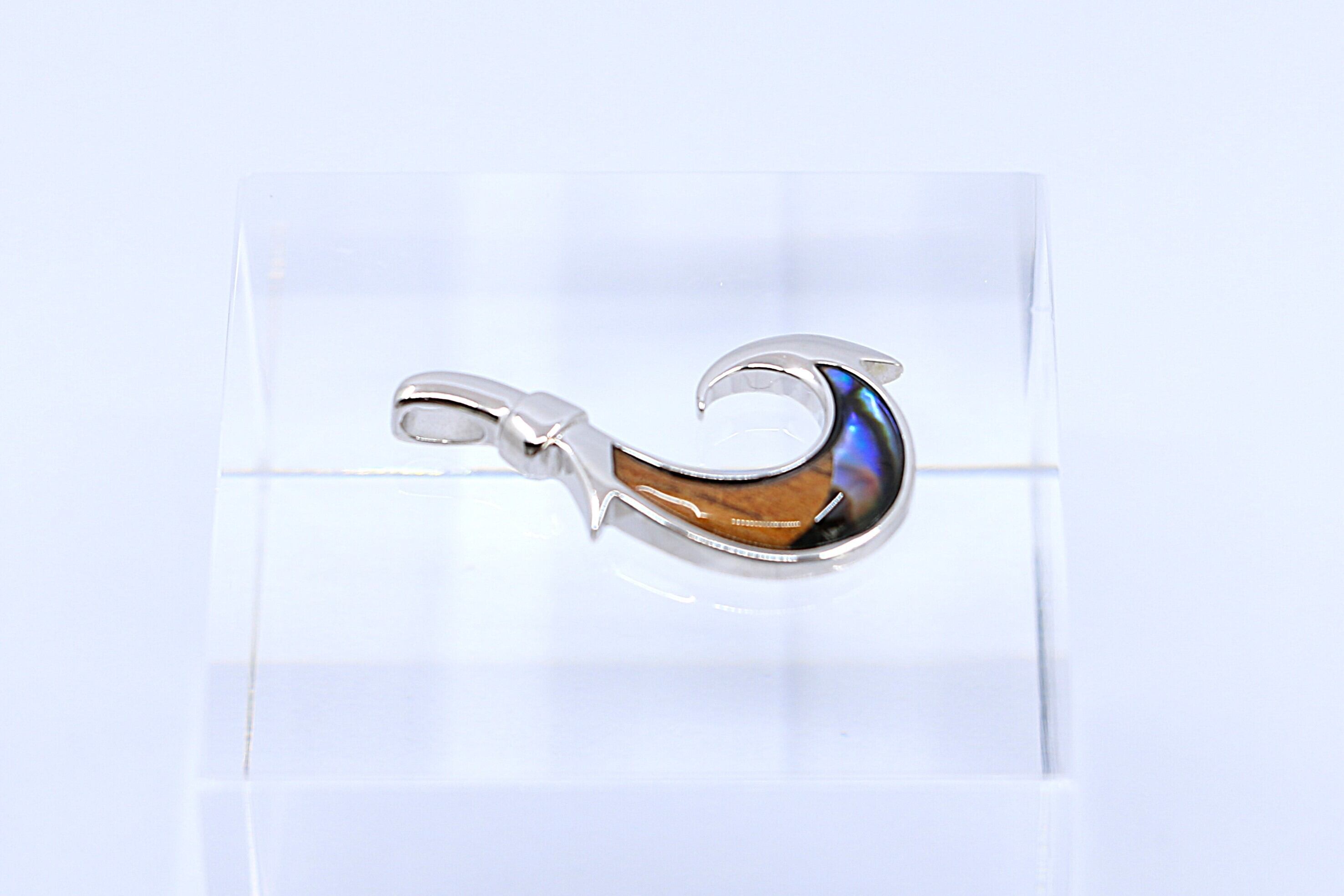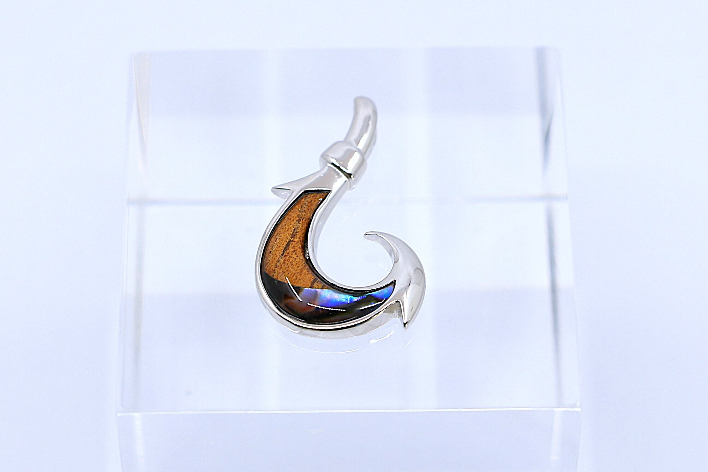このペンダントトップは、ハワイで古くから「幸運」と「繁栄」をもたらすシンボルとされるフィッシュフックモチーフを取り入れ、左右で異なる自然素材――深みのあるコアウッドと、虹色に輝くシェルを組み合わせた特別なハワイアンジュエリーです。Sterling Silverの美しい輝きが、天然素材の個性を際立たせ、胸元に力強くも洗練された存在感を添えます。※こちらの商品はペンダントトップのみで、チェーンは付属しておりません。