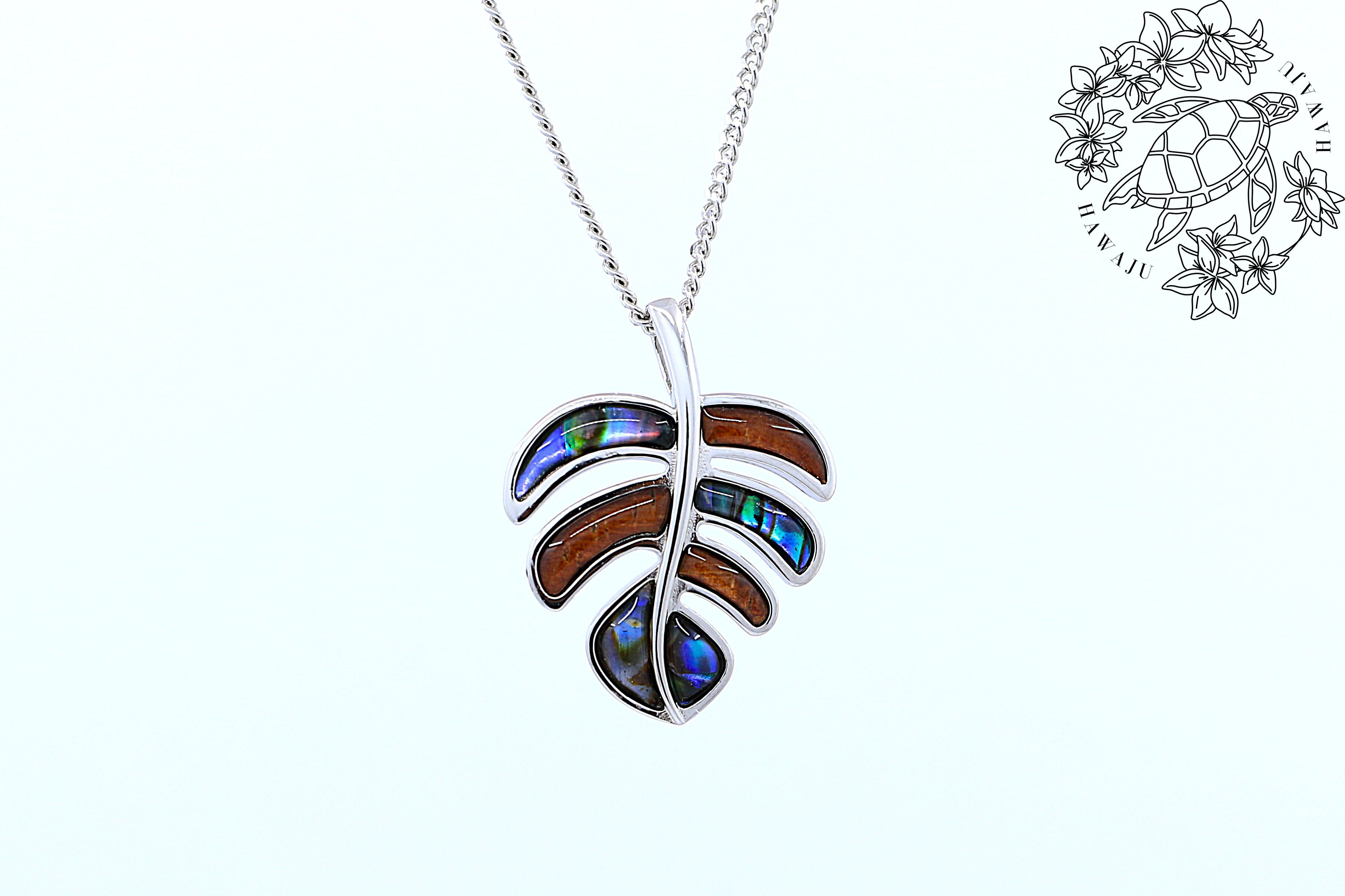 このペンダントトップは、ハワイで「繁栄」「尊敬」「絆」を象徴するモンステラモチーフをデザインに取り入れ、天然素材の コアウッド と シェル がランダムに施された特別なハワイアンジュエリーです。自然素材の配置はひとつひとつ異なり、同じものが二つとない唯一無二の表情を楽しめます。Sterling Silverの美しい輝きがその個性を引き立て、胸元に華やかで洗練された存在感を添えます。