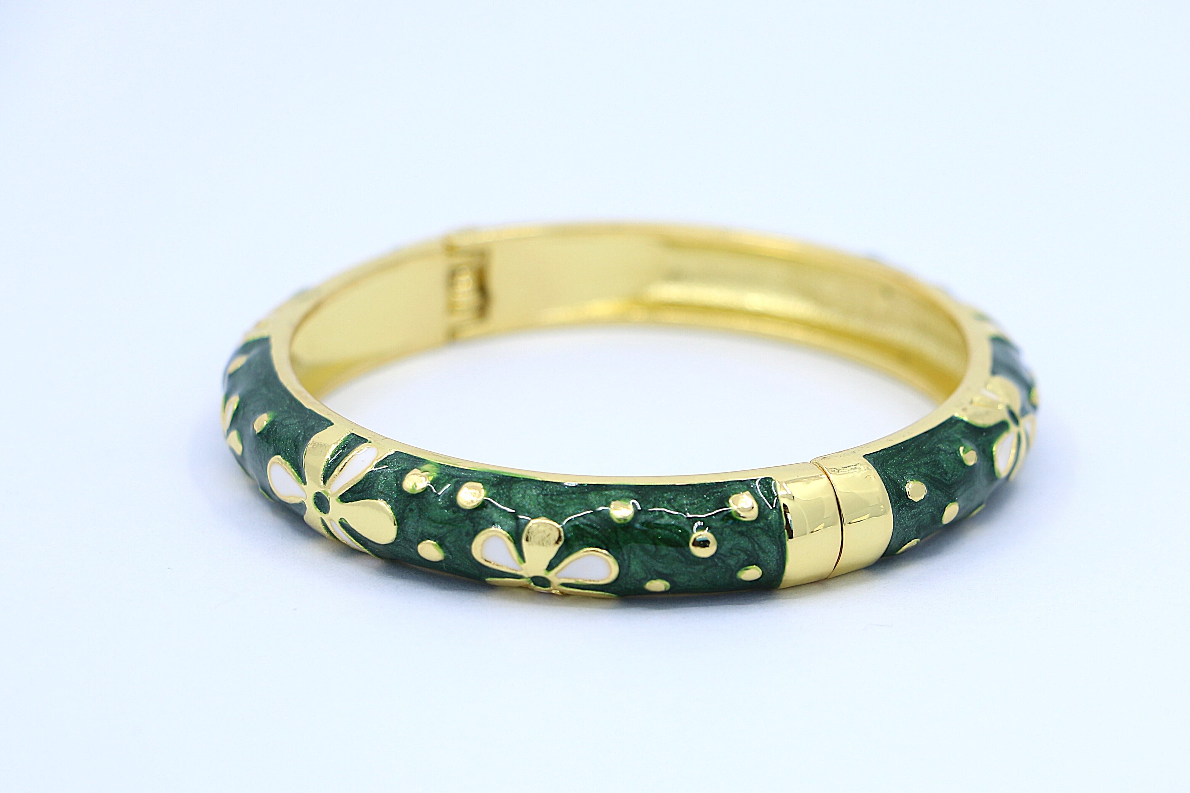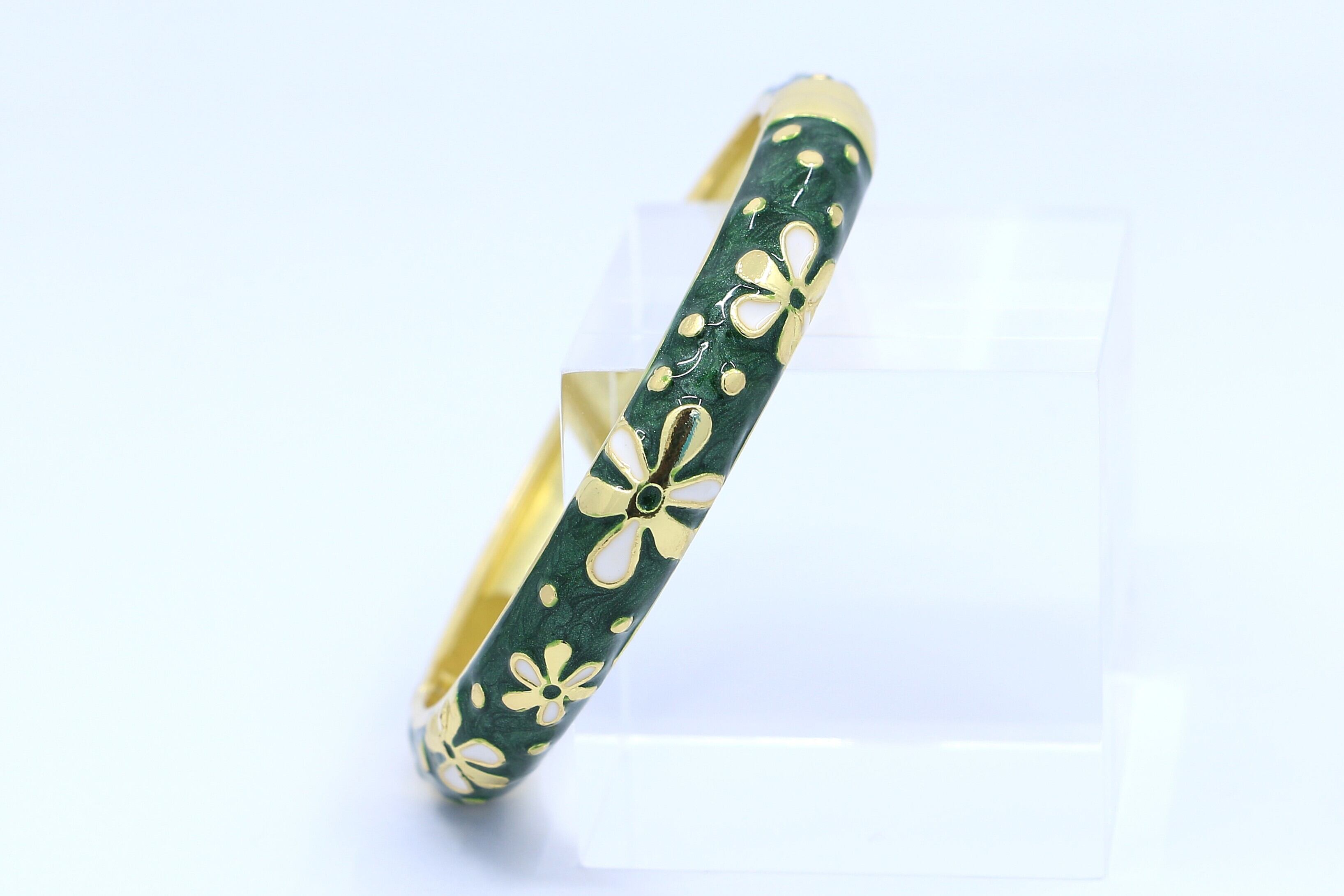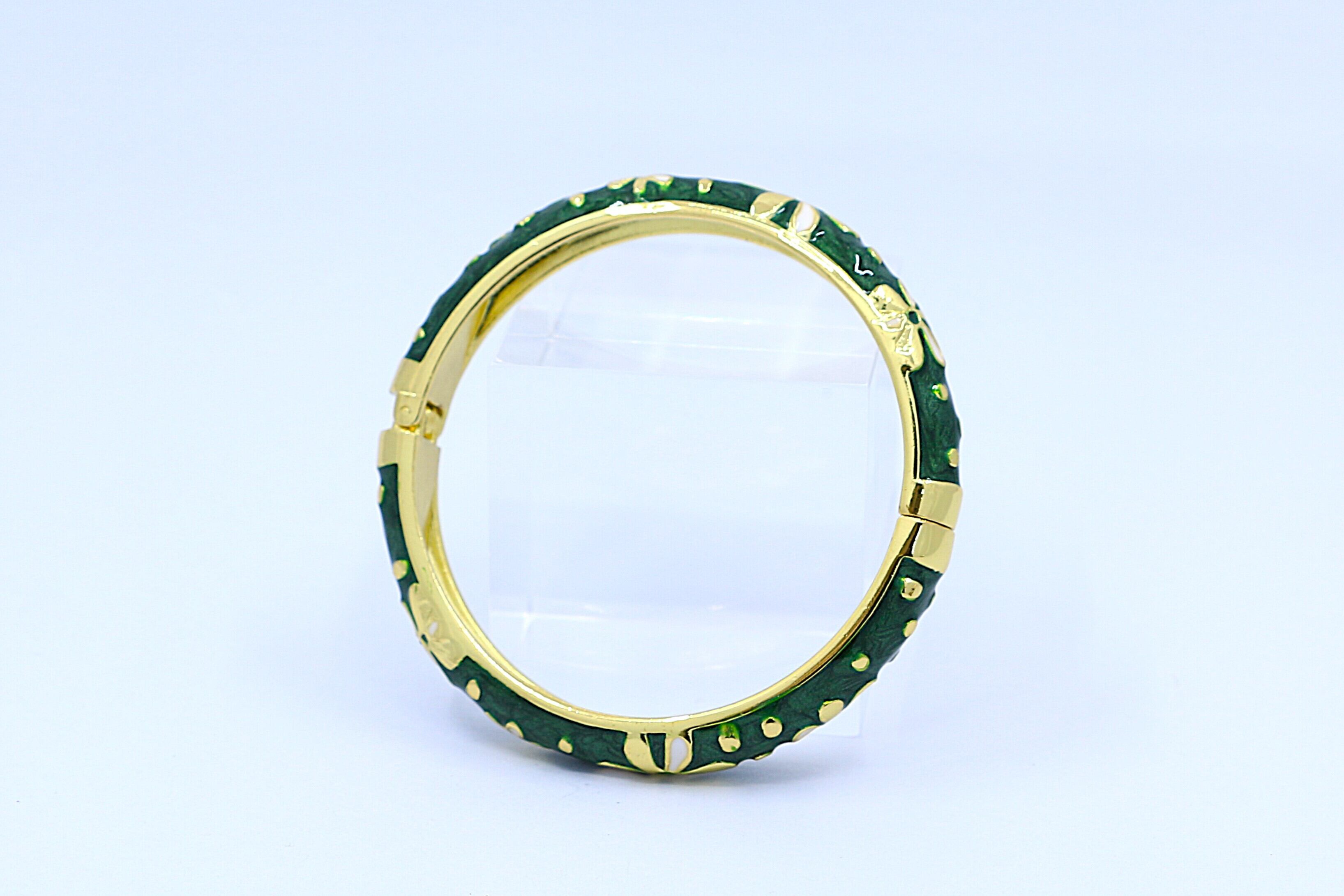 ハワイを象徴する ティアレモチーフ をデザインに取り入れた、美しいバングルです。合金素材にゴールドカラーのコーティングを施し、グリーンのエナメルの上でティアレの花が華やかに映えます。手元に洗練された輝きと南国らしいトロピカルな雰囲気を添えるアイテムです。