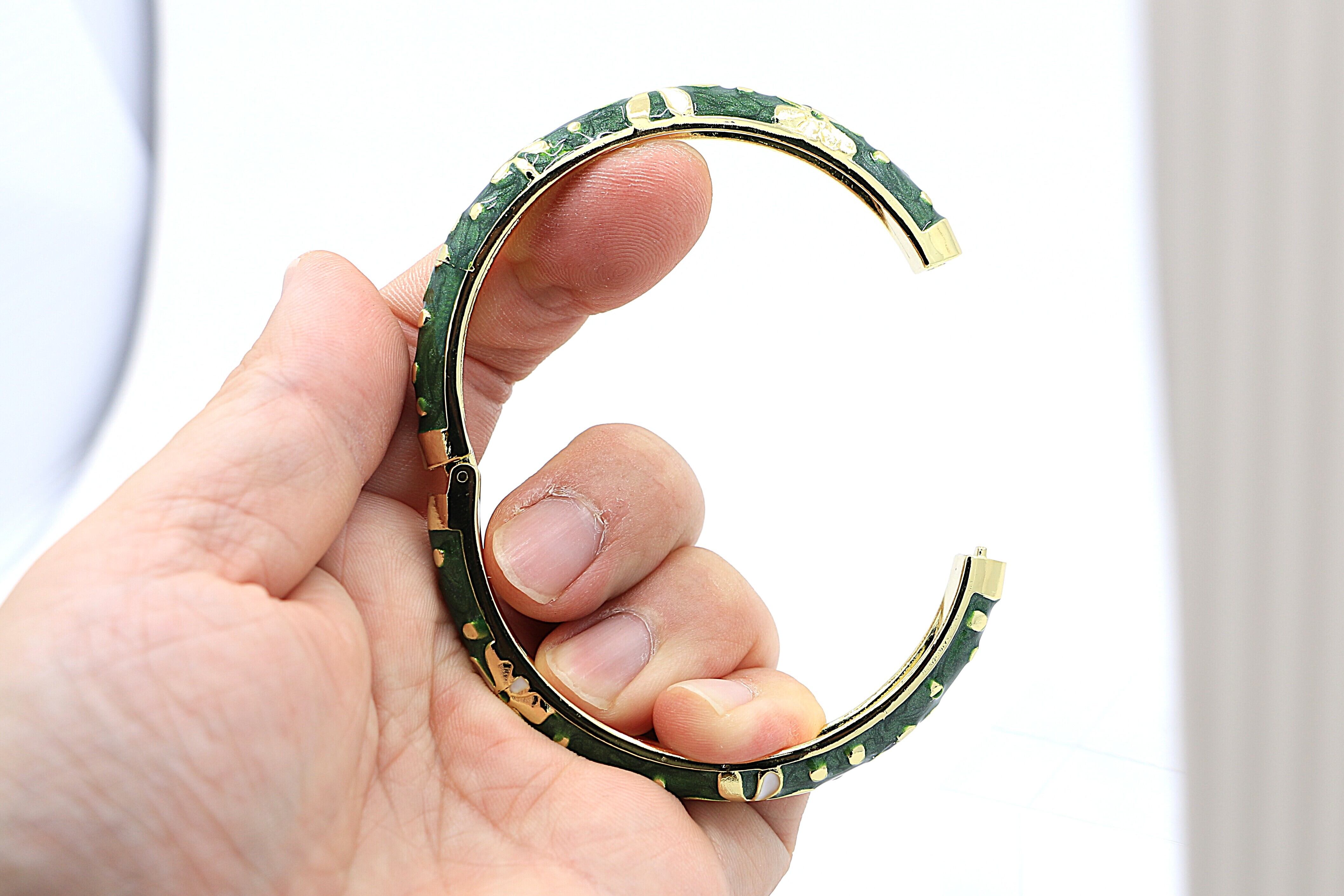 軽量で耐久性のある合金を使用しており、日常使いにも安心。ゴールドカラーのコーティングとグリーンエナメルのコントラストが、トロピカルで上品な印象を引き立てます。