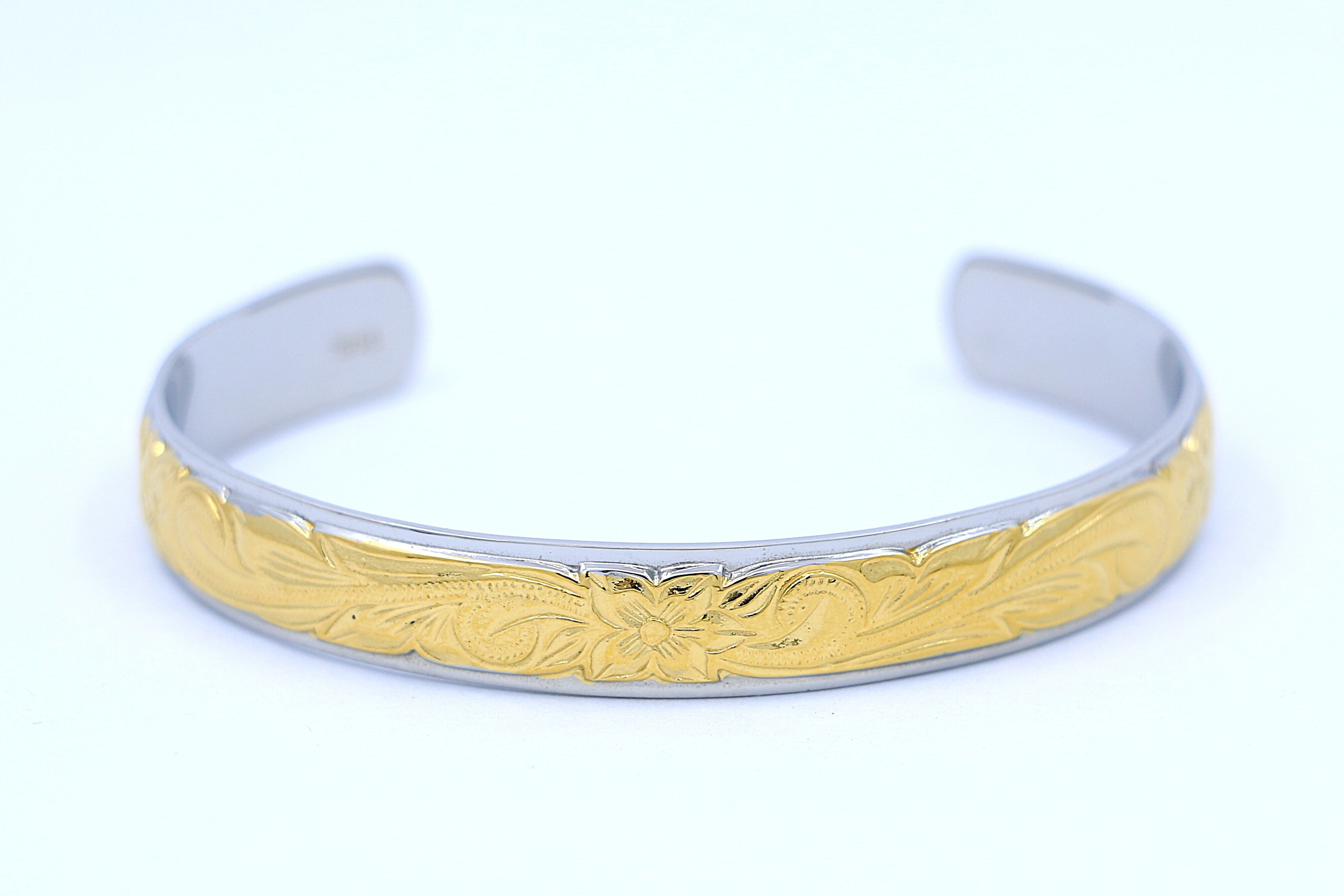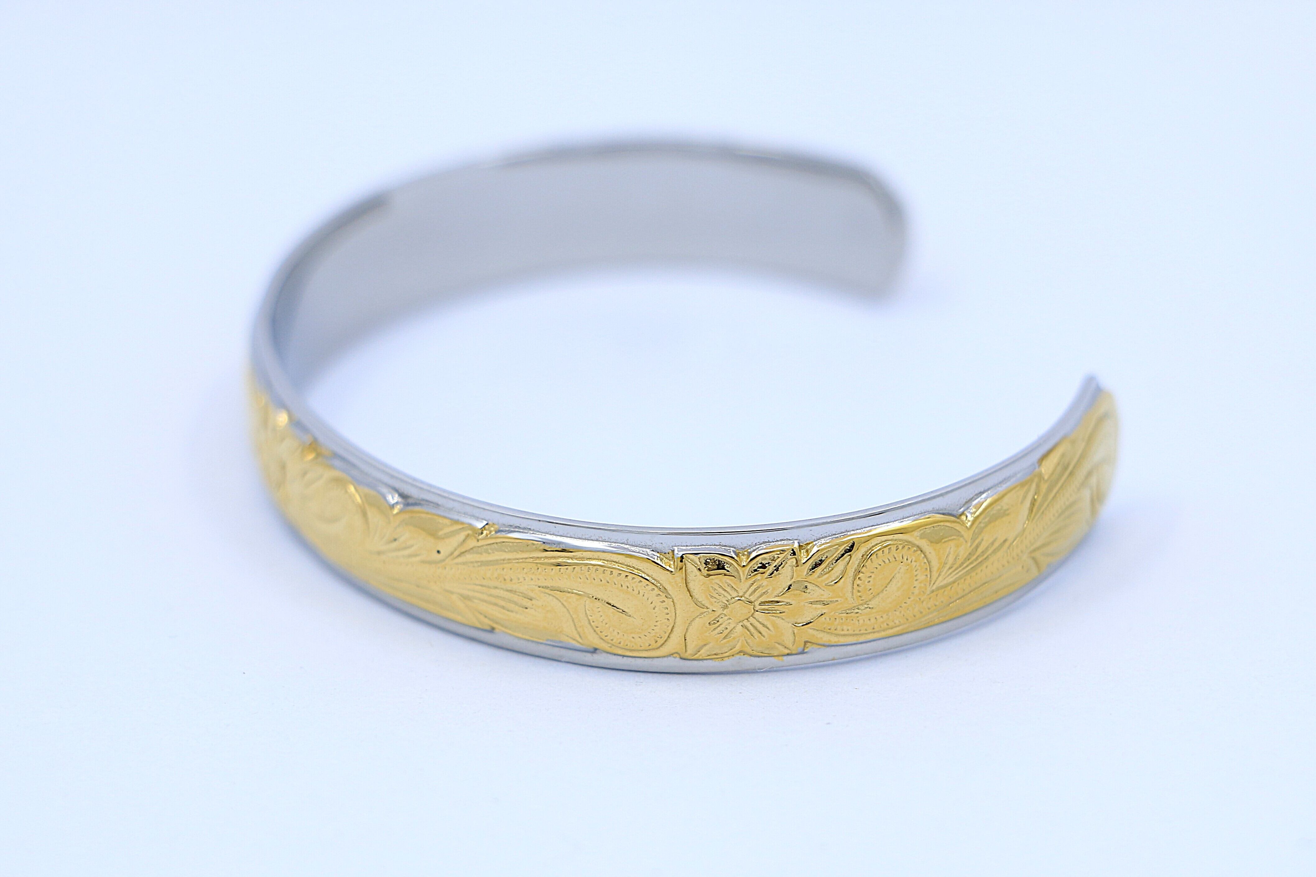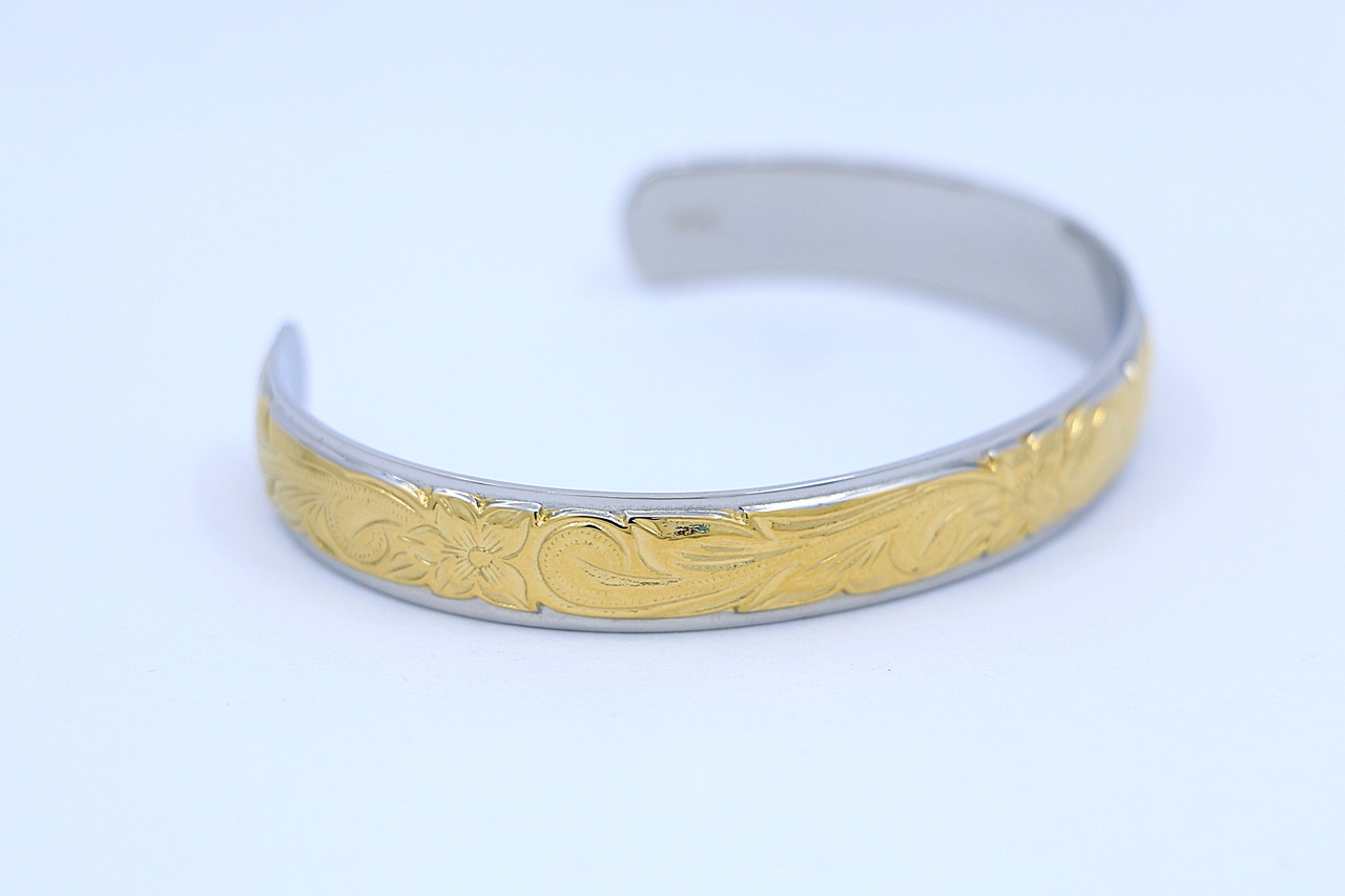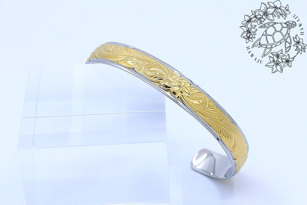 このバングルは、ハワイアンジュエリーを象徴する ヘリテイジ柄 を丁寧に刻み込んだ特別なアイテムです。