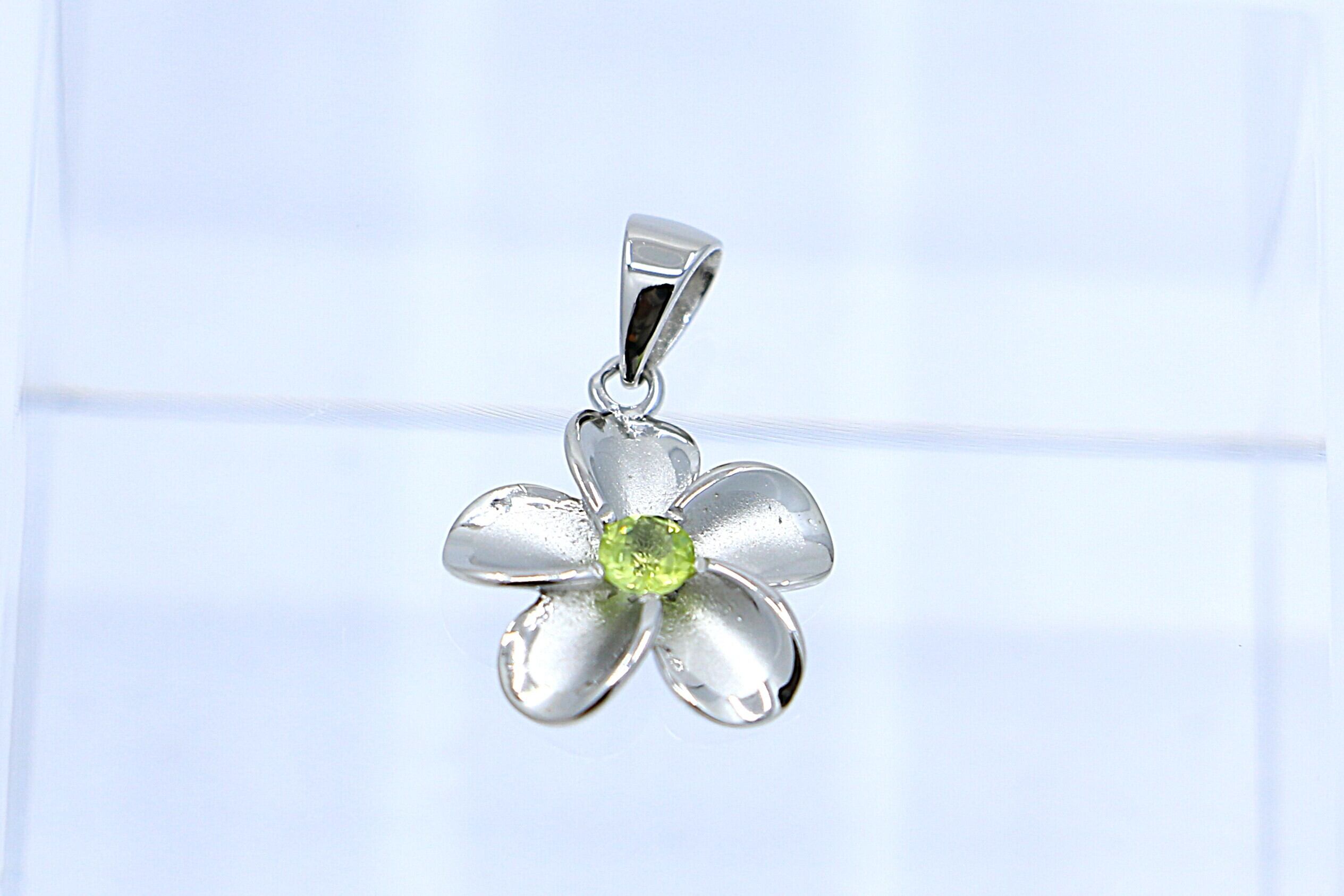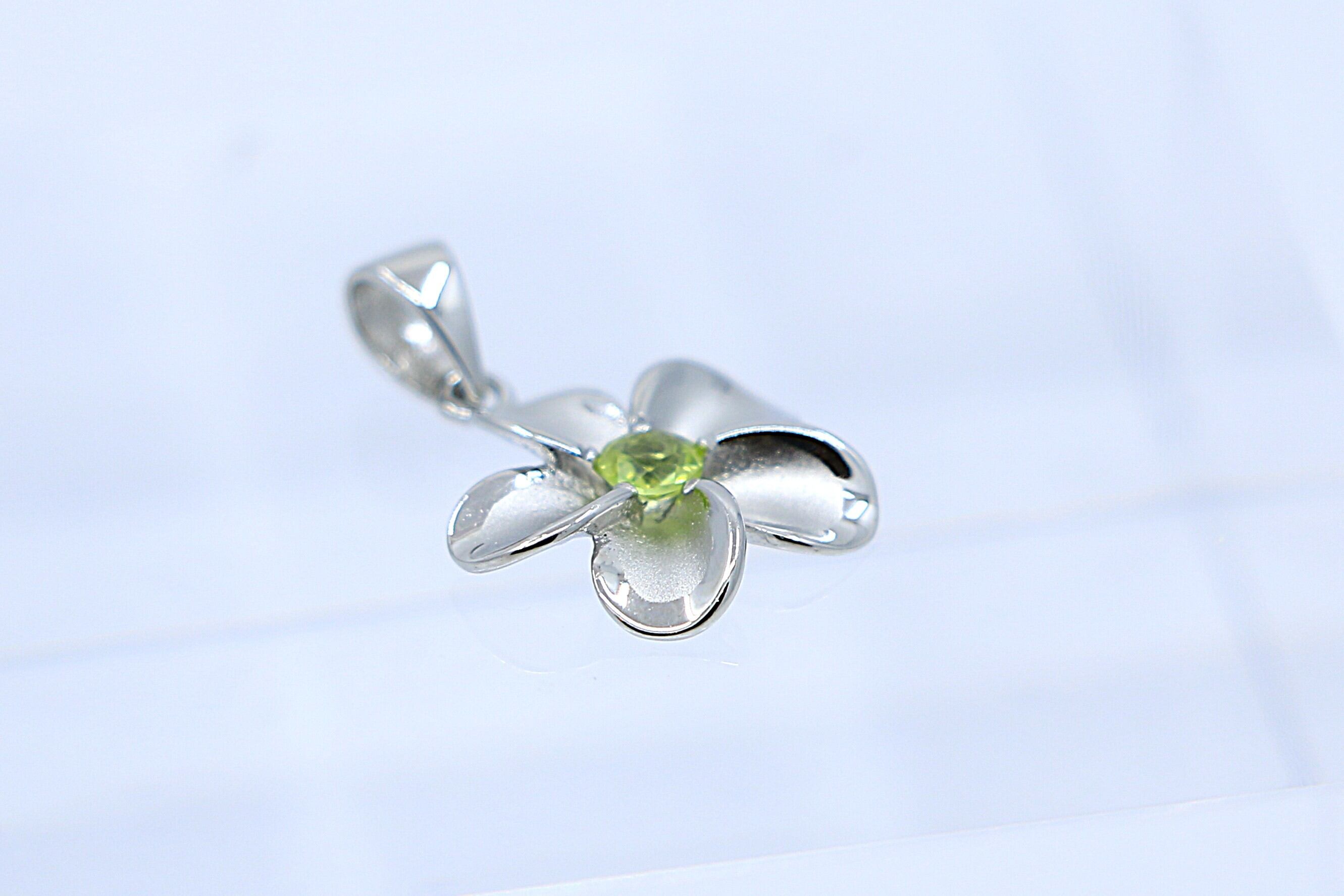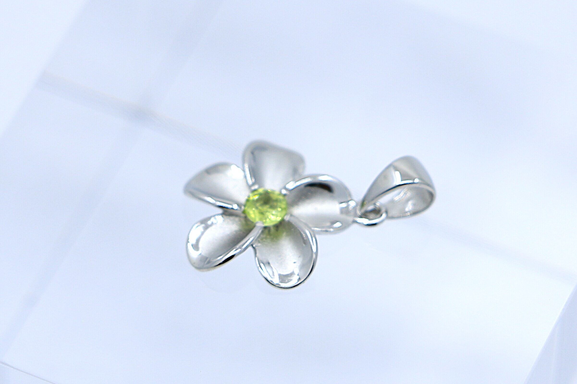 鮮やかなグリーンのペリドットが中央に輝くフラワーモチーフのペンダントトップは、胸元にやさしく華やぎを添えます。ハワイの自然と文化を感じながら、特別な瞬間を彩るジュエリーとしてお楽しみください。