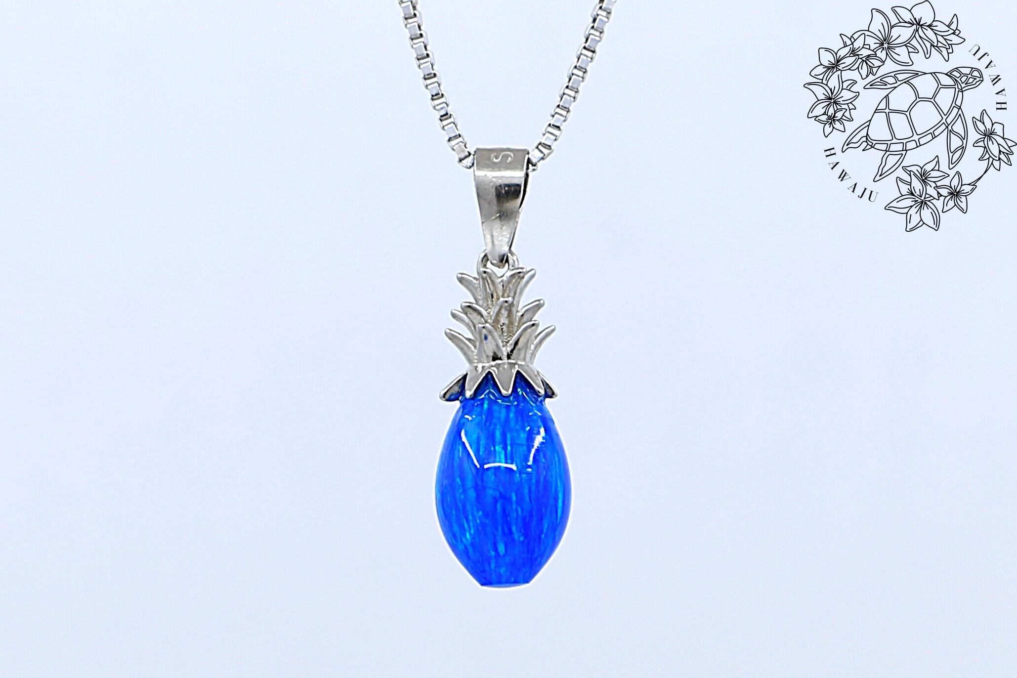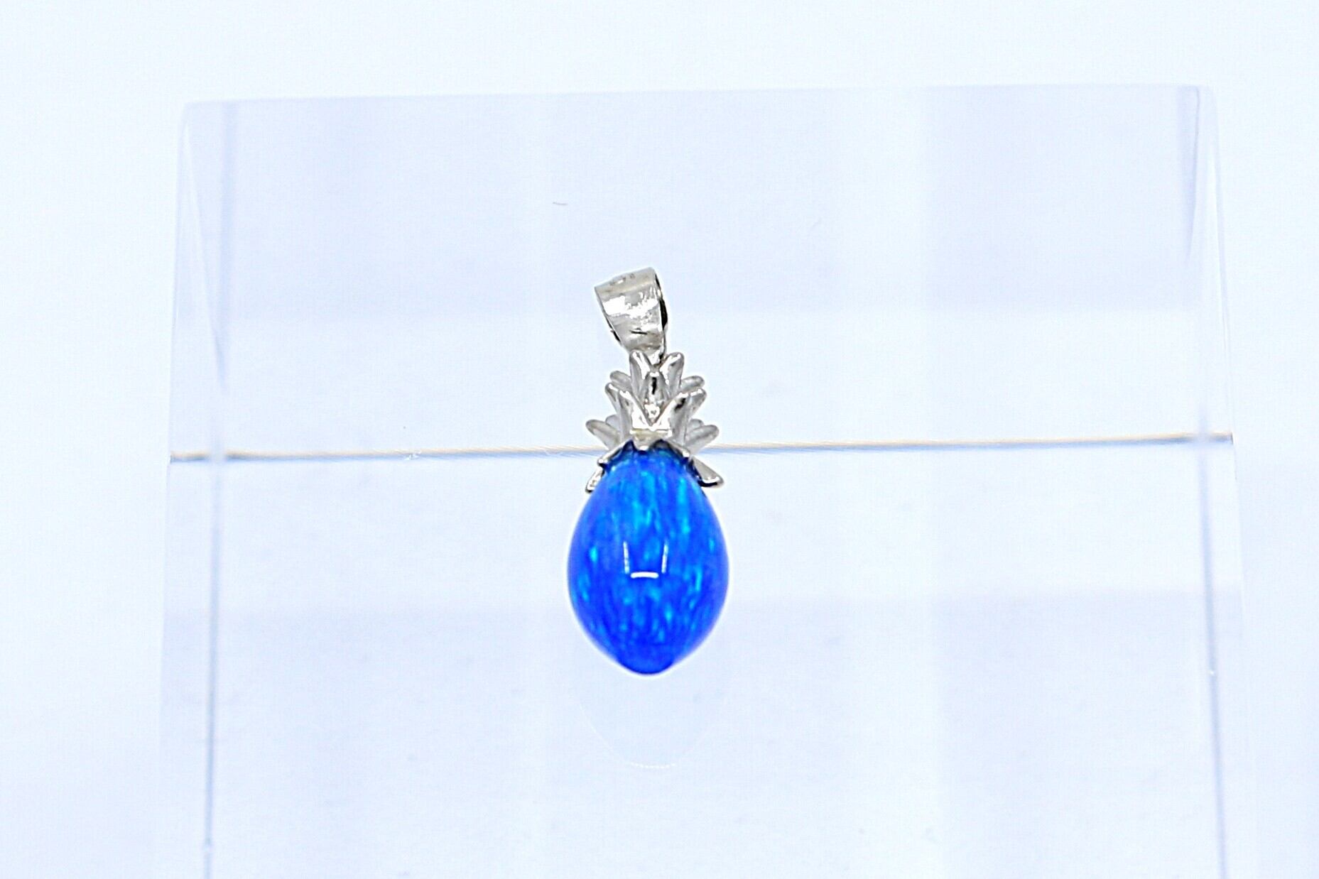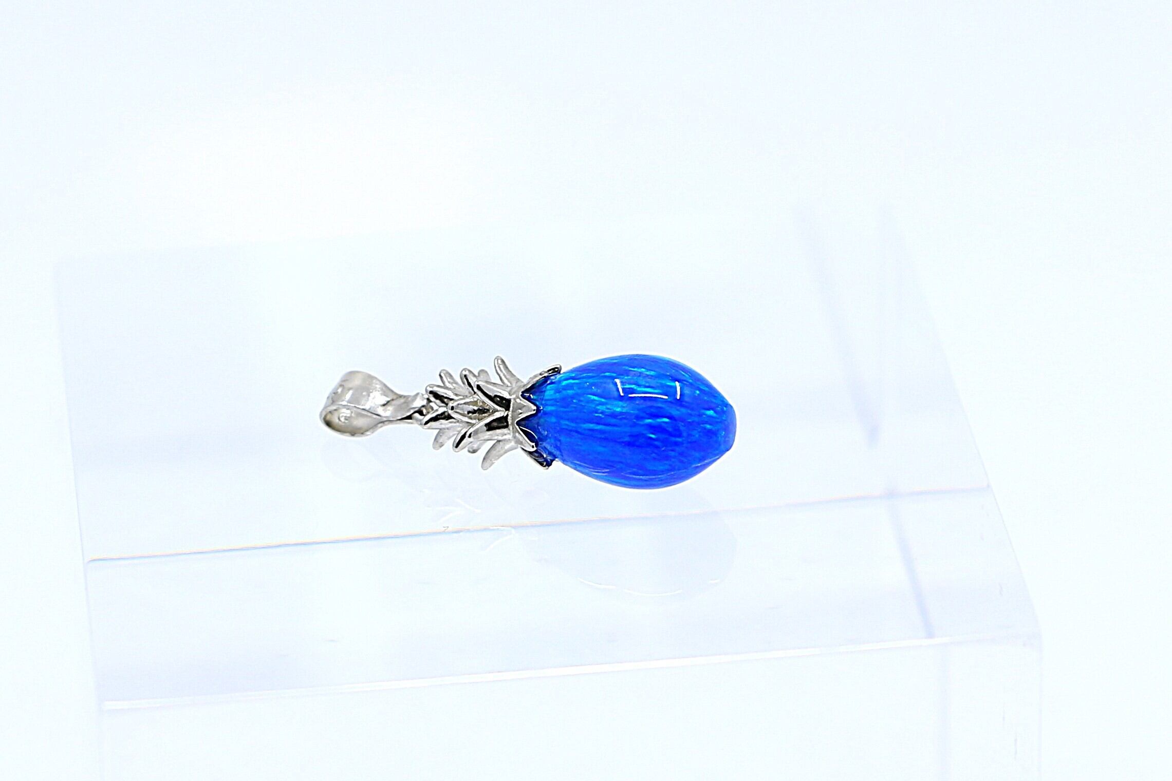 南国の陽光を閉じ込めたような、鮮やかなブルーオパールが輝くパイナップルモチーフのペンダントトップ。