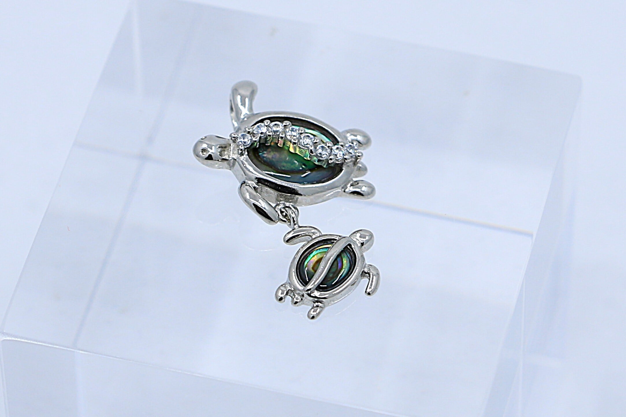 南国の海を連想させる幻想的なアバロンシェルを甲羅にインレイし、親亀の甲羅には波のように流れるキュービックジルコニアが美しい輝きを添えます。