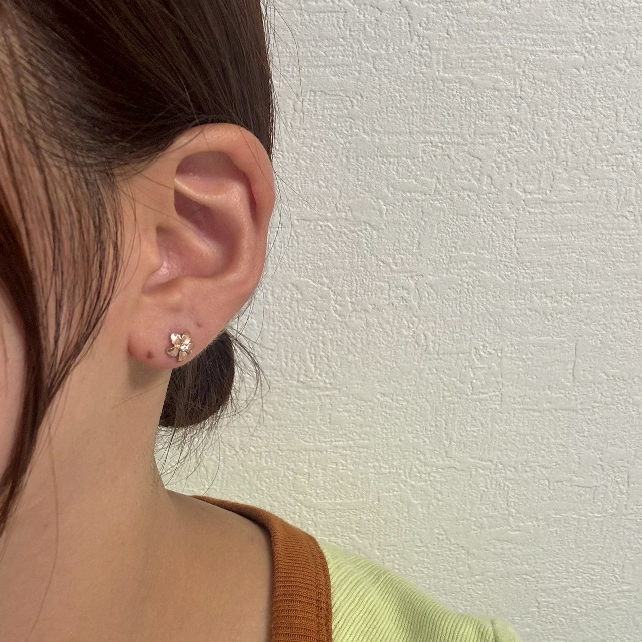 14Kピンクゴールドを使用したこのピアスは、華やかながらも柔らかい印象を与える温かみのある色合いが特徴です。肌なじみが良く、上品で落ち着いた雰囲気を醸し出します。