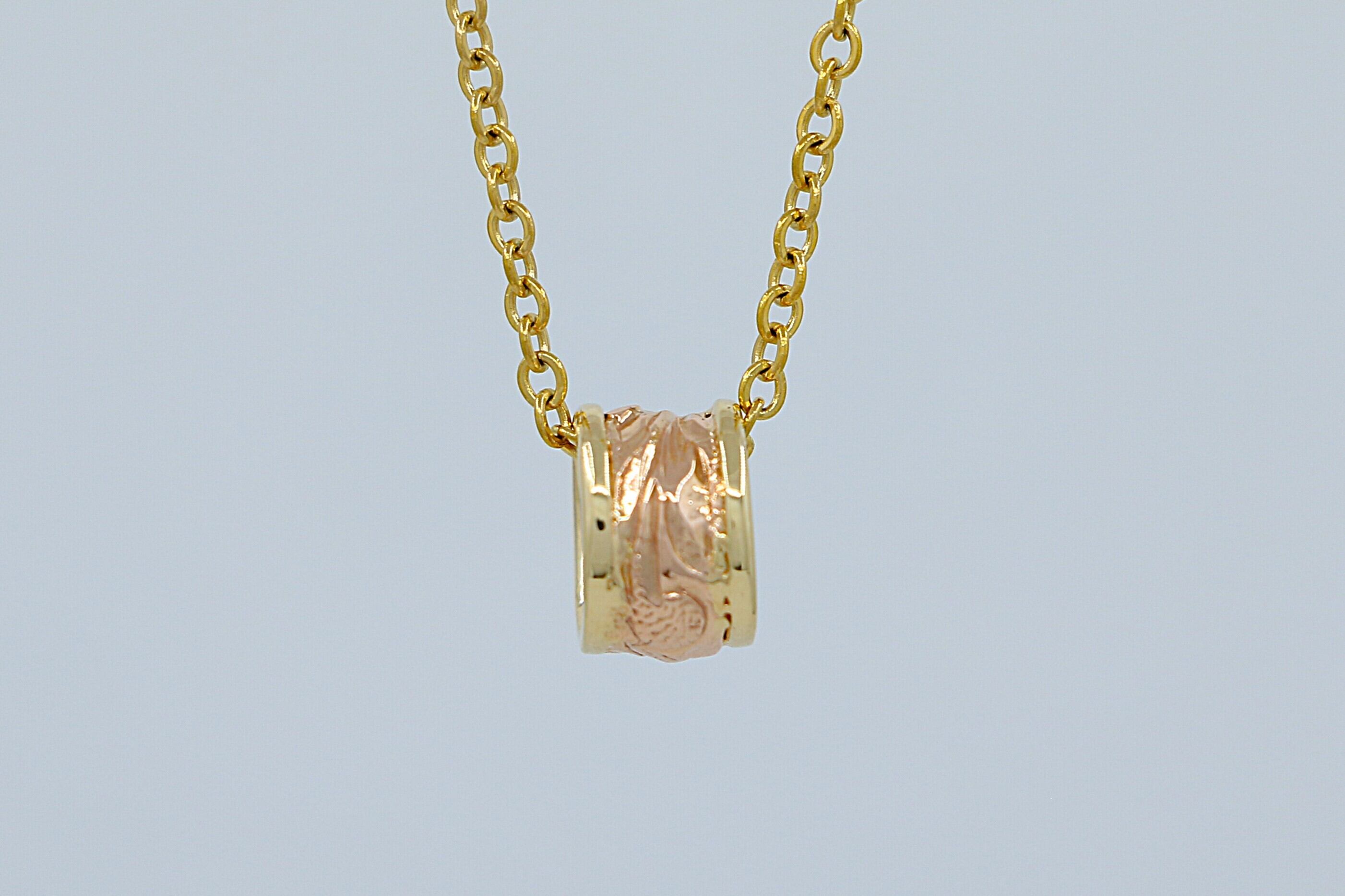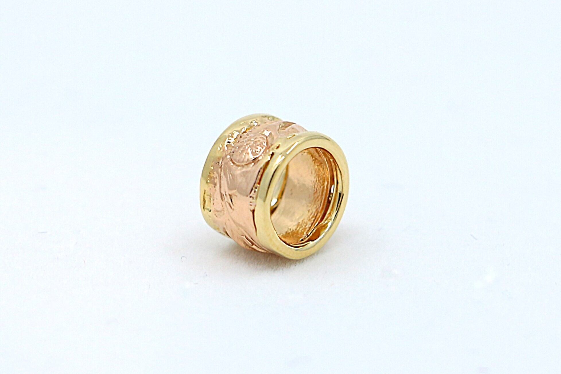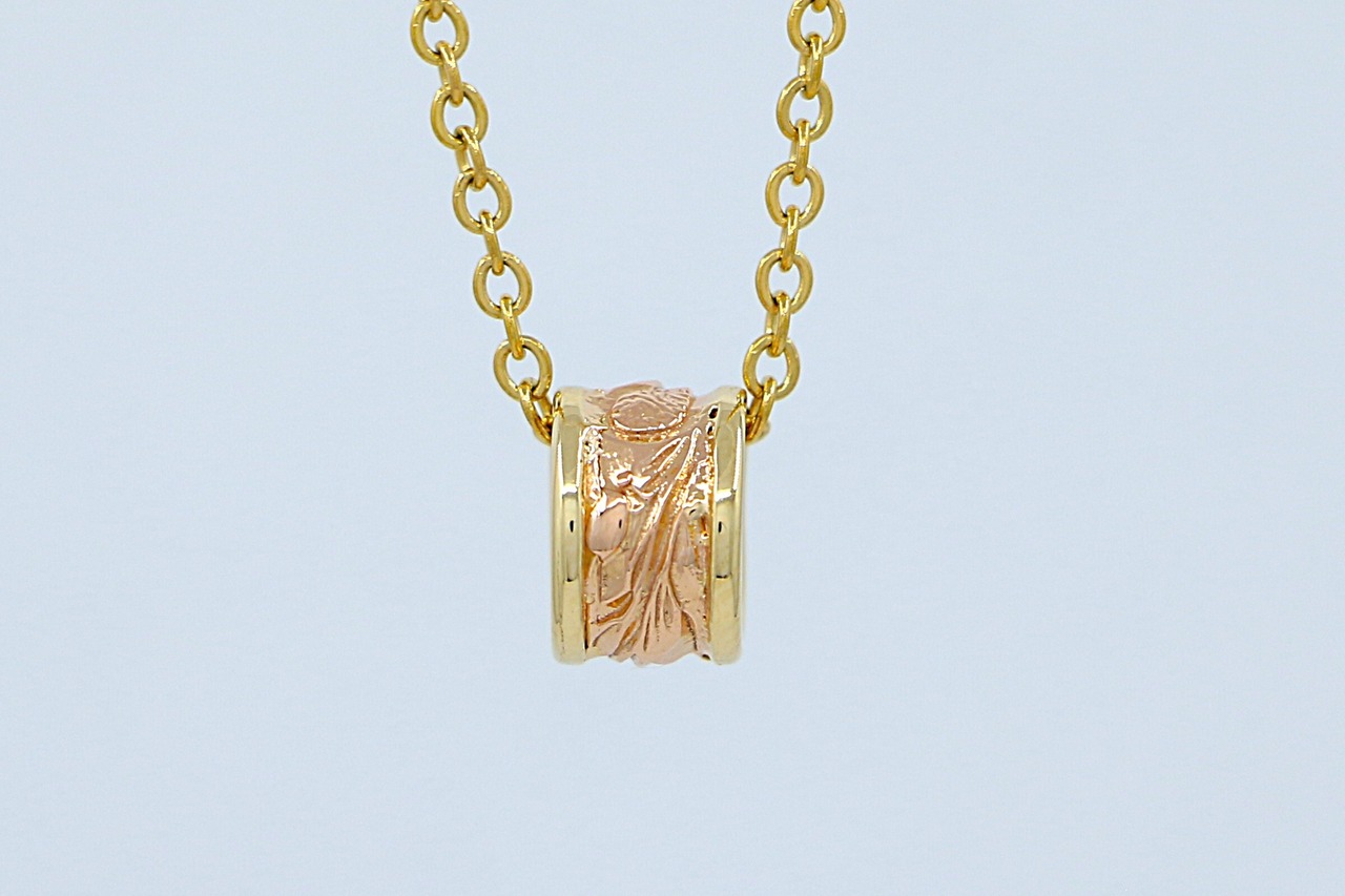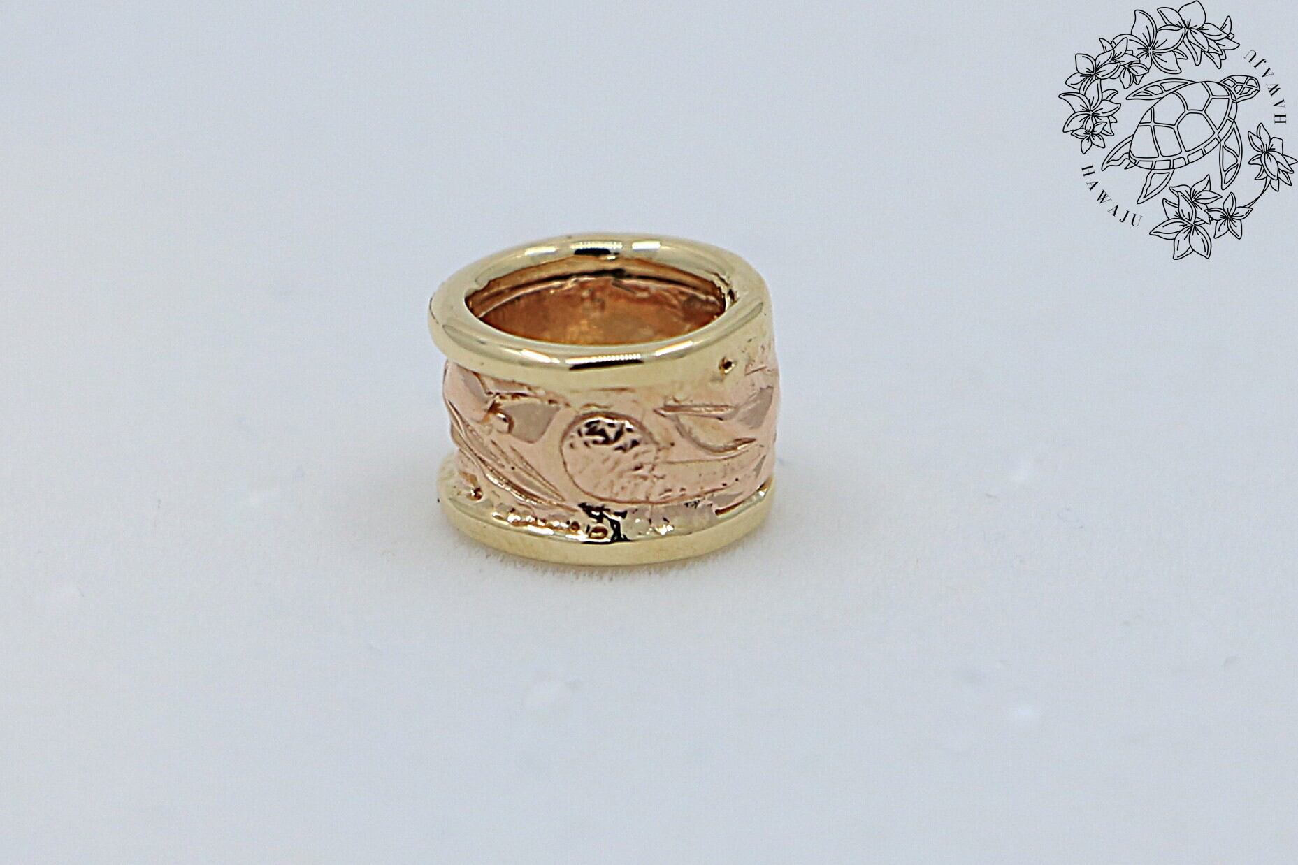 このペンダントトップは、ハワイの伝統的な美しさを受け継ぐ、エレガントな14Kツートンカラーのペンダントトップです。中央のピンクゴールド部分と周囲を囲むイエローゴールド部分には熟練の職人が手彫りで施した繊細なスクロールデザインが刻まれ、華やかなコントラストを生み出し、上品で洗練された印象を演出しています。ハワイアンジュエリー特有の波の彫刻が施されたスクロールデザインは、永遠の愛・絆・自然の力を象徴し、持ち主に特別な意味をもたらします。シンプルながらも存在感のあるデザインは、どんなスタイルにも調和し、日常使いから特別なシーンまで幅広く活躍します。自分へのご褒美や大切な方への贈り物としても最適な、上品な輝きを放つ一品です。