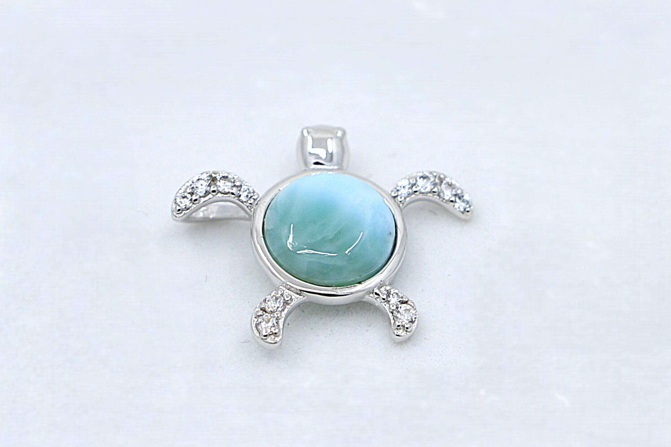 ホヌの両手足には輝くキュービックジルコニアが施され、デザインに華やかさと精緻さをプラス。ダイヤモンドのような輝きが、ラリマーとシルバーの美しさを引き立てます。