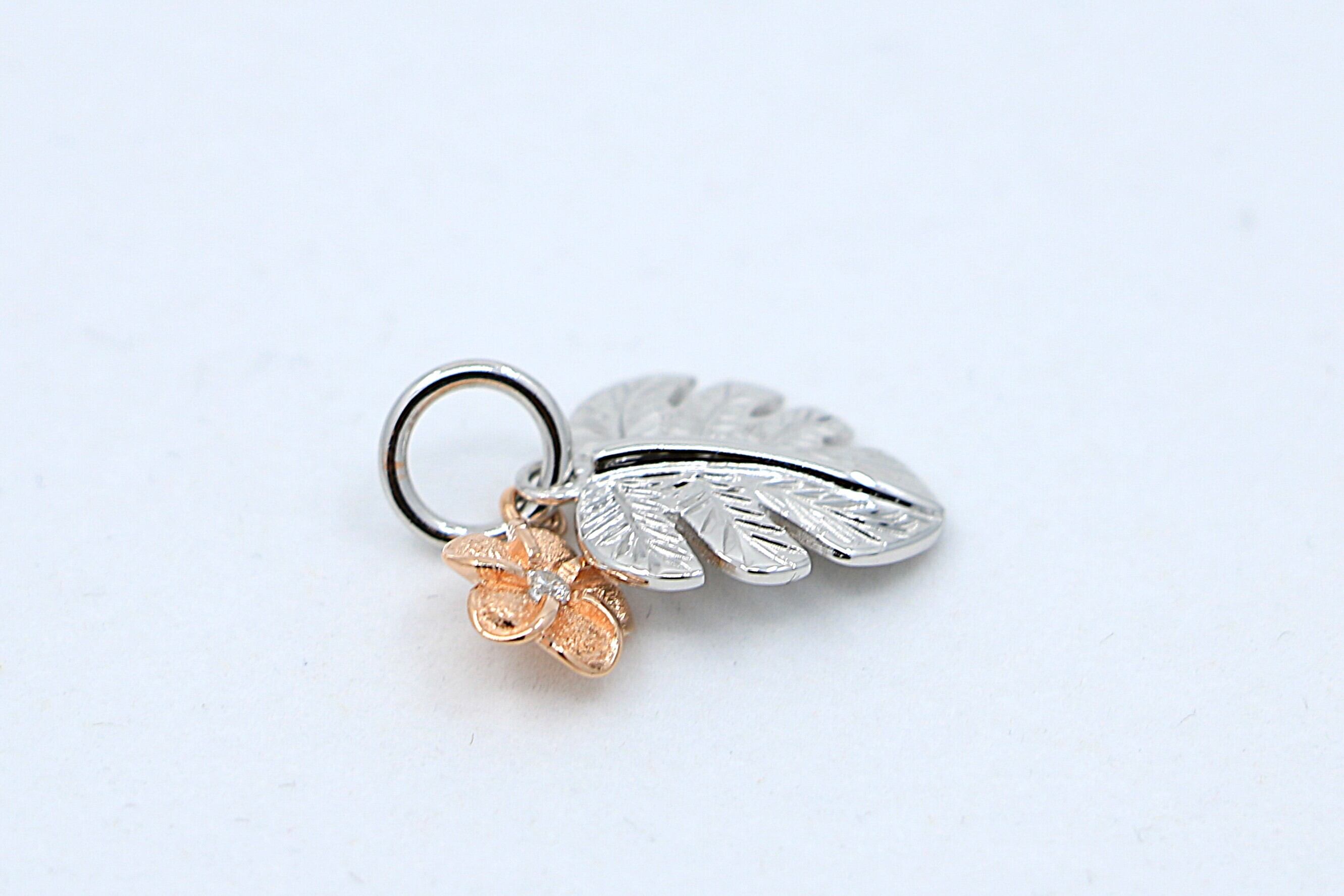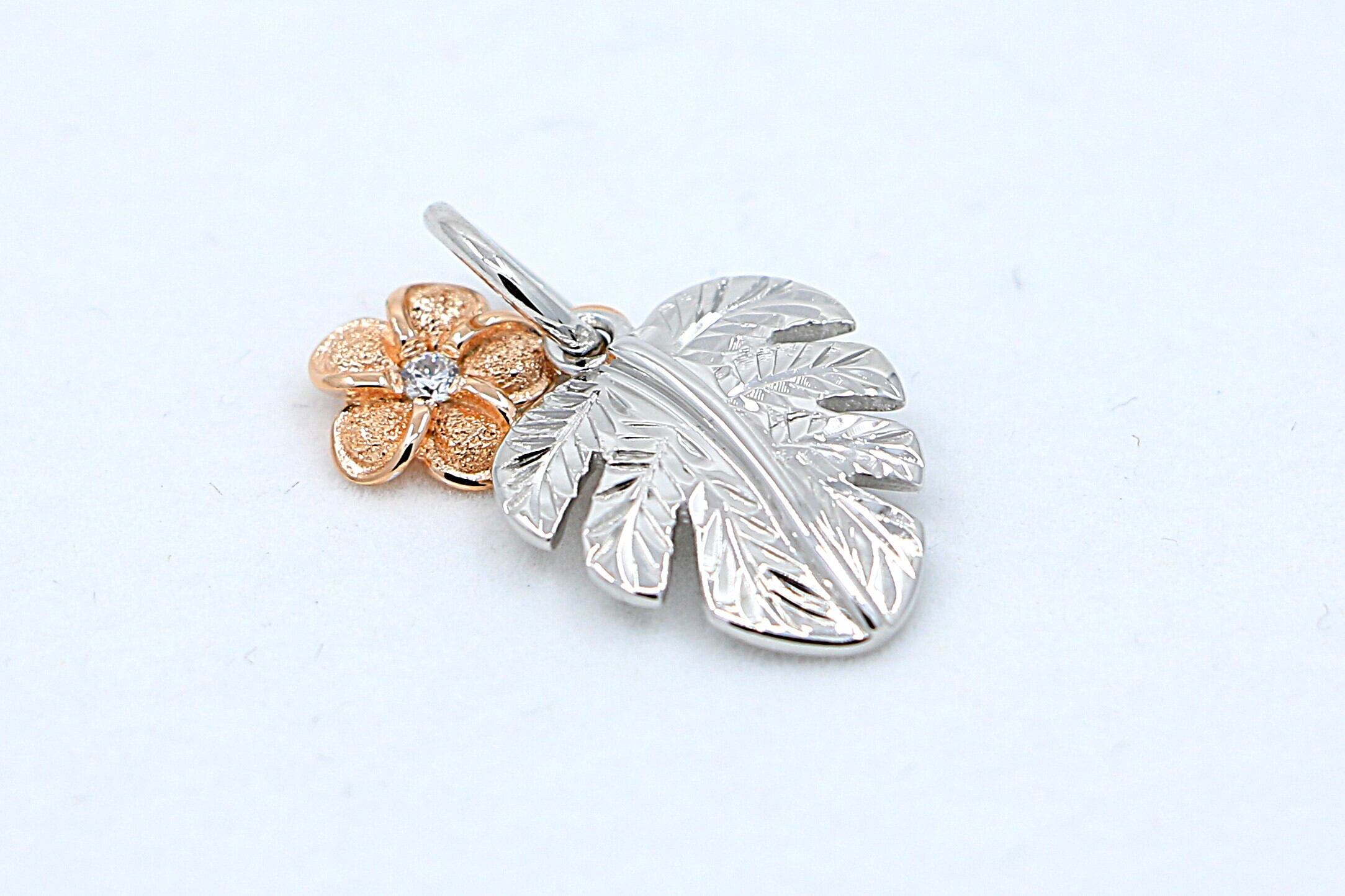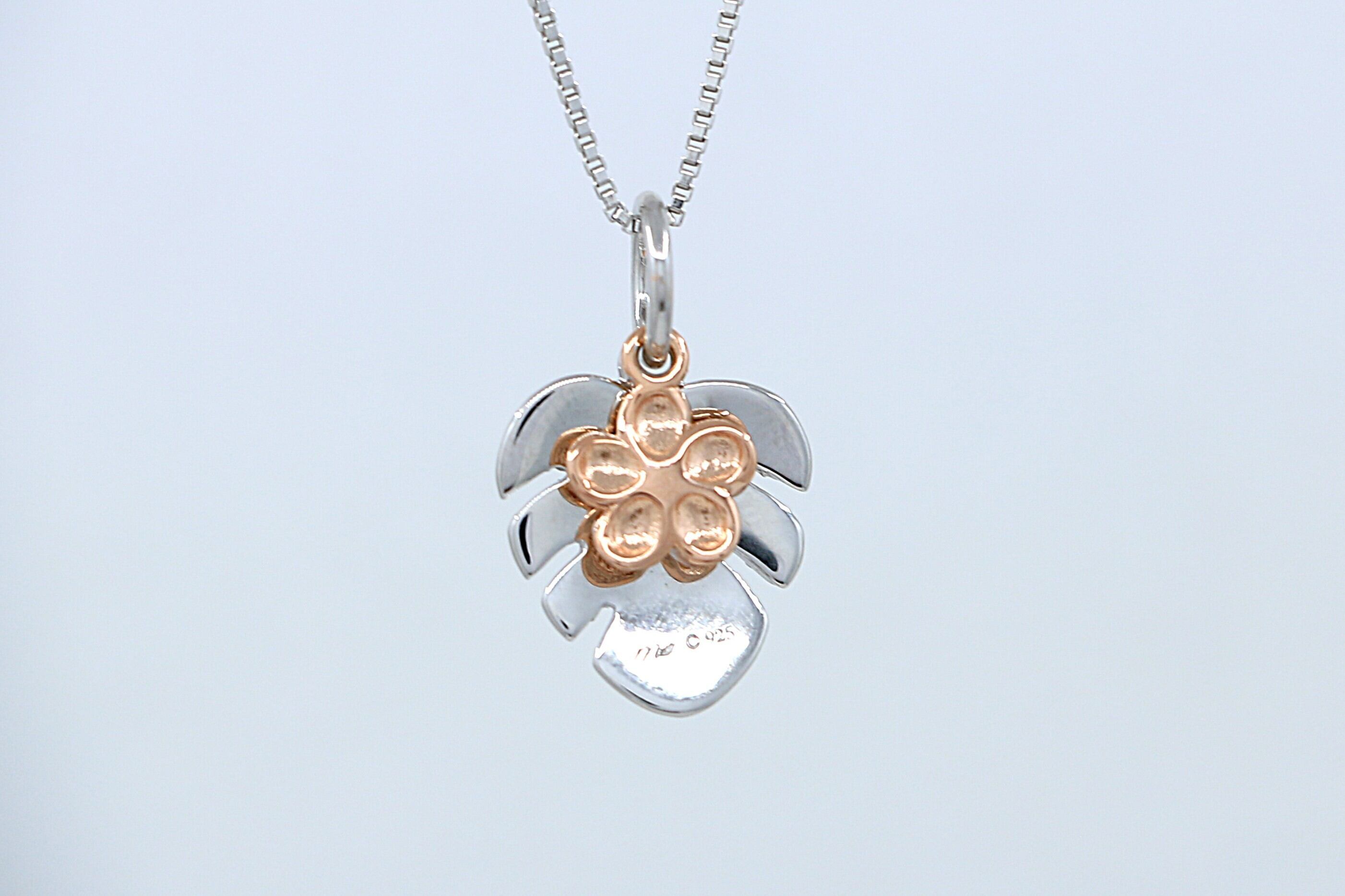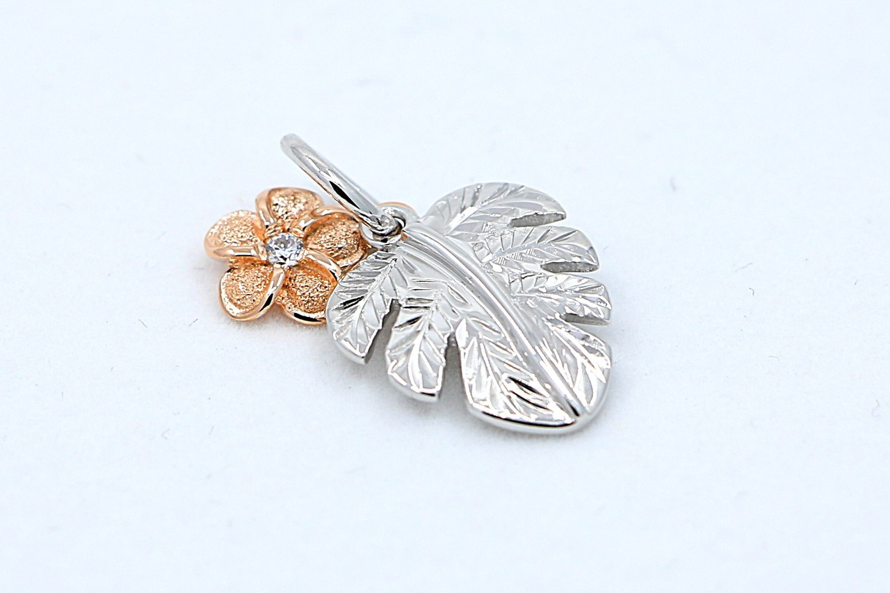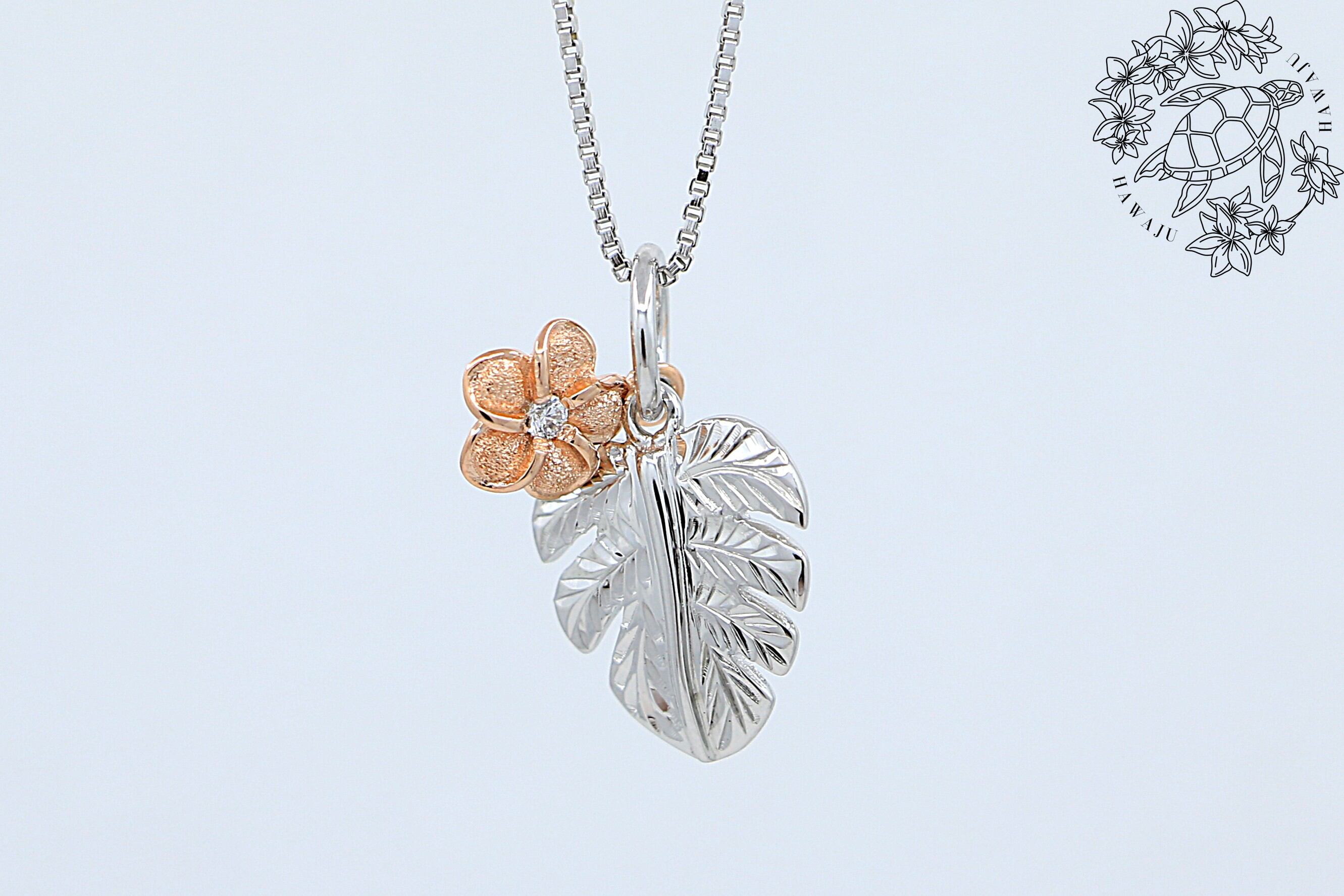 南国ハワイの自然美をそのまま閉じ込めた「モンステラ&プルメリア」のペンダントトップです。ピンクゴールドとシルバーの優雅なコンビネーションに、キュービックジルコニアの繊細な輝きを添えたデザインで、胸元に華やかさと上品さをプラスします。
