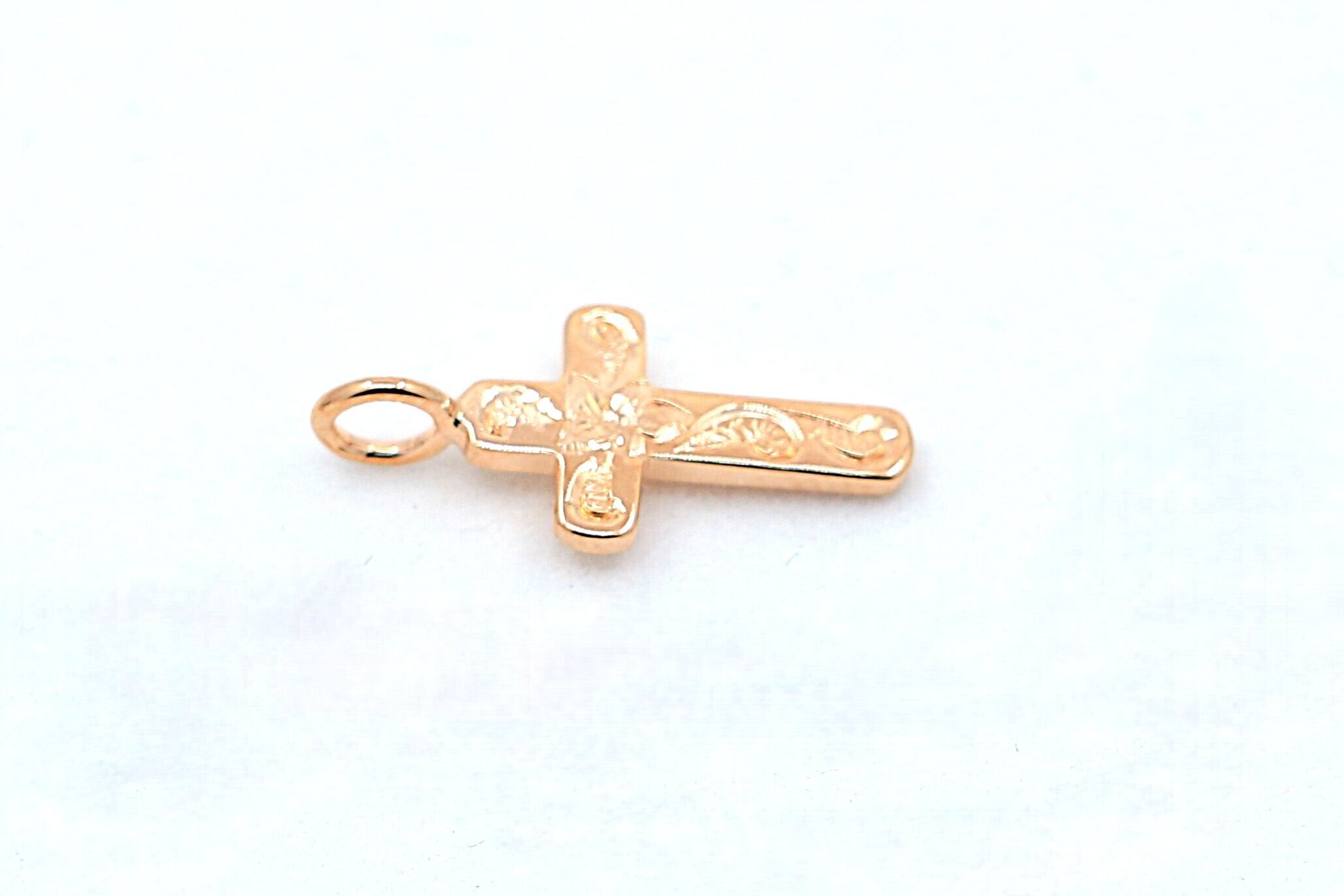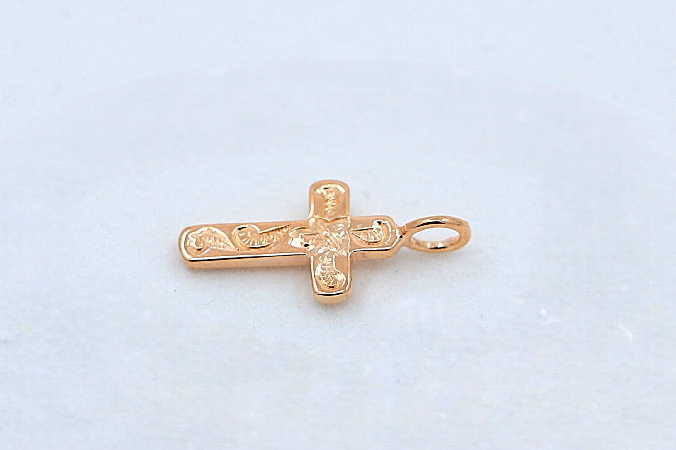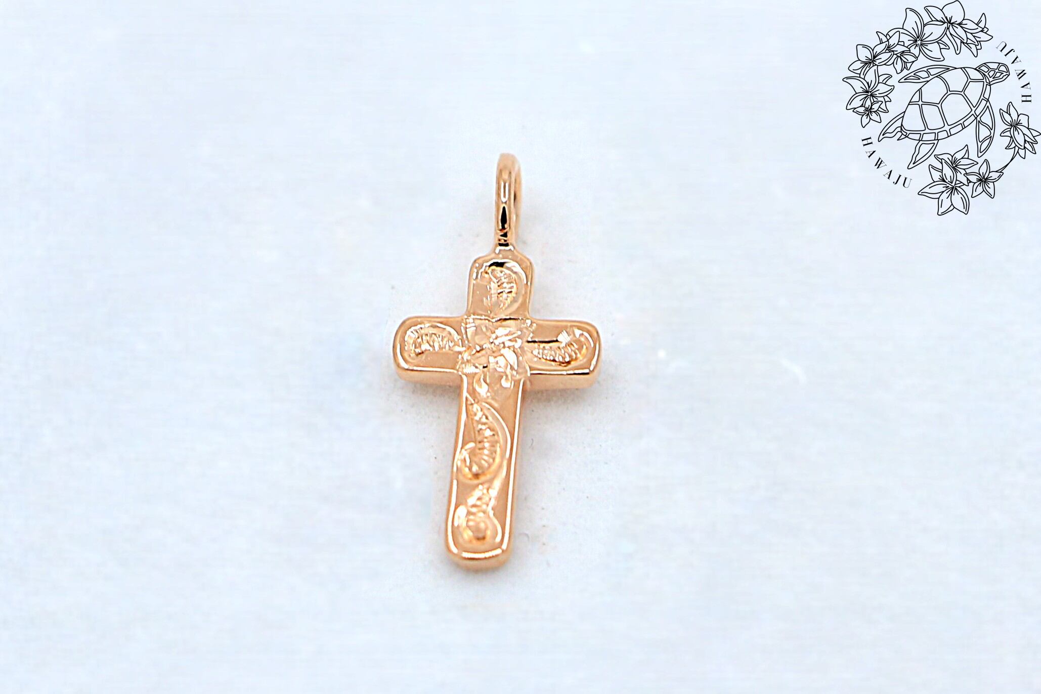 ピンクゴールドの温かみとスクロール模様の繊細さが融合したクロスチャームは、手元や胸元に華やかで優しい印象を添えます。特別な瞬間を彩る、大人のためのハワイアンジュエリーです。