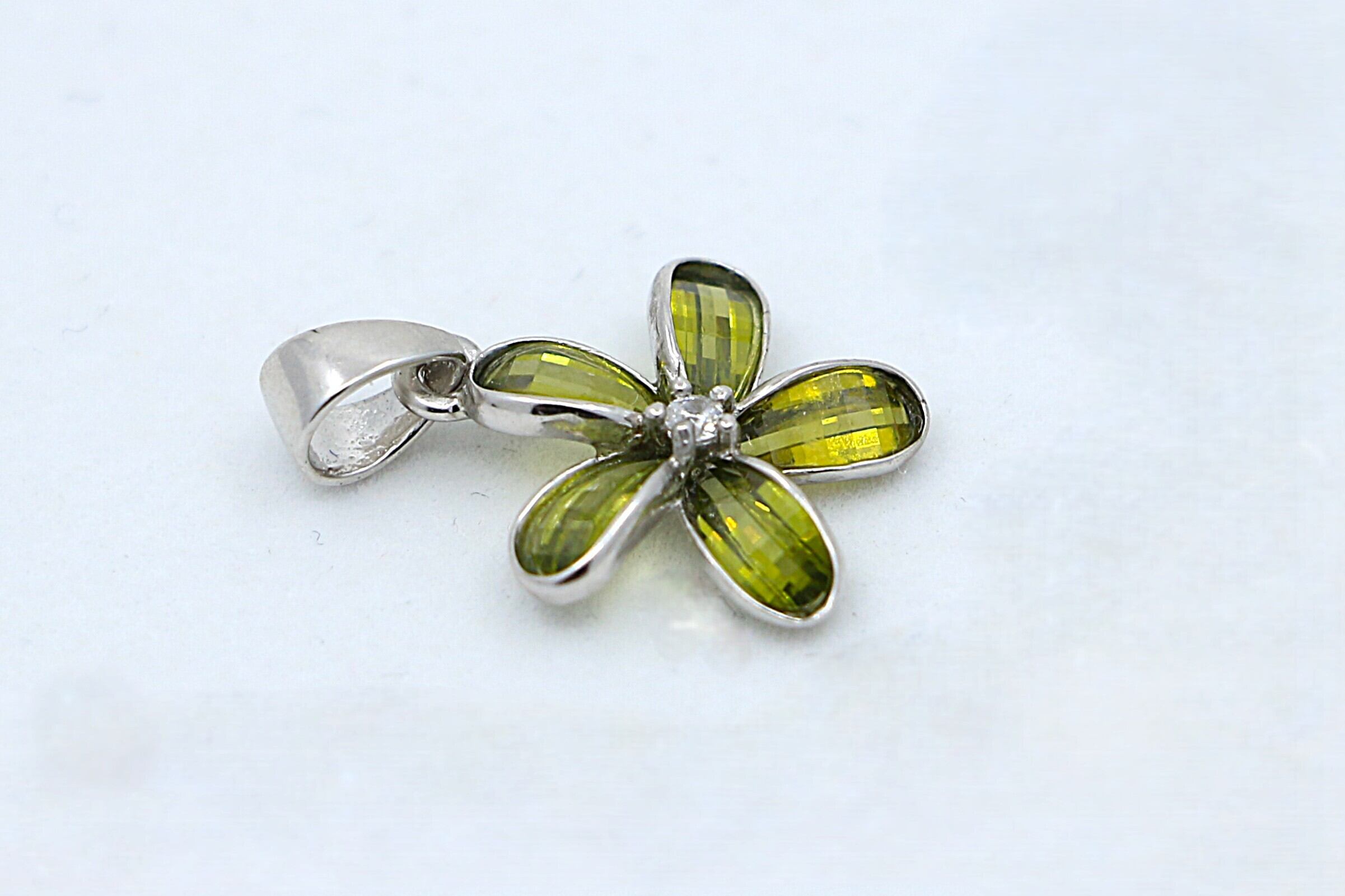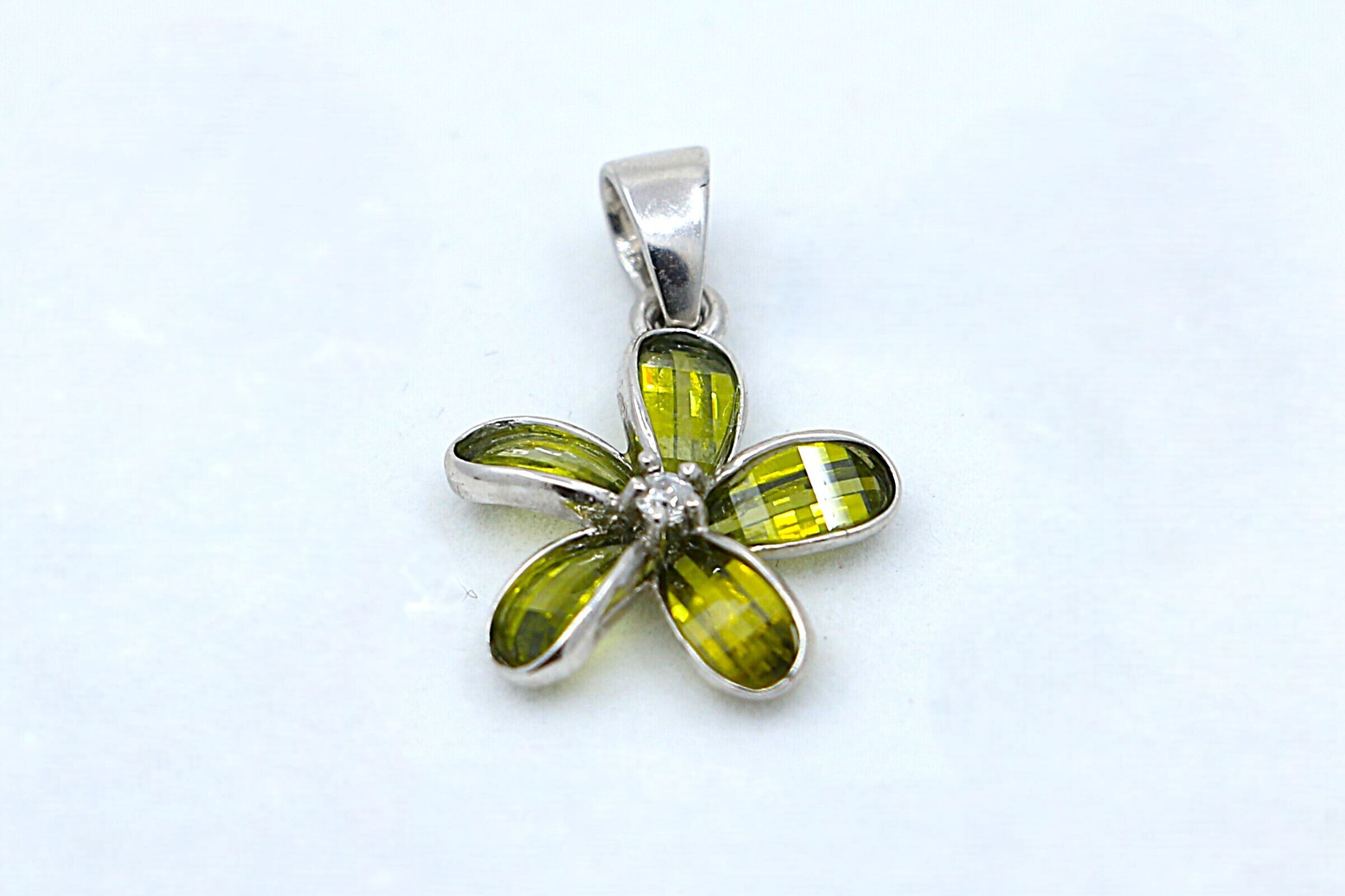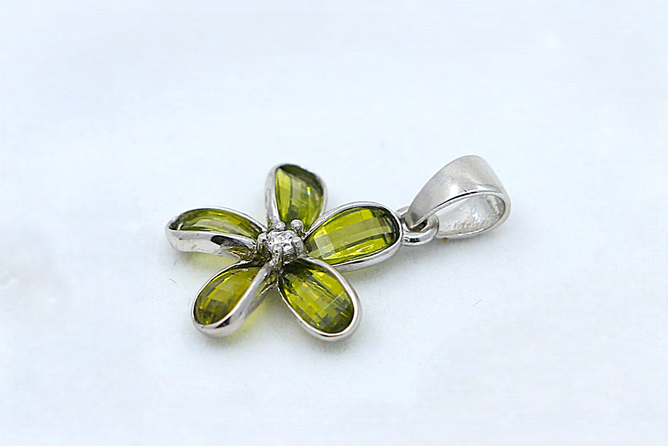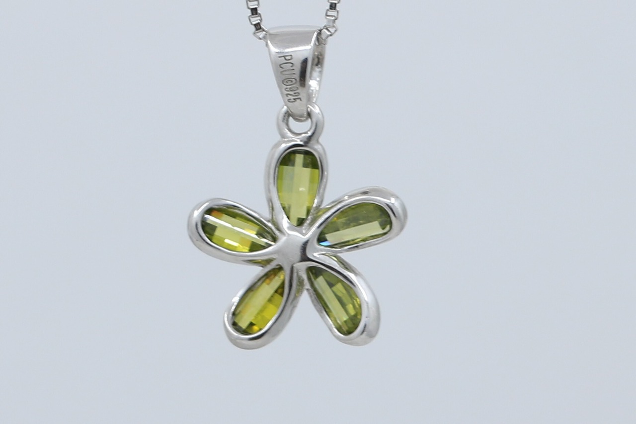 一枚一枚の花びらには、希望と幸福を象徴する爽やかな緑色のペリドットをインレイし、さらに、花の中心にはキュービックジルコニアが一粒セッティングされており、胸元でやさしく上品に輝きます。