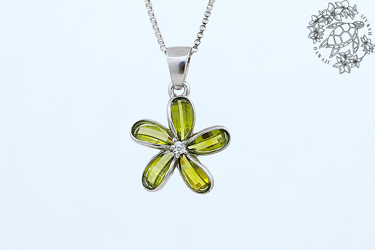 ペリドットの鮮やかなグリーンが映えるプルメリアモチーフのペンダントトップは、手元や胸元にやさしく華やかな輝きを添え、特別な瞬間をより一層引き立てます。