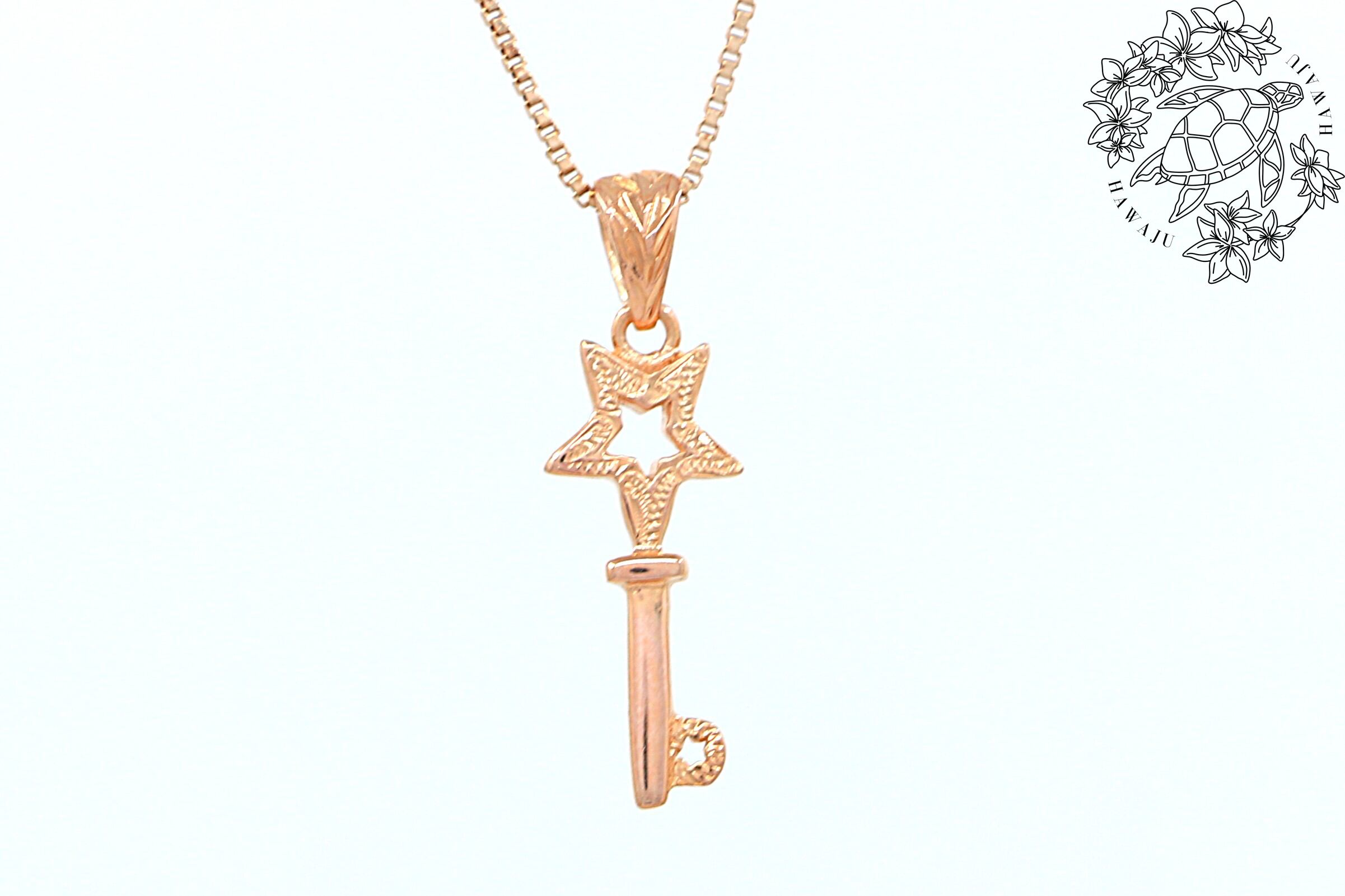 希望と輝きを象徴するスターと鍵のモチーフが、胸元で優しく温かな光を放つピンクゴールドペンダントトップ。ハワイの文化と夢を感じられる、特別なアクセサリーです。