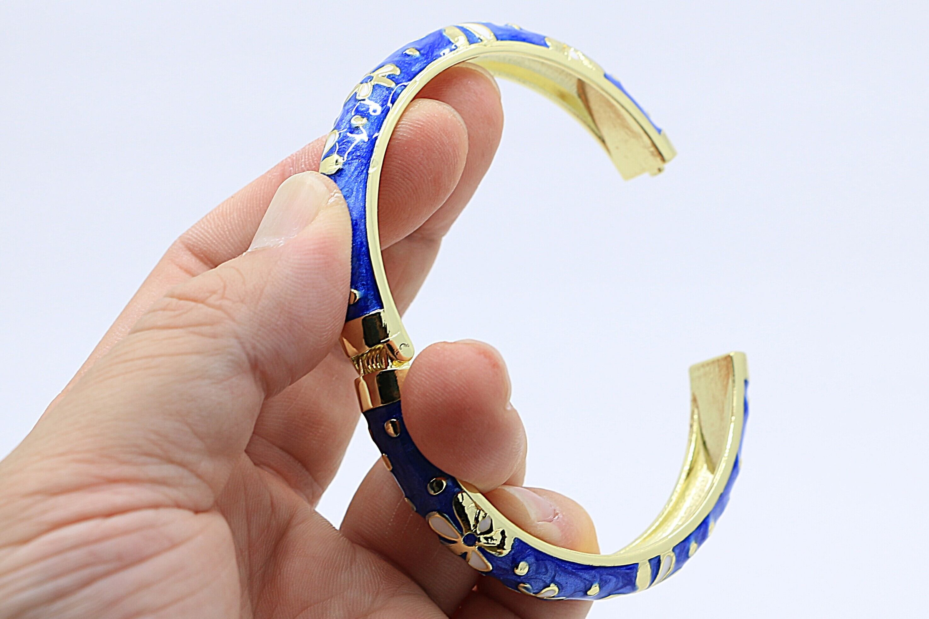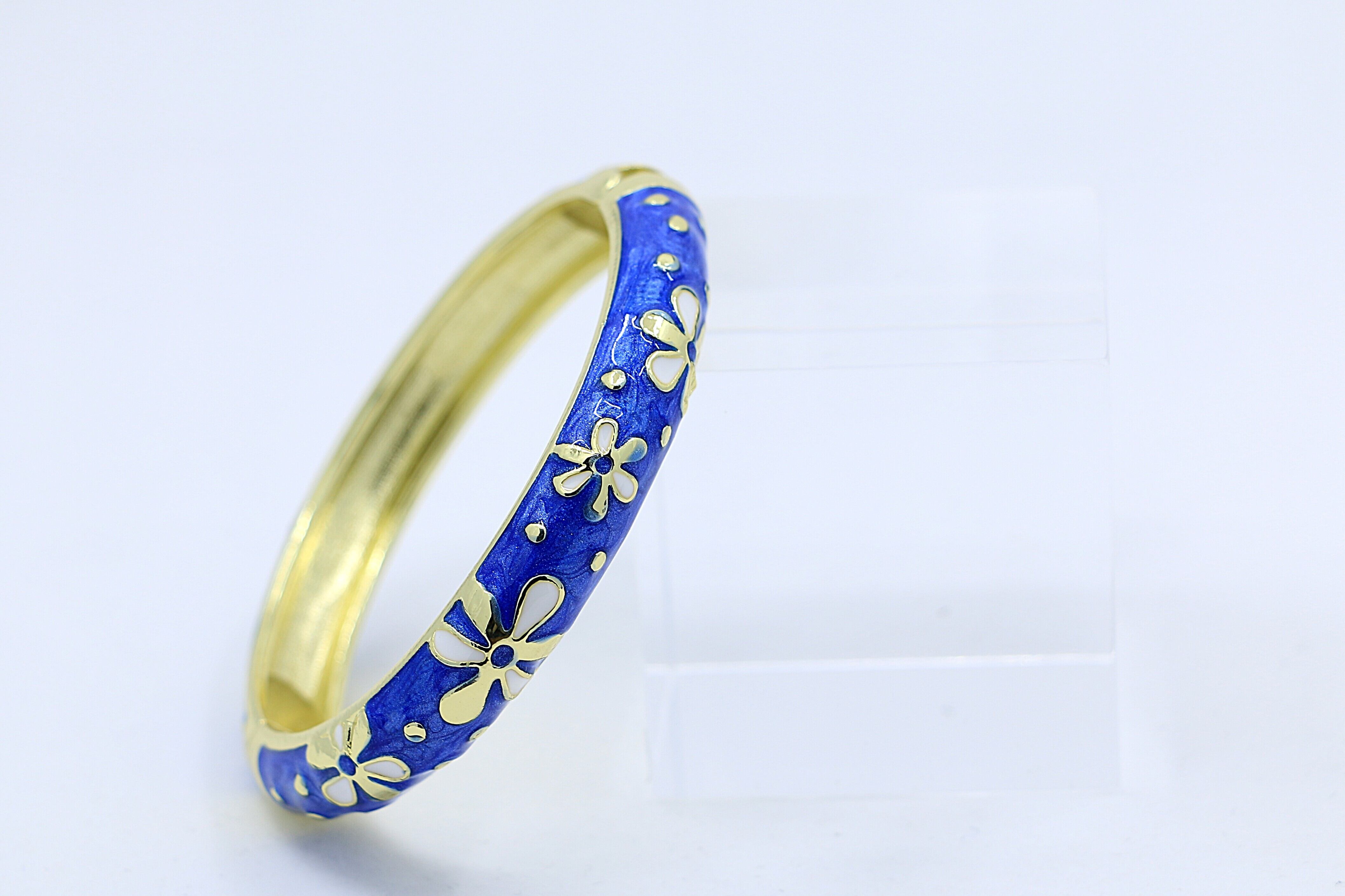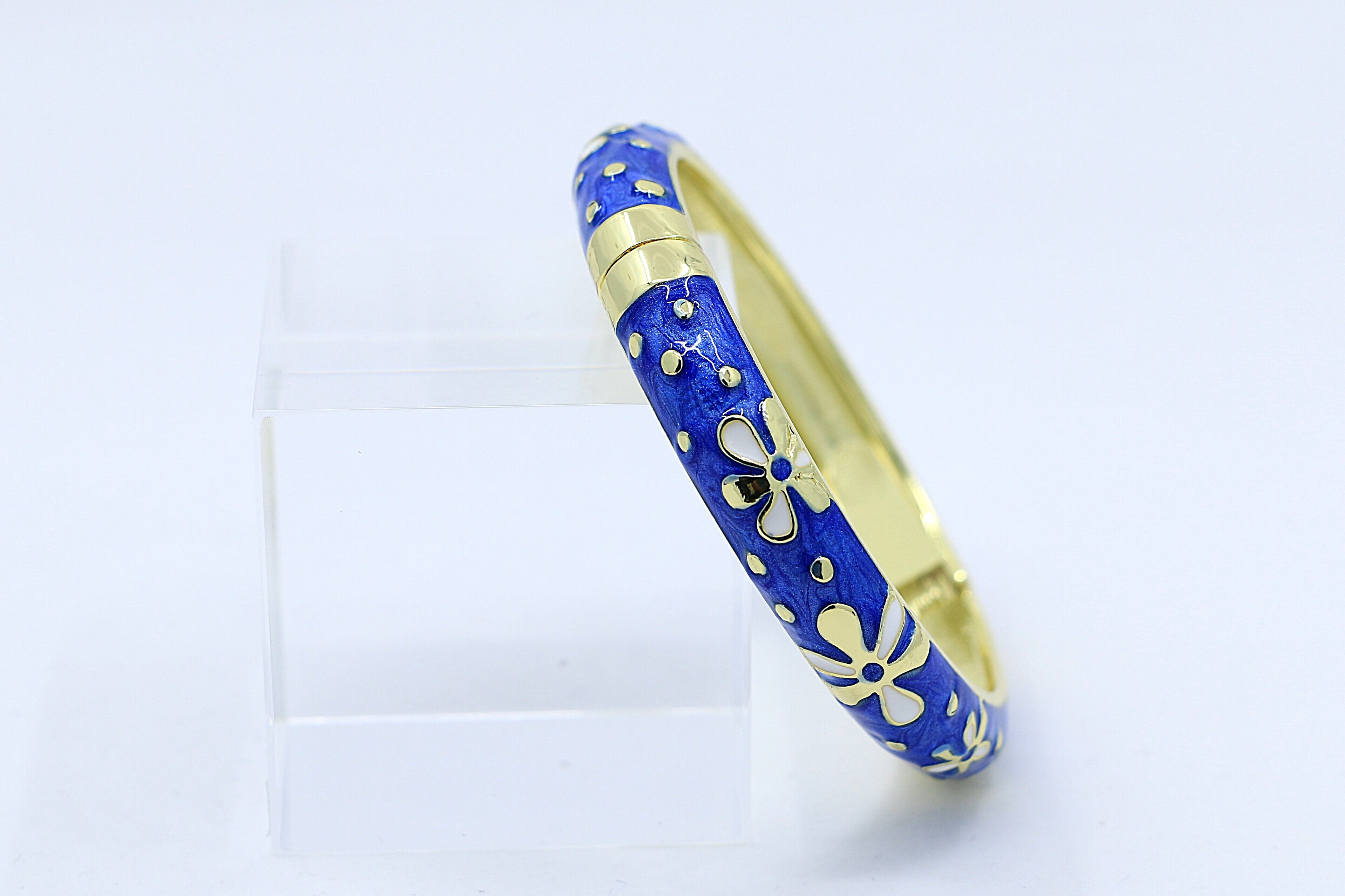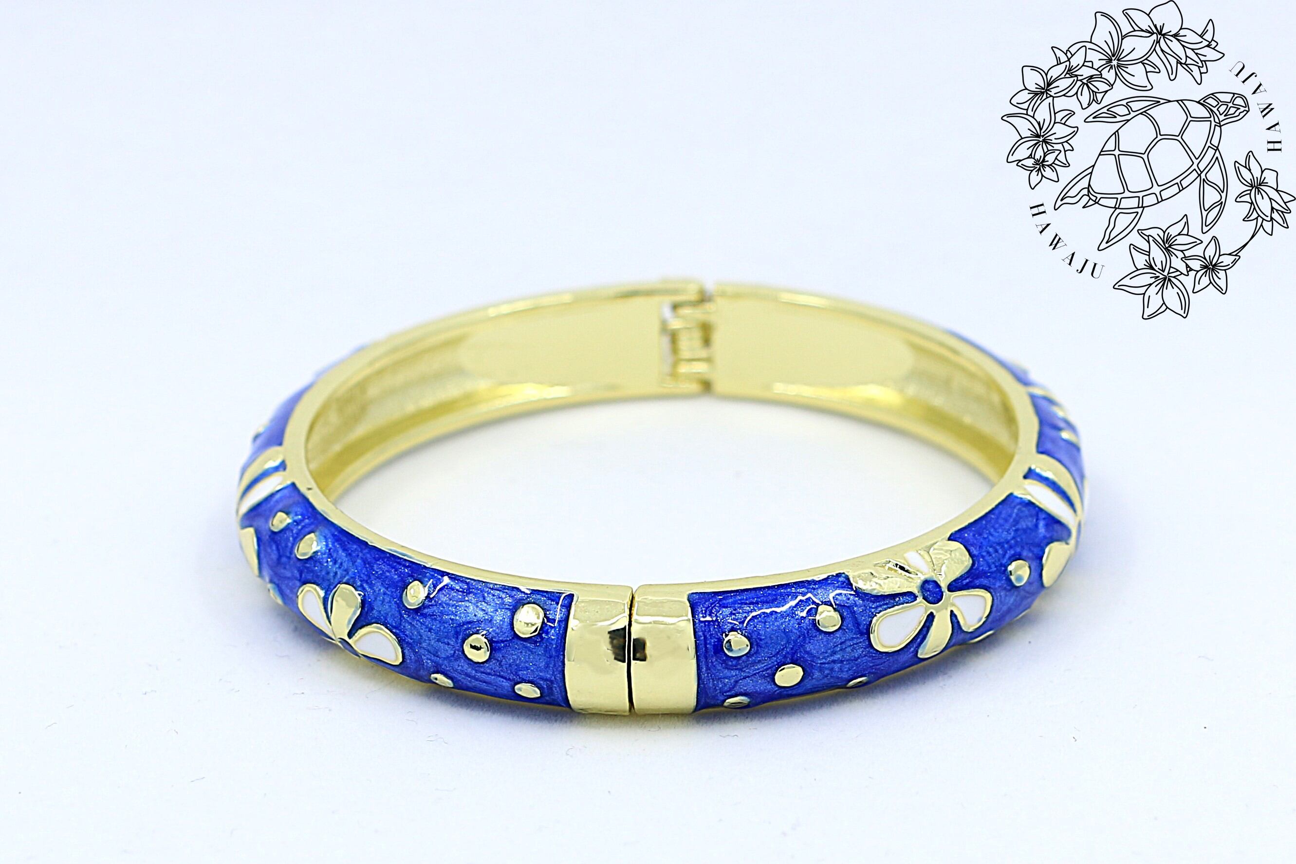 ハワイを象徴する ティアレモチーフ をデザインに取り入れた、美しいバングルです。合金素材にゴールドカラーのコーティングを施し、ブルーのエナメルの上でティアレの花が華やかに映えます。手元に洗練された輝きと南国らしいトロピカルな雰囲気を添えるアイテムです。
