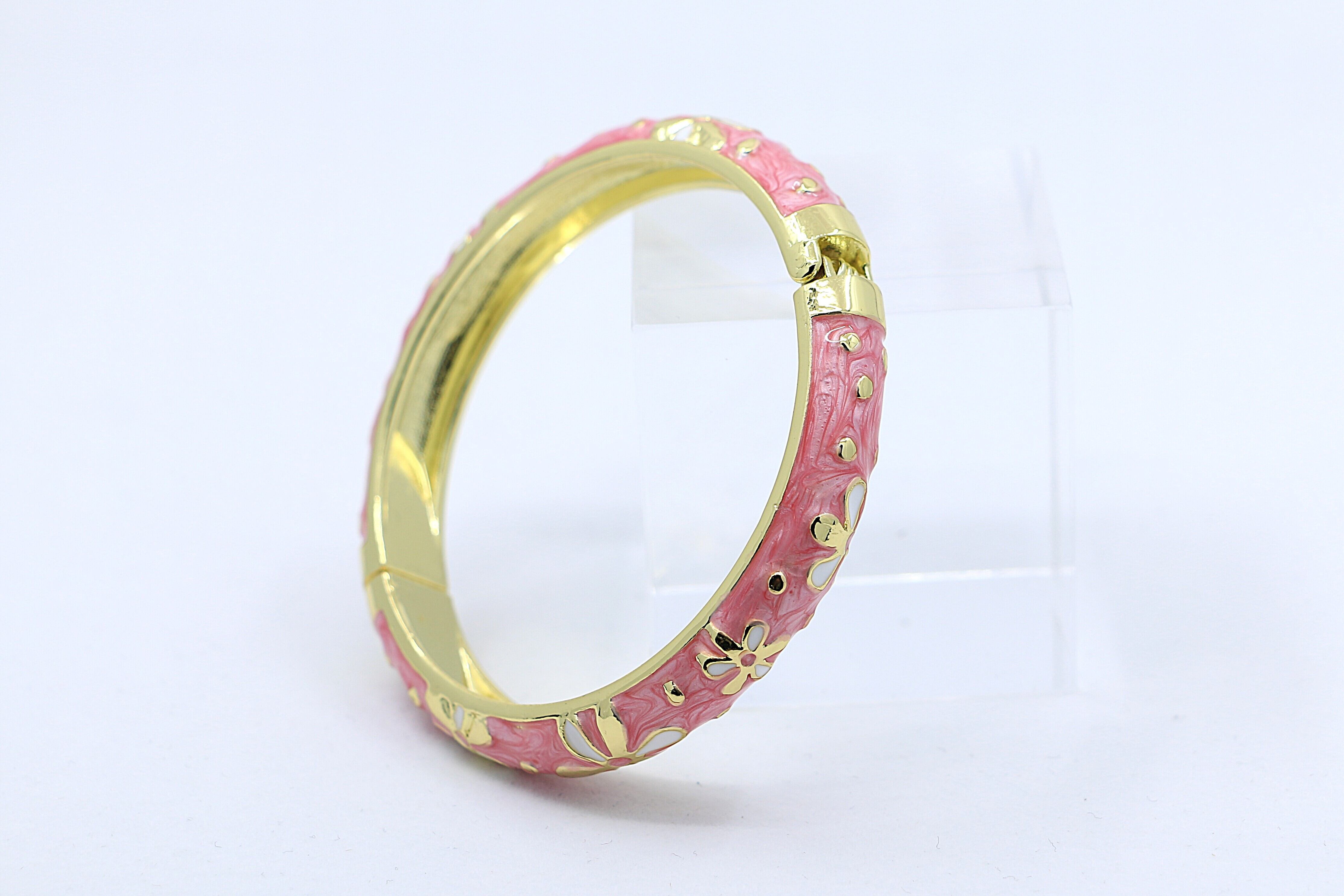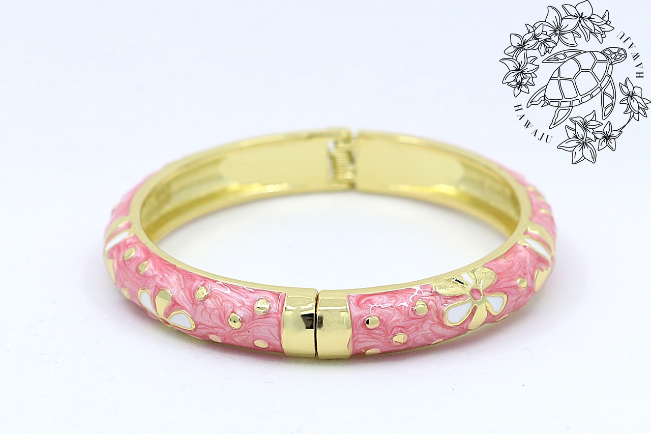 ハワイを象徴する ティアレモチーフ をデザインに取り入れた、美しいバングルです。合金素材にゴールドカラーのコーティングを施し、ピンクのエナメルの上でティアレの花が華やかに映えます。手元に洗練された輝きと南国らしいトロピカルな雰囲気を添えるアイテムです。