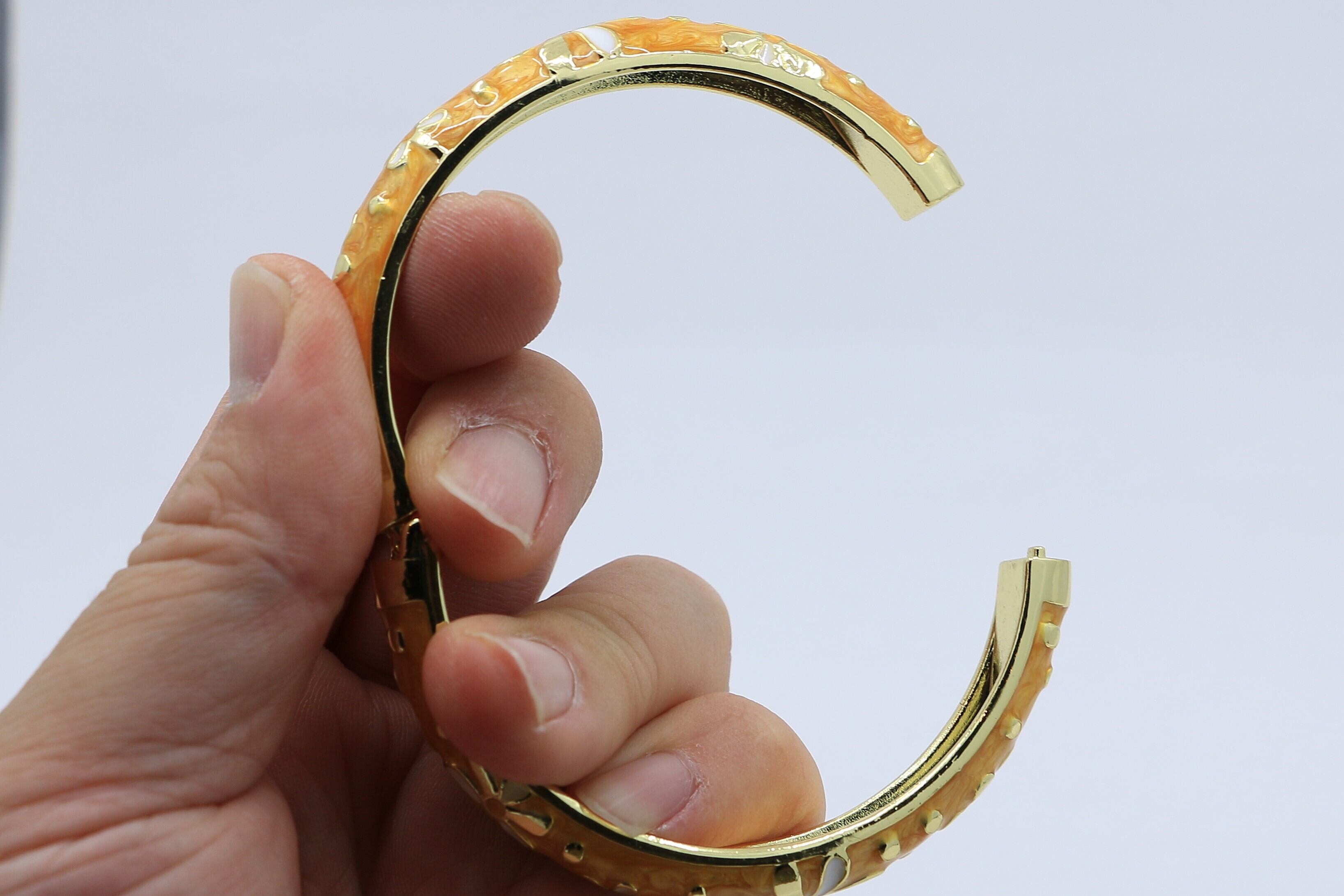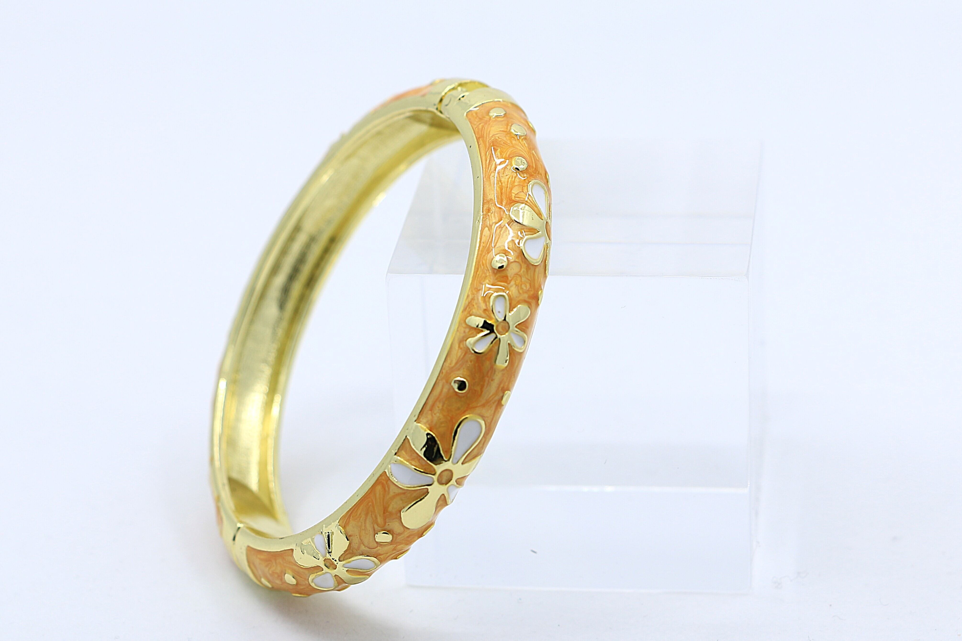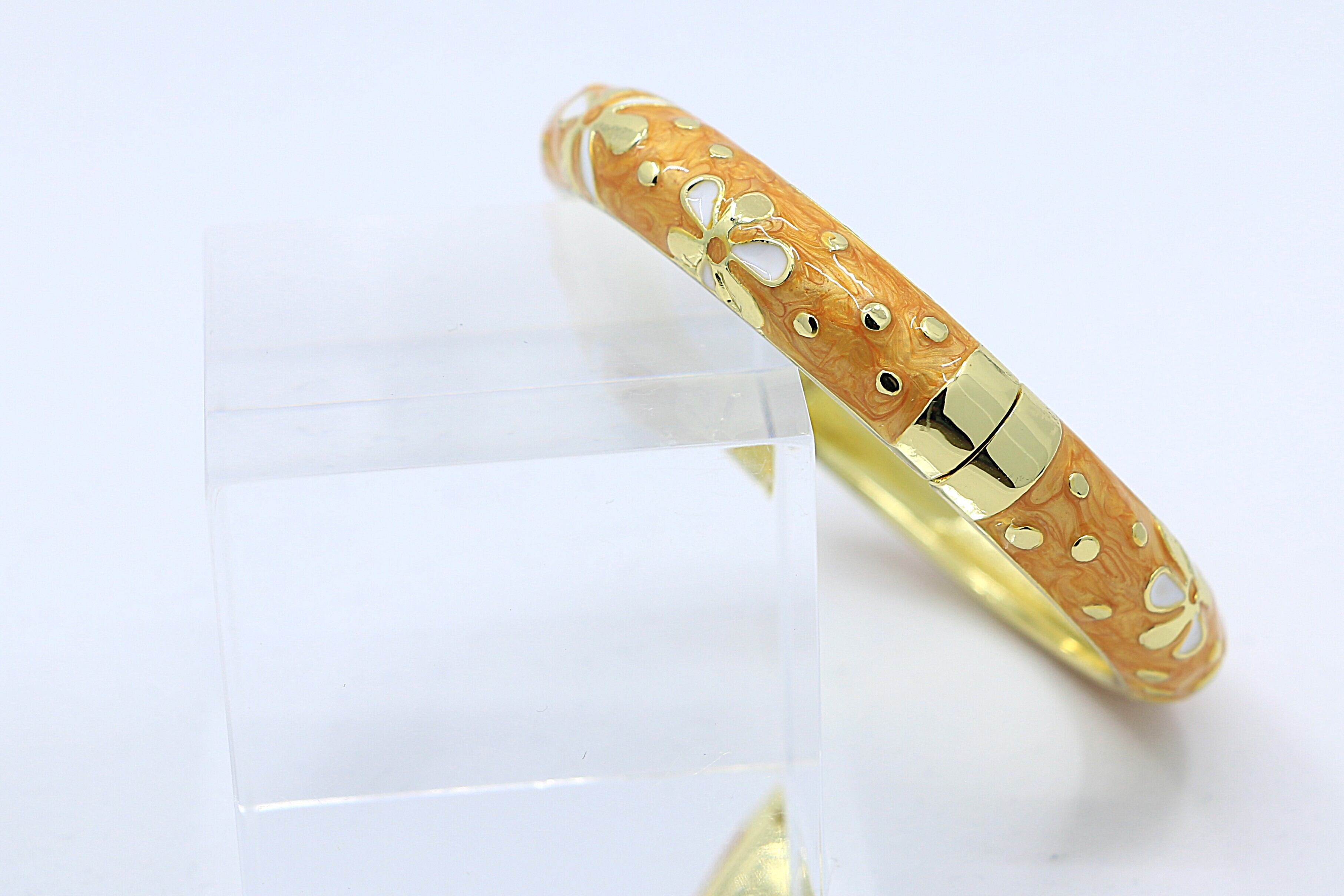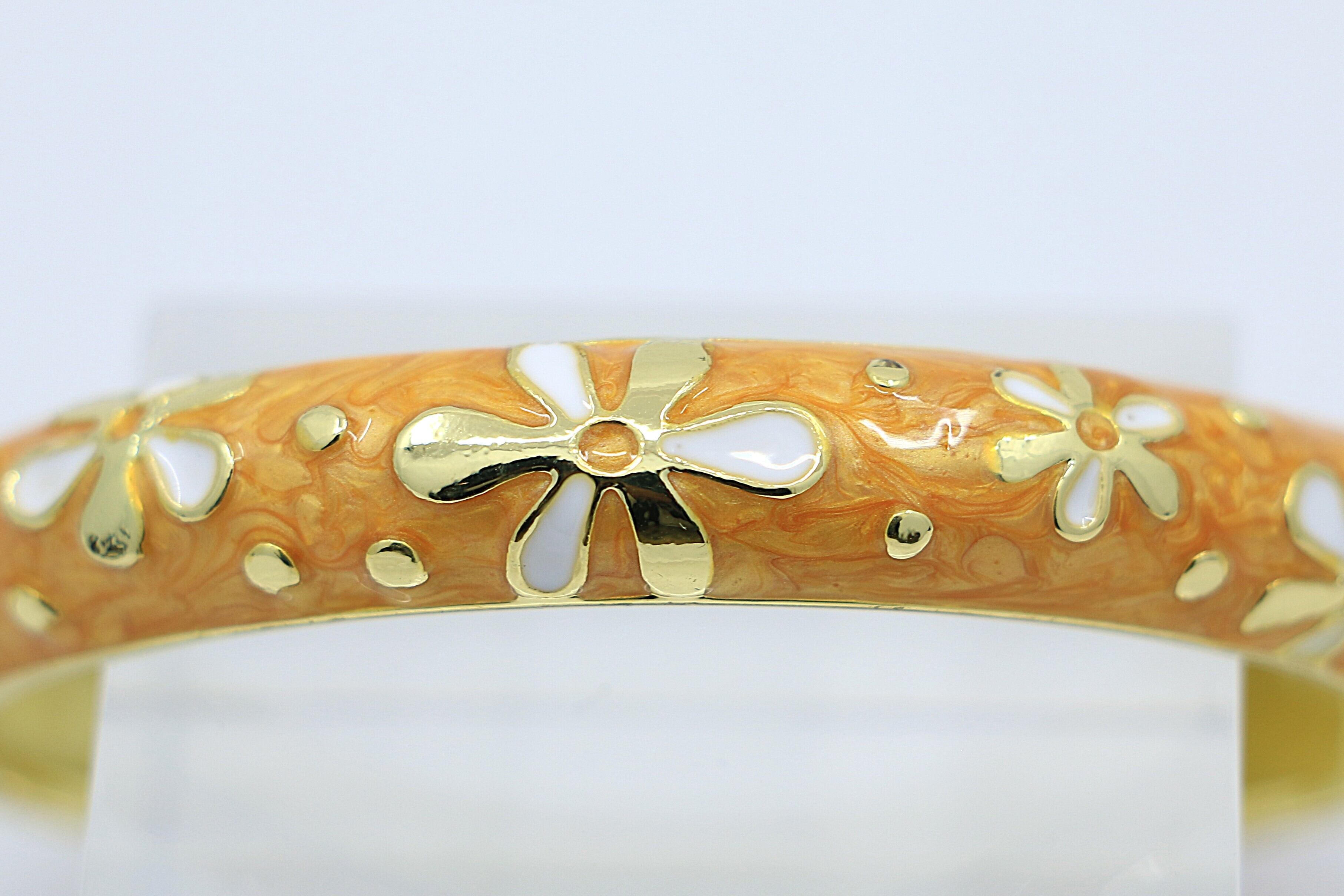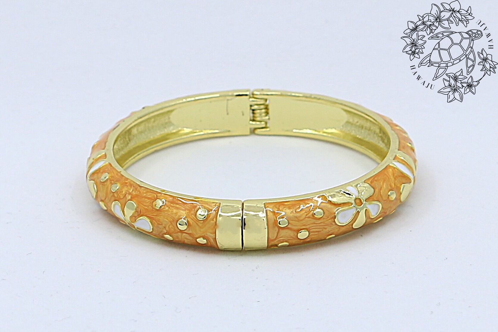 ハワイを象徴する ティアレモチーフ をデザインに取り入れた、美しいバングルです。合金素材にゴールドカラーのコーティングを施し、イエローのエナメルの上でティアレの花が華やかに映えます。手元に洗練された輝きと南国らしいトロピカルな雰囲気を添えるアイテムです。