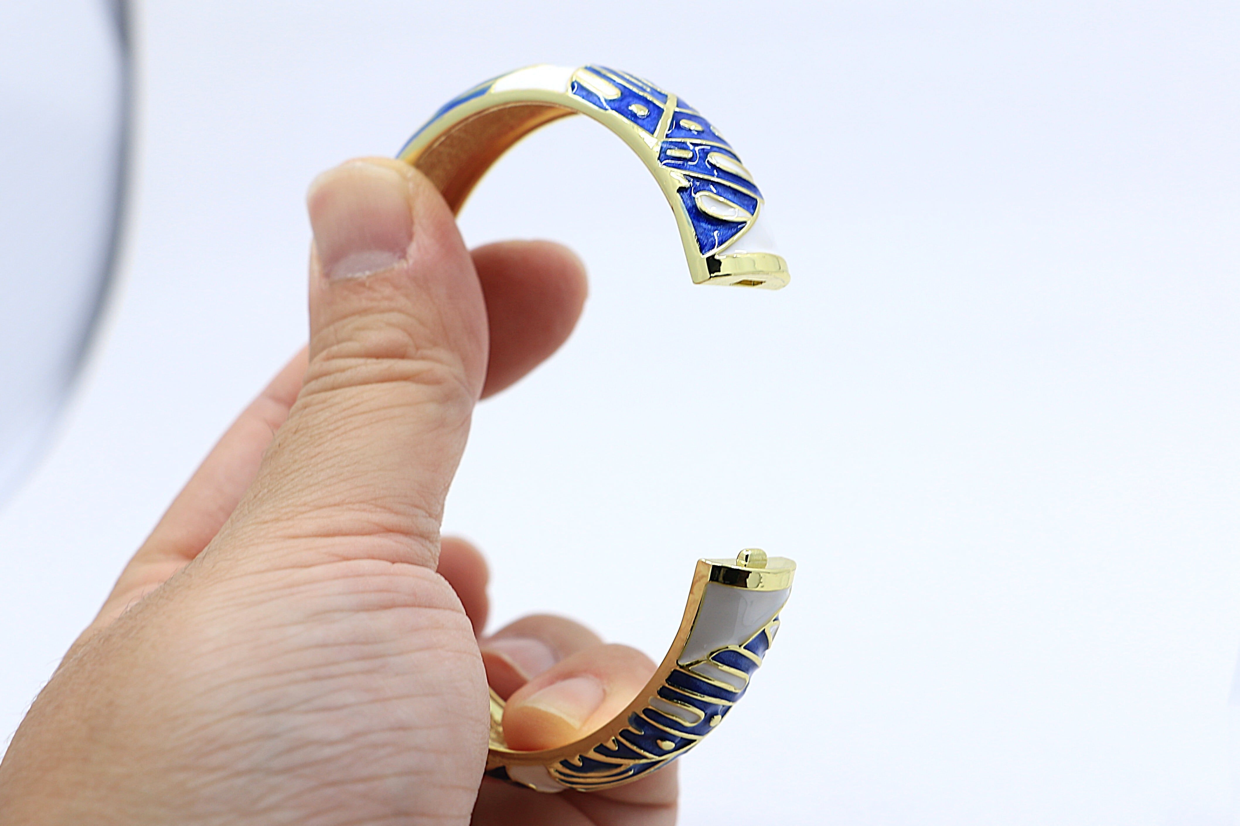 ゴールドカラーとブルーエナメルの爽やかな組み合わせが、季節を問わず上品で明るい印象を引き立てます。