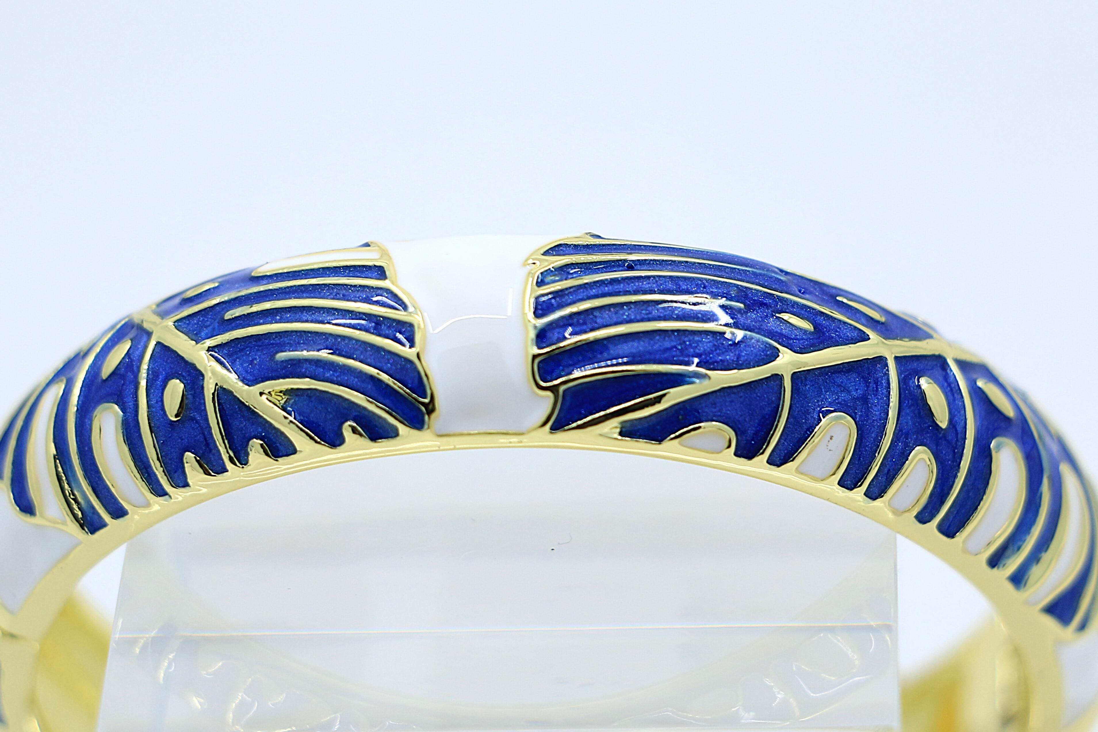 合金素材にゴールドカラーのコーティングを施し、ブルーのエナメルの上でモンステラの葉が爽やかに映える、リゾート感のあるトロピカルジュエリーです。