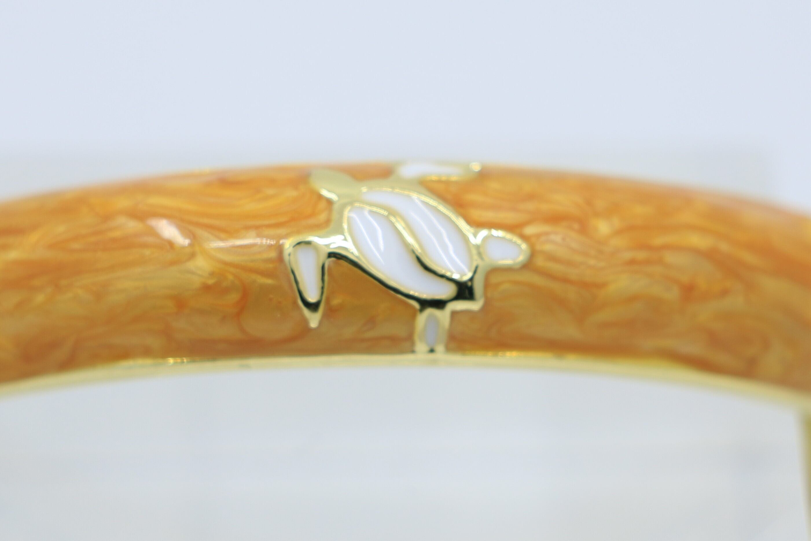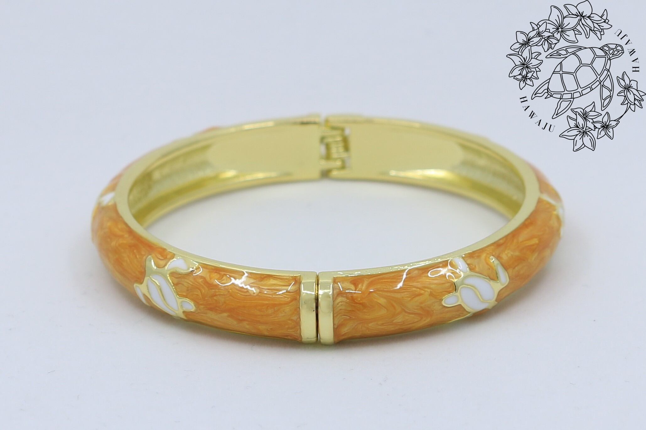 合金素材にゴールドカラーのコーティングを施し、イエローカラーのエナメルの上でホヌが華やかに映えます。
