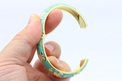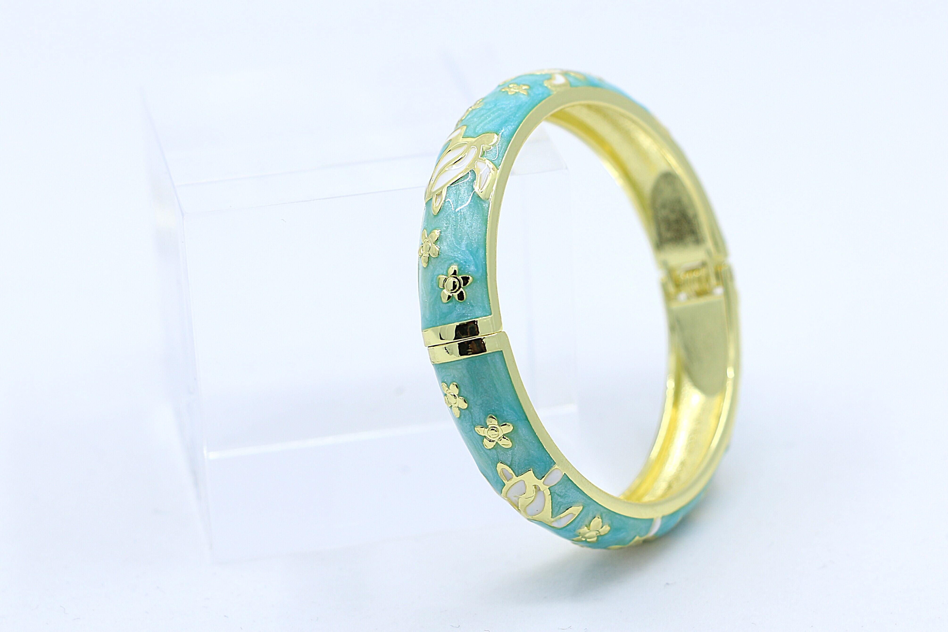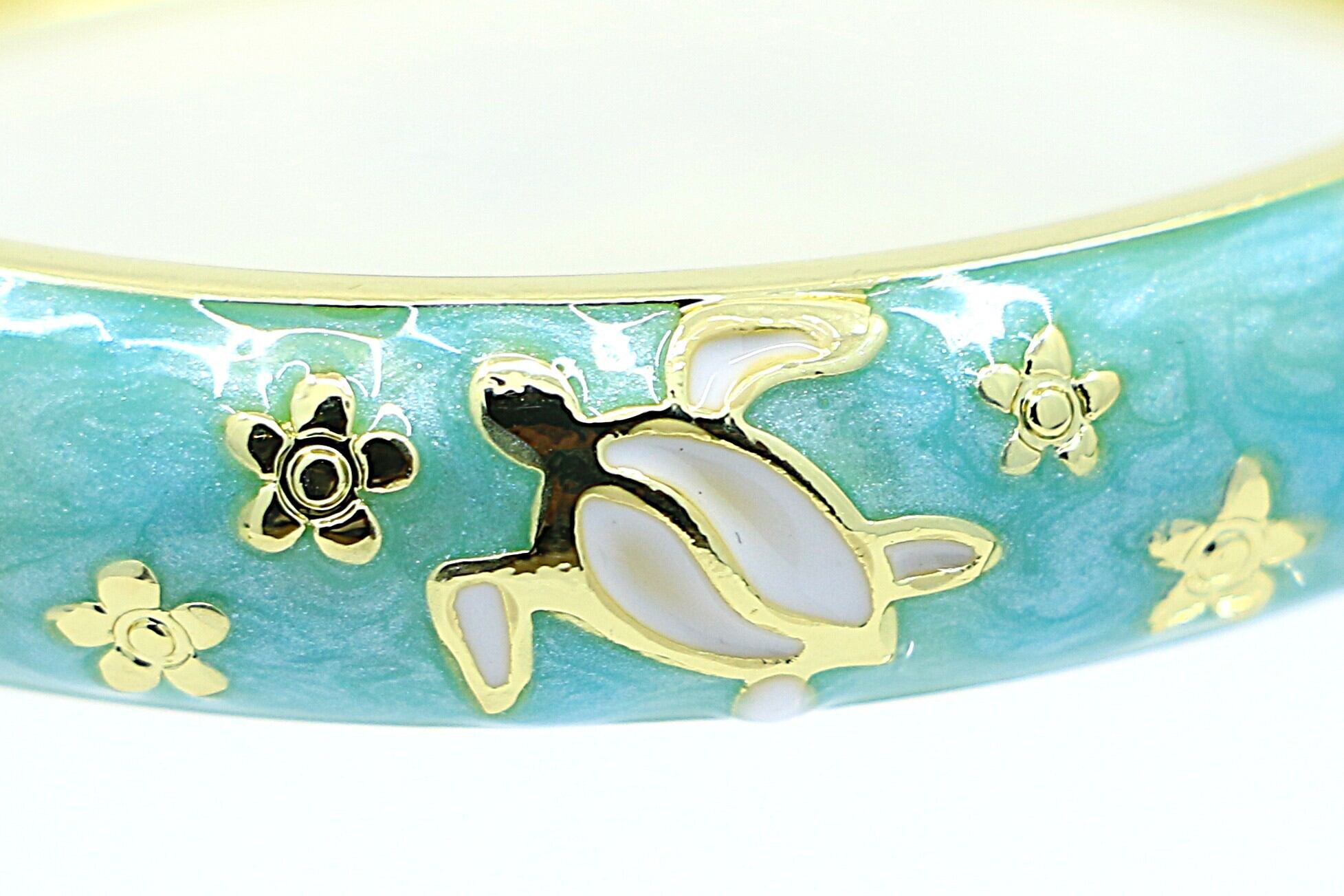 合金素材にゴールドカラーのコーティングを施し、アクアカラーのエナメルの上でホヌが爽やかに映えます。