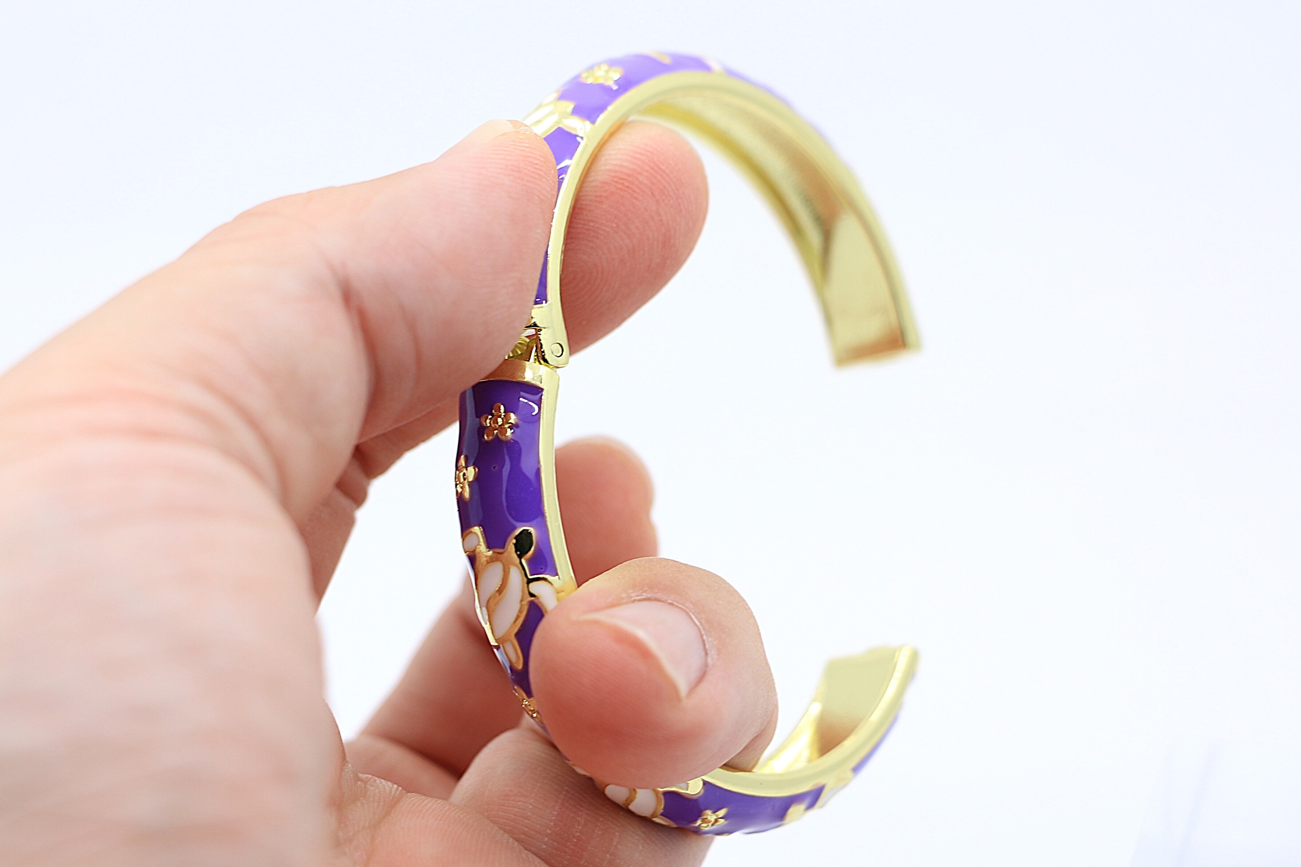 ゴールドカラーとパープルエナメルの組み合わせが、上品さと可愛らしさを両立させたデザインです。
