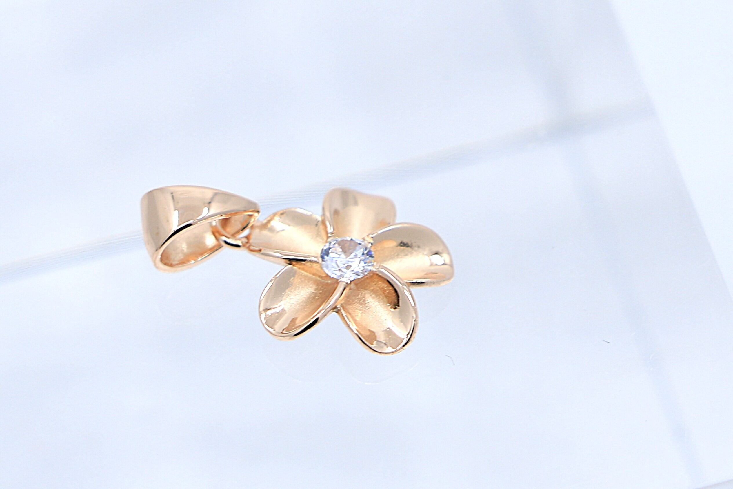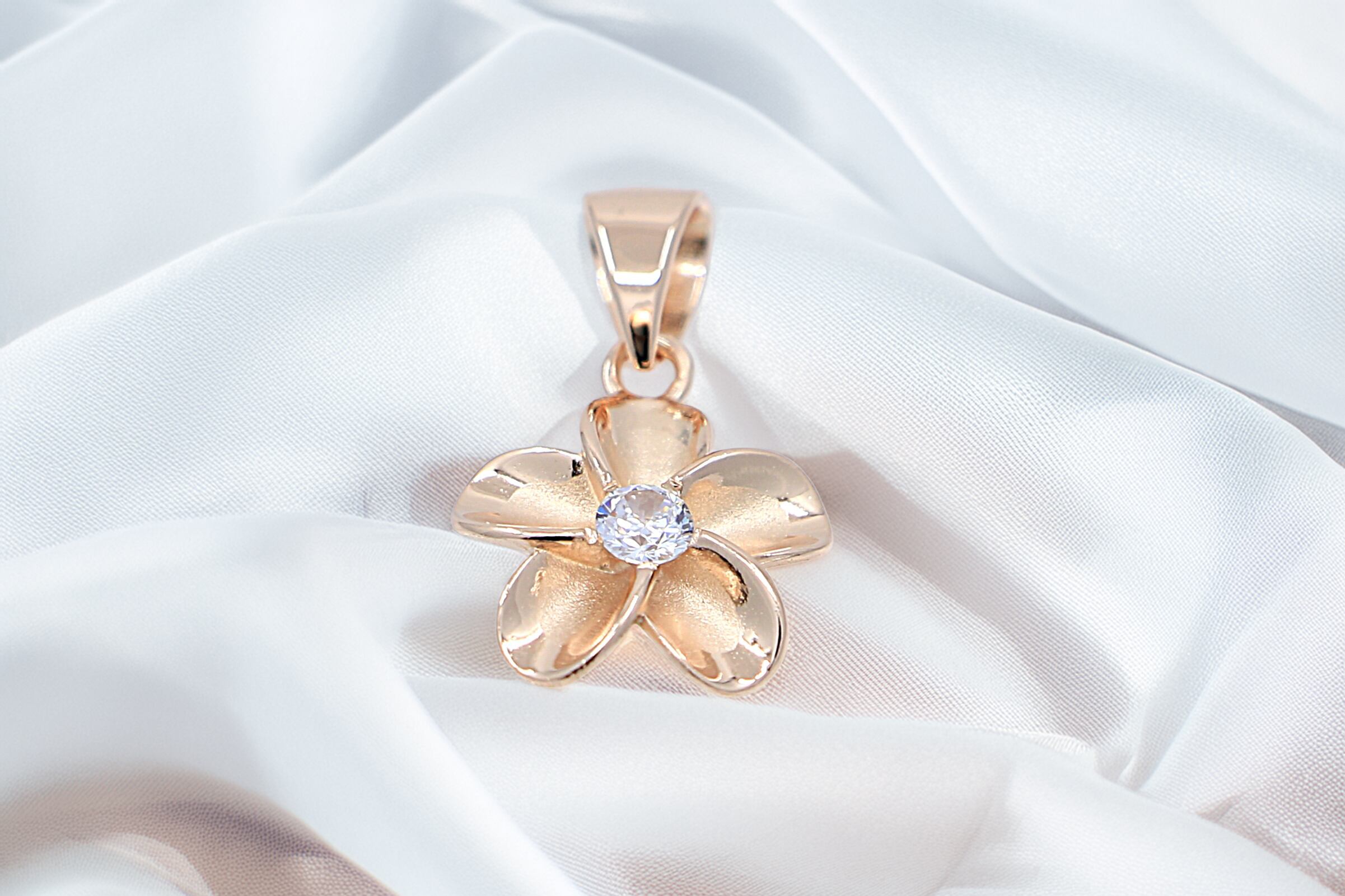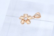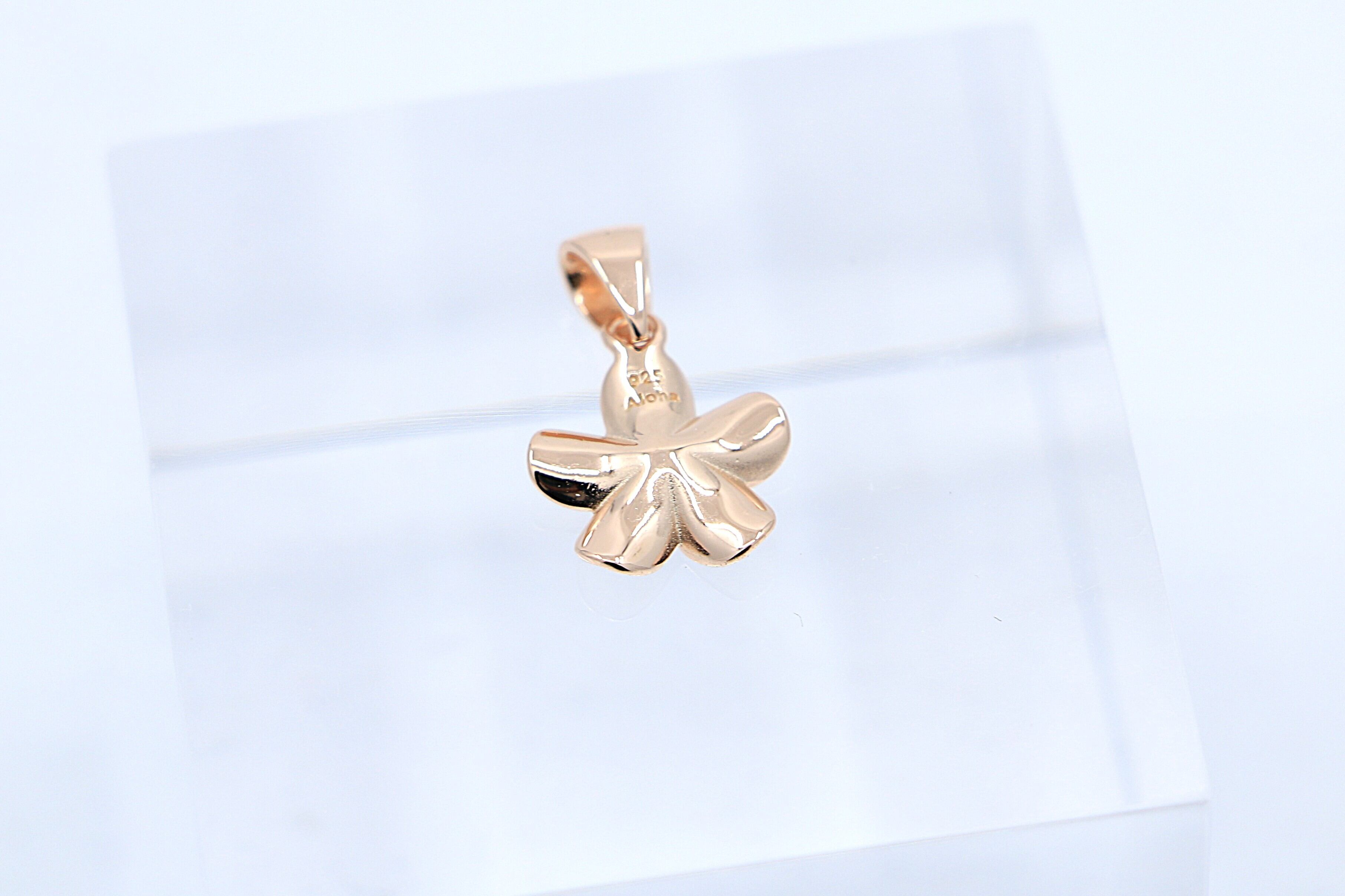 透明感あふれるCZがプルメリアの中央で輝き、ピンクゴールドカラーの柔らかく温かい光沢が胸元をフェミニンに彩ります。
