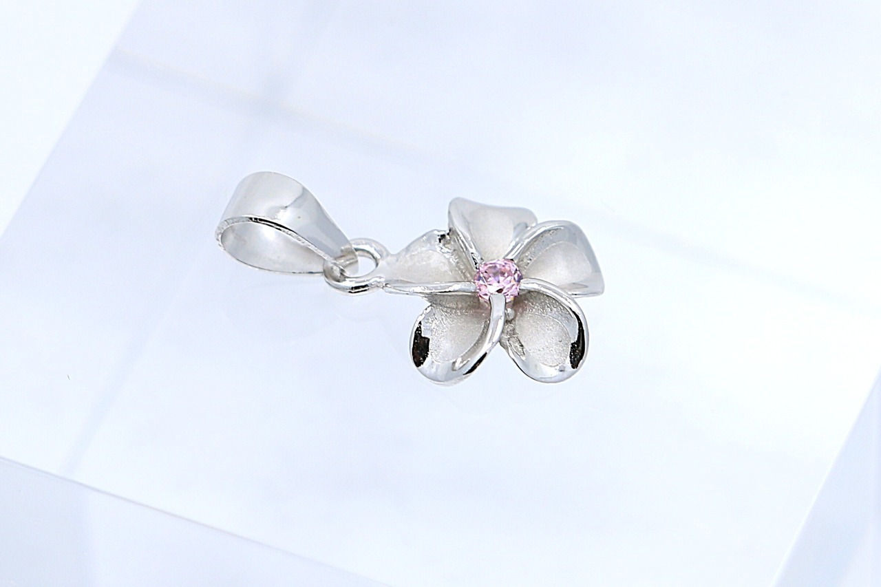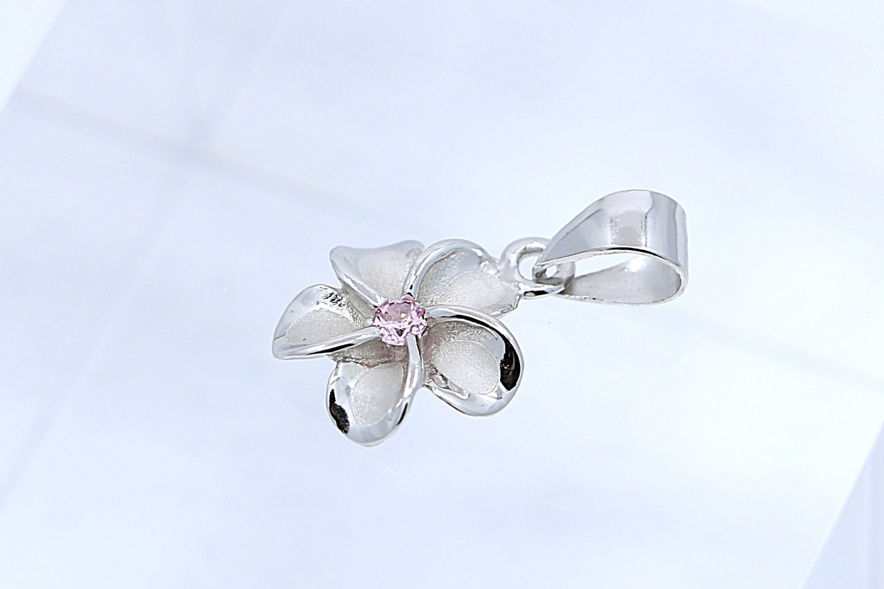 透明感あふれるピンクCZがプルメリアの中央で輝くペンダントトップは、胸元に華やかさと可愛らしさを添えます。