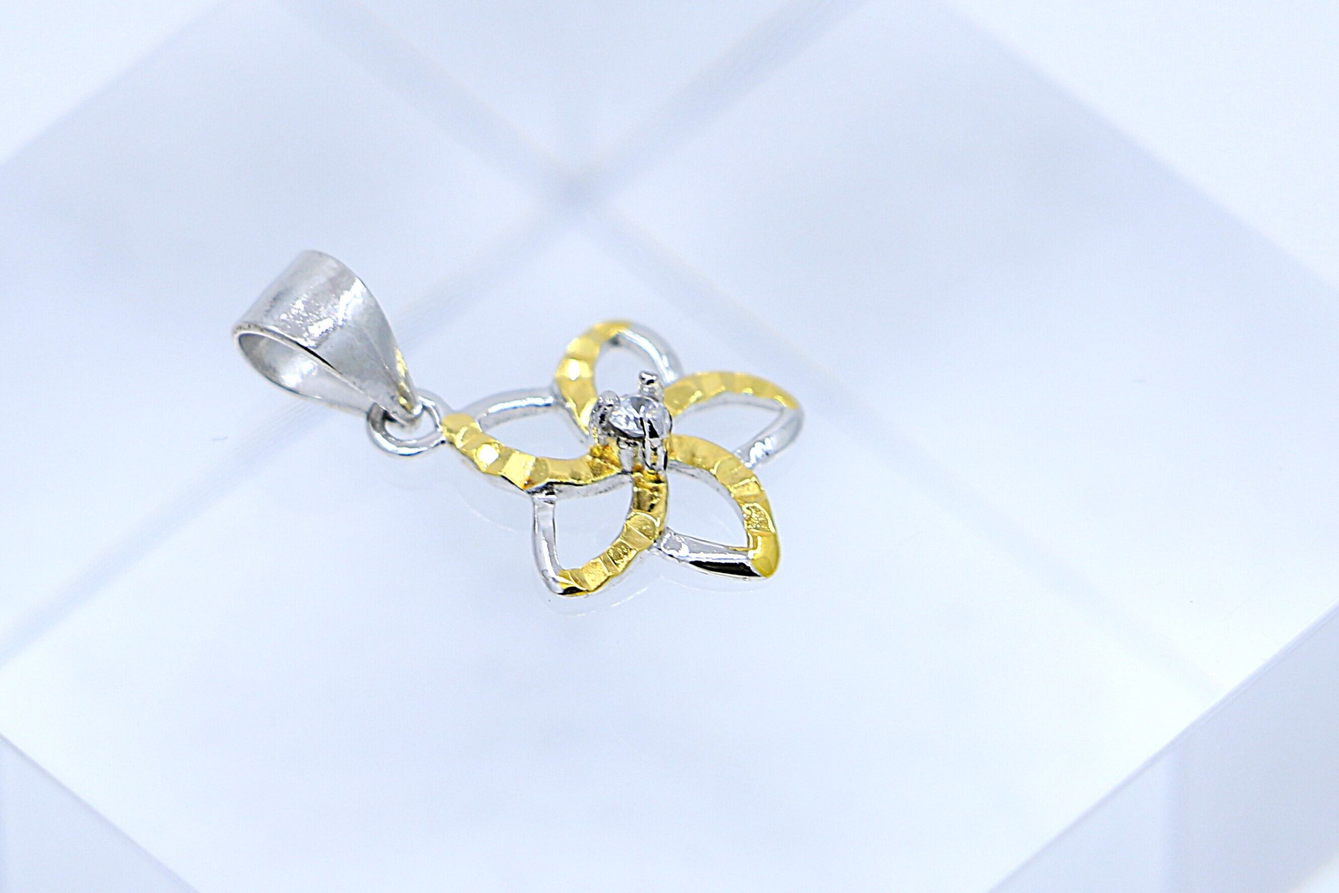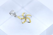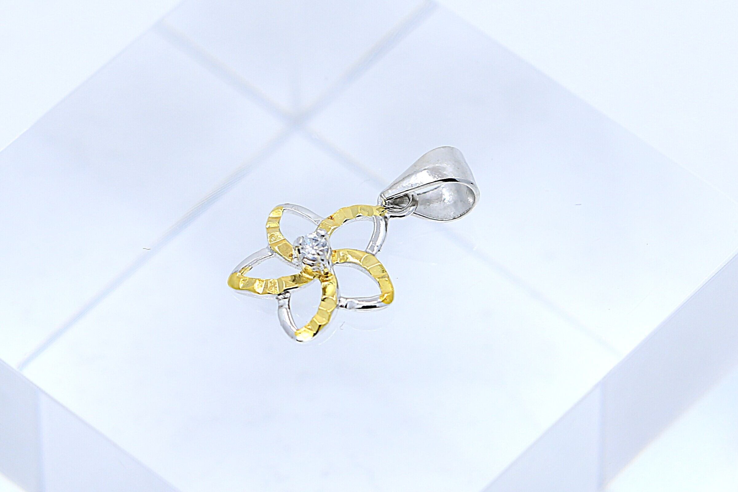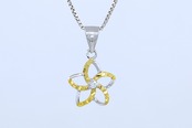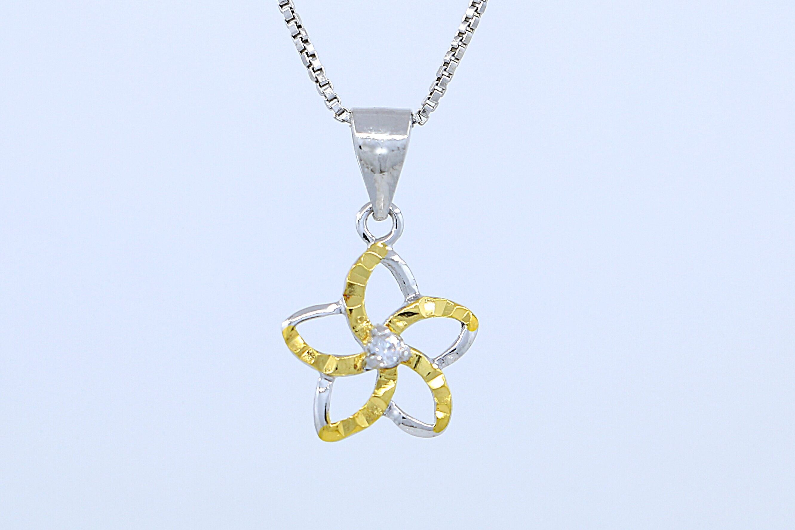 透明感あふれるCZがカットアウトプルメリアの中央で輝き、イエローゴールドとシルバーのコンビカラーが胸元に立体感と華やかさをプラス。