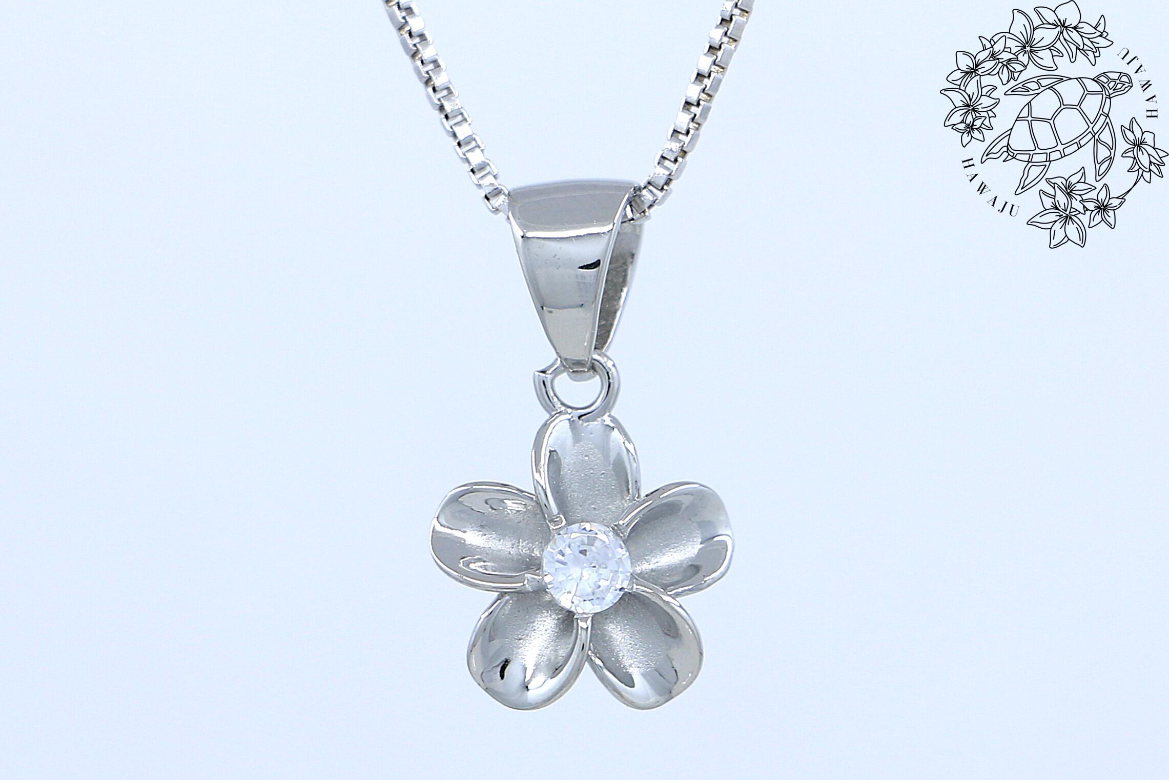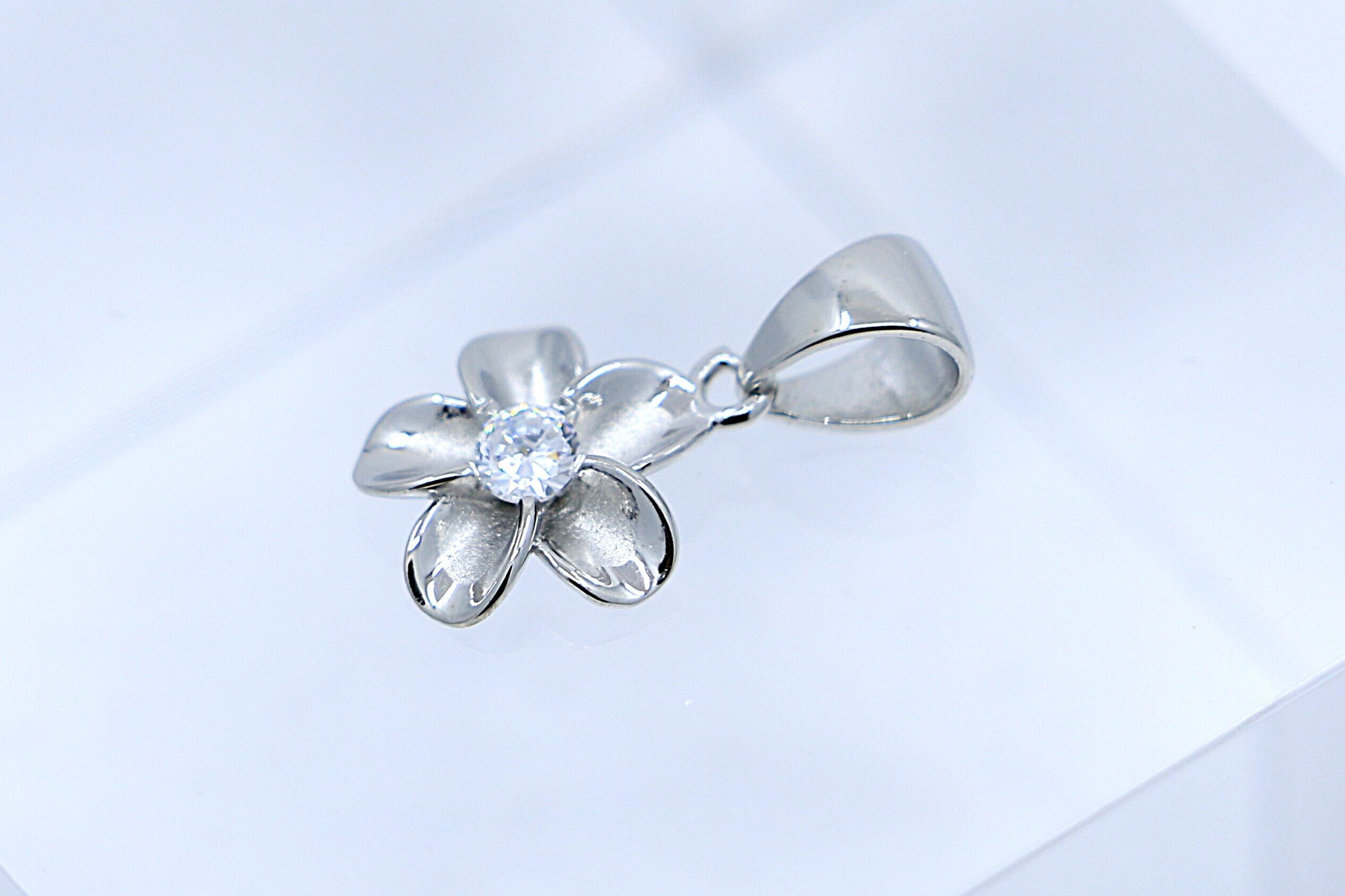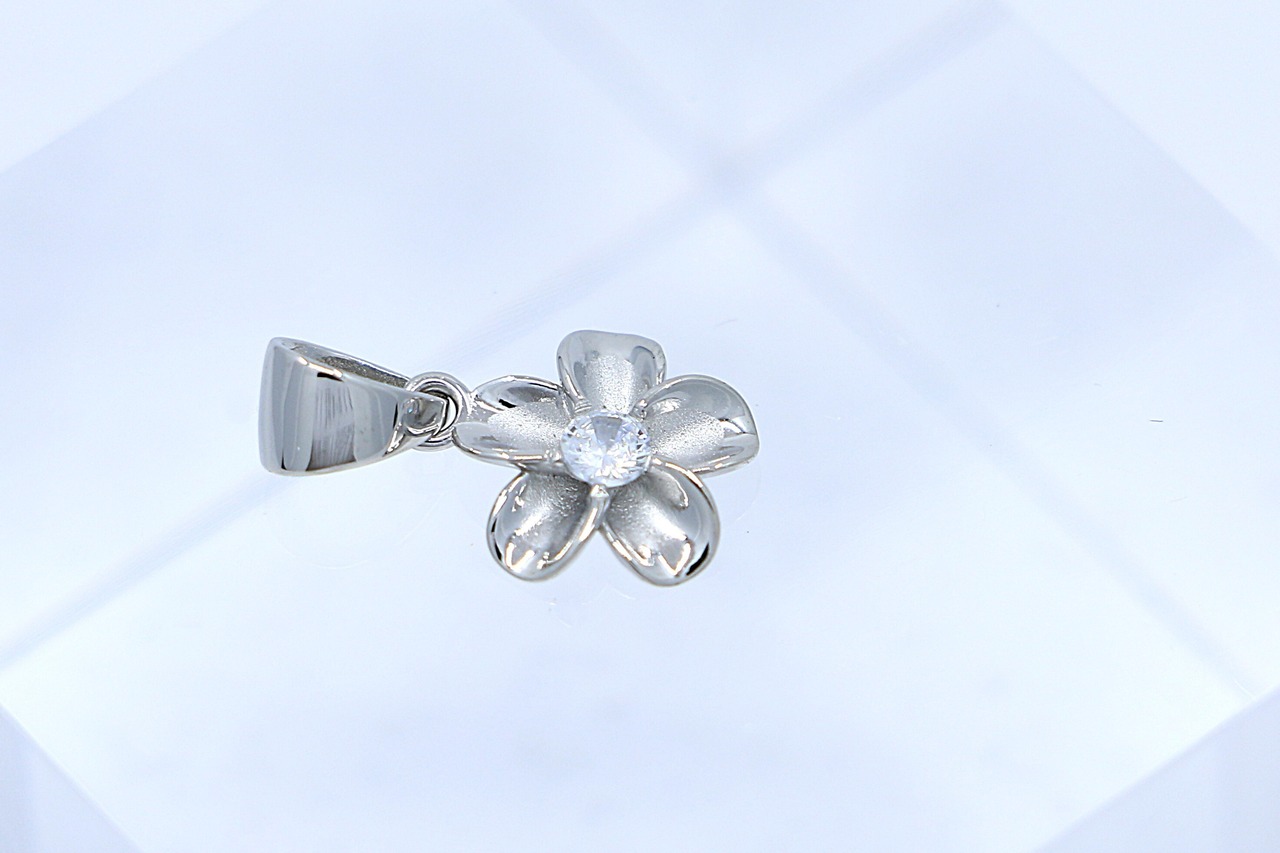 透明感あふれるCZがプルメリアの中央で輝くペンダントトップは、胸元にやさしく華やぎを添えます。