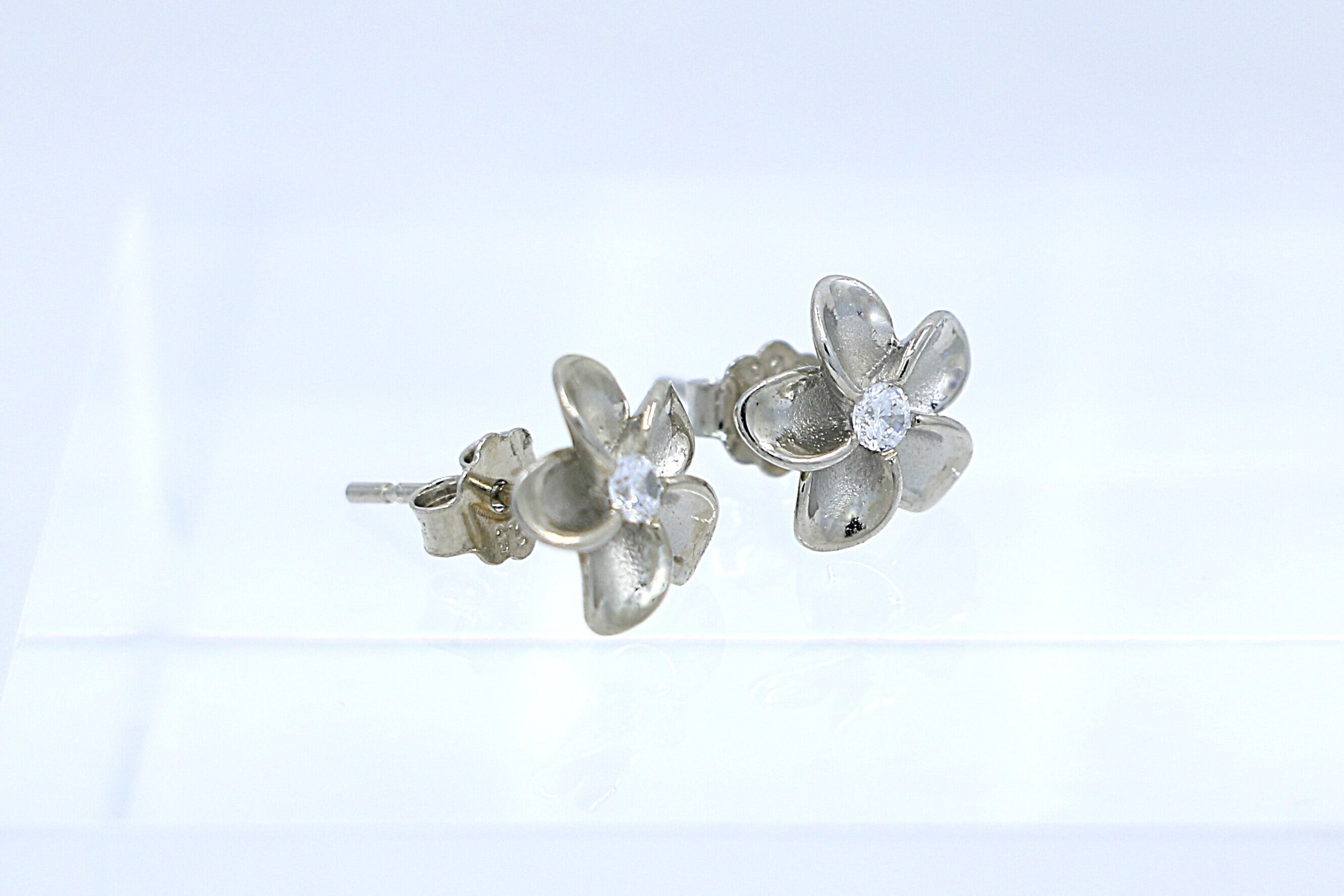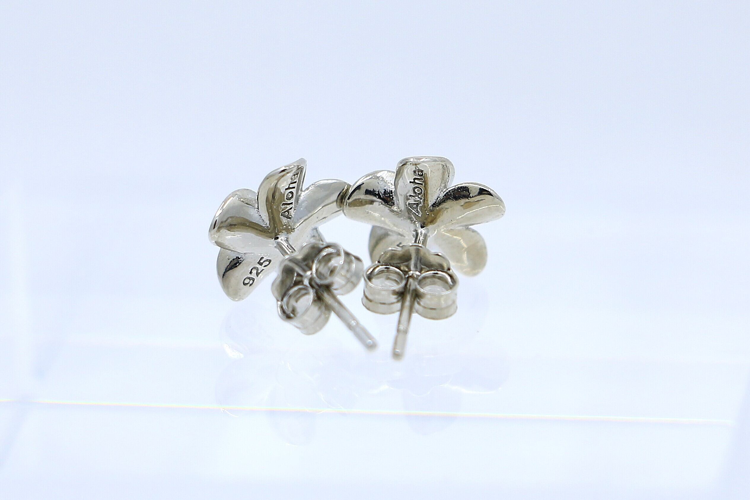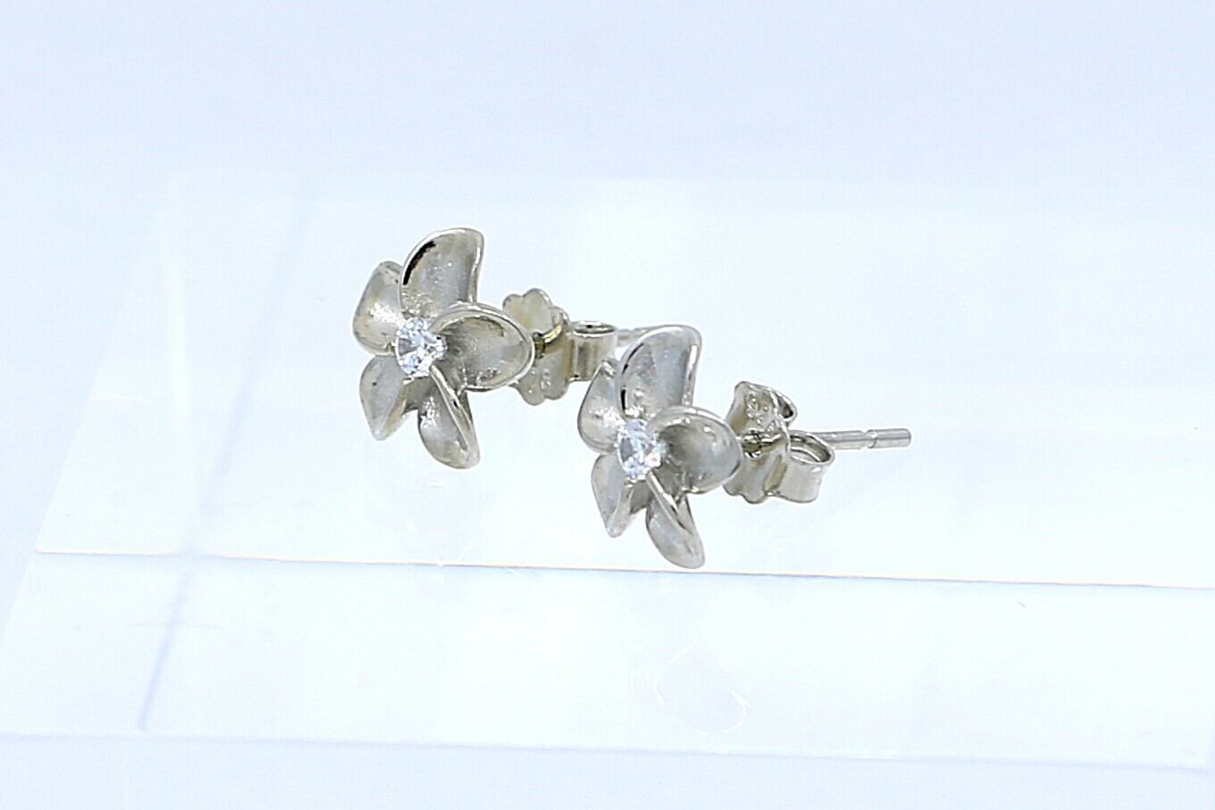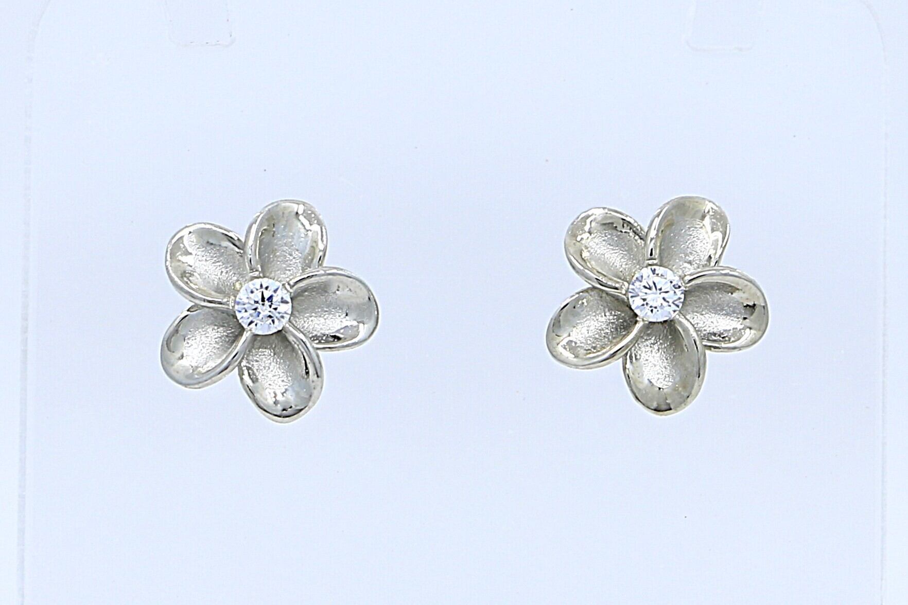 透明感あふれるCZがプルメリアの中央で輝くポストタイプピアスは、耳元にやさしく華やぎを添えます。