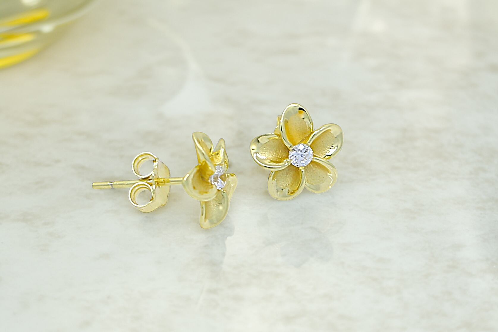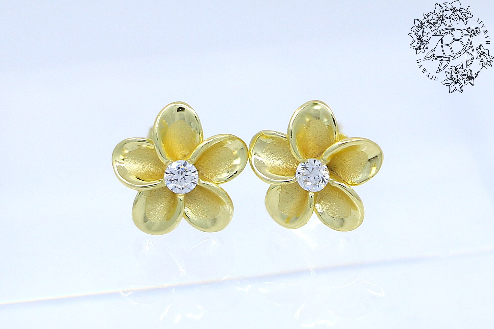 このピアスは、ハワイアンジュエリーを象徴するプルメリアモチーフをあしらった、上品で華やかなデザインのポストタイプピアスです。