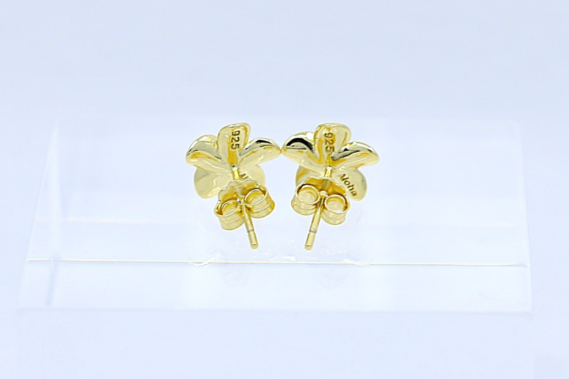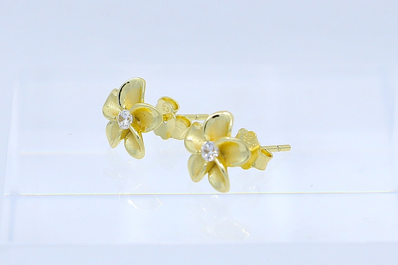 透明感あふれるCZがプルメリアの中央で輝き、イエローゴールドカラーのモチーフが耳元に温かみと華やかさを添えます。