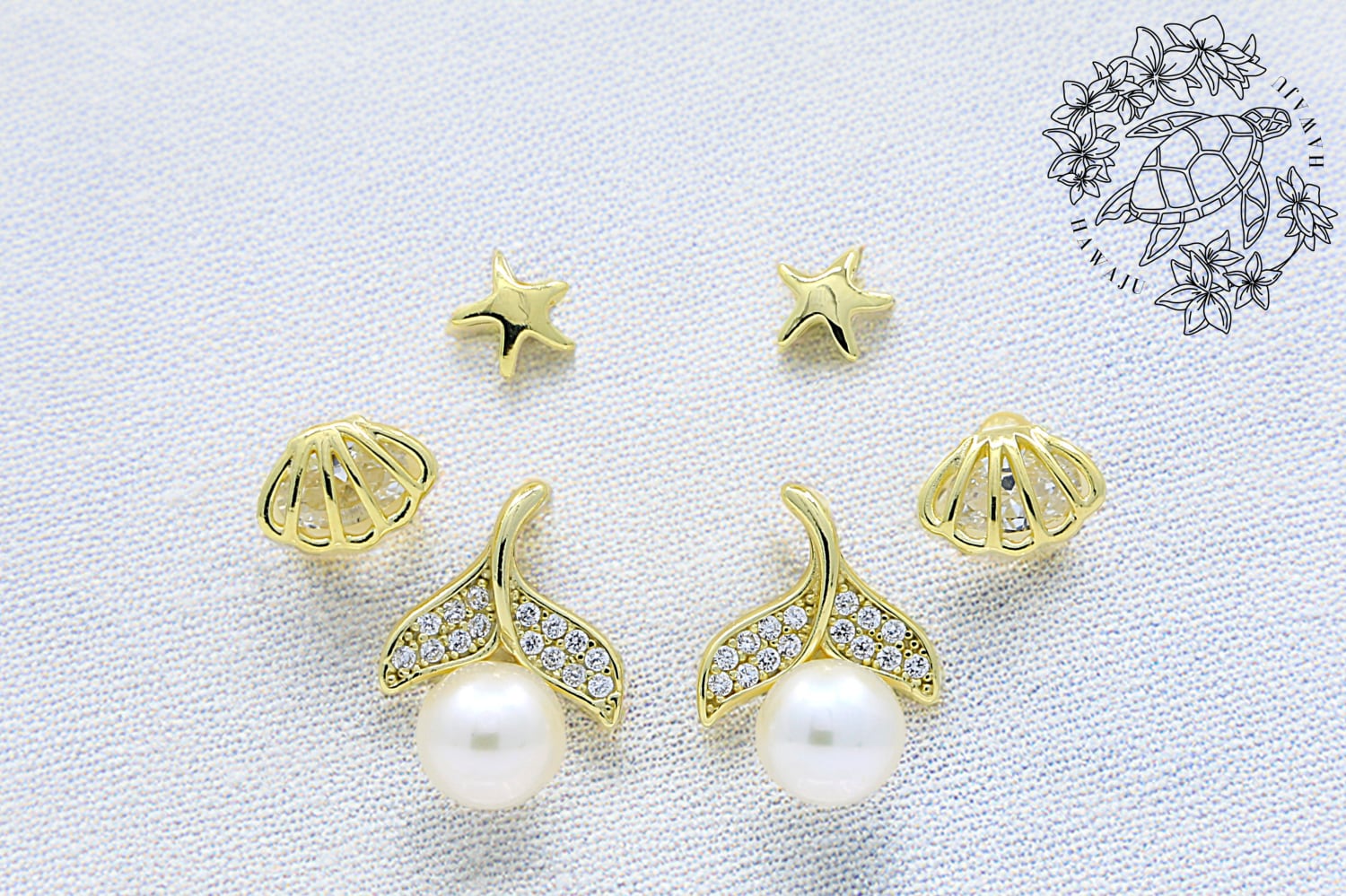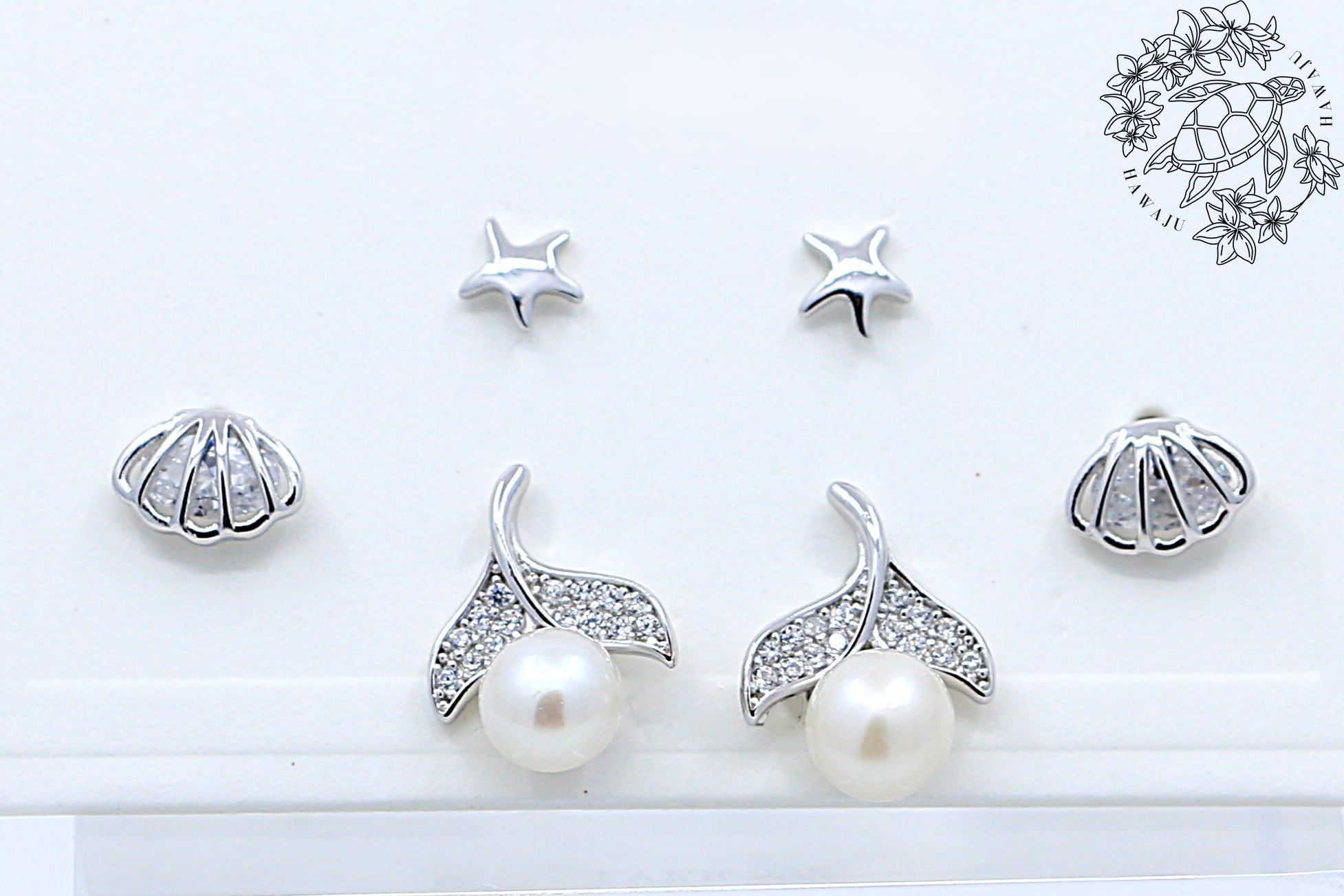 愛らしい海のモチーフをデザインしたこのピアスセットは、シルバーの輝きが美しいハワイアンジュエリーです。高品質なSterling Silver(925)をベースに、それぞれのモチーフに細やかな装飾を施した上品なデザイン。耳元で身に着けるだけで、華やかさと遊び心を演出します。